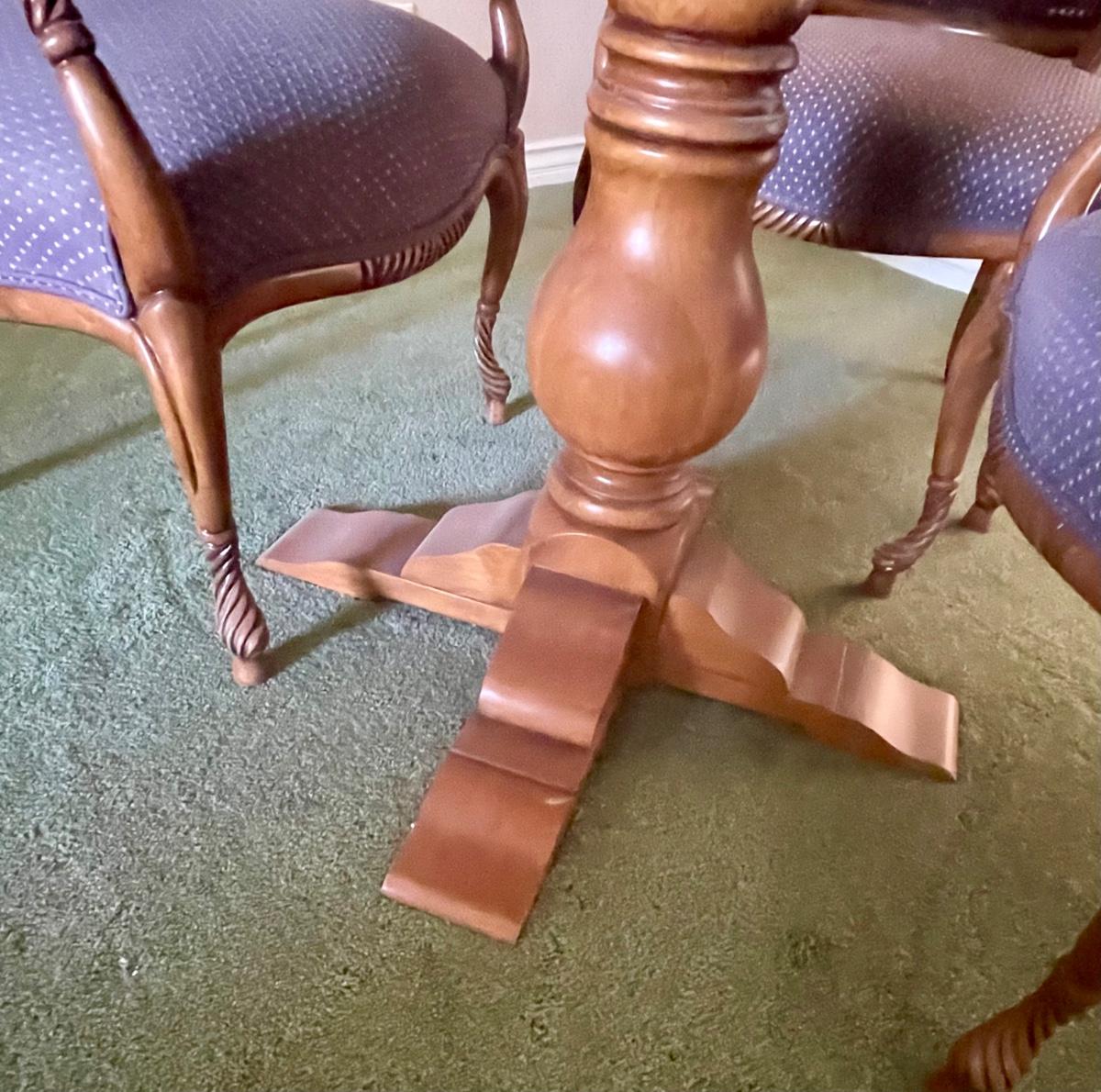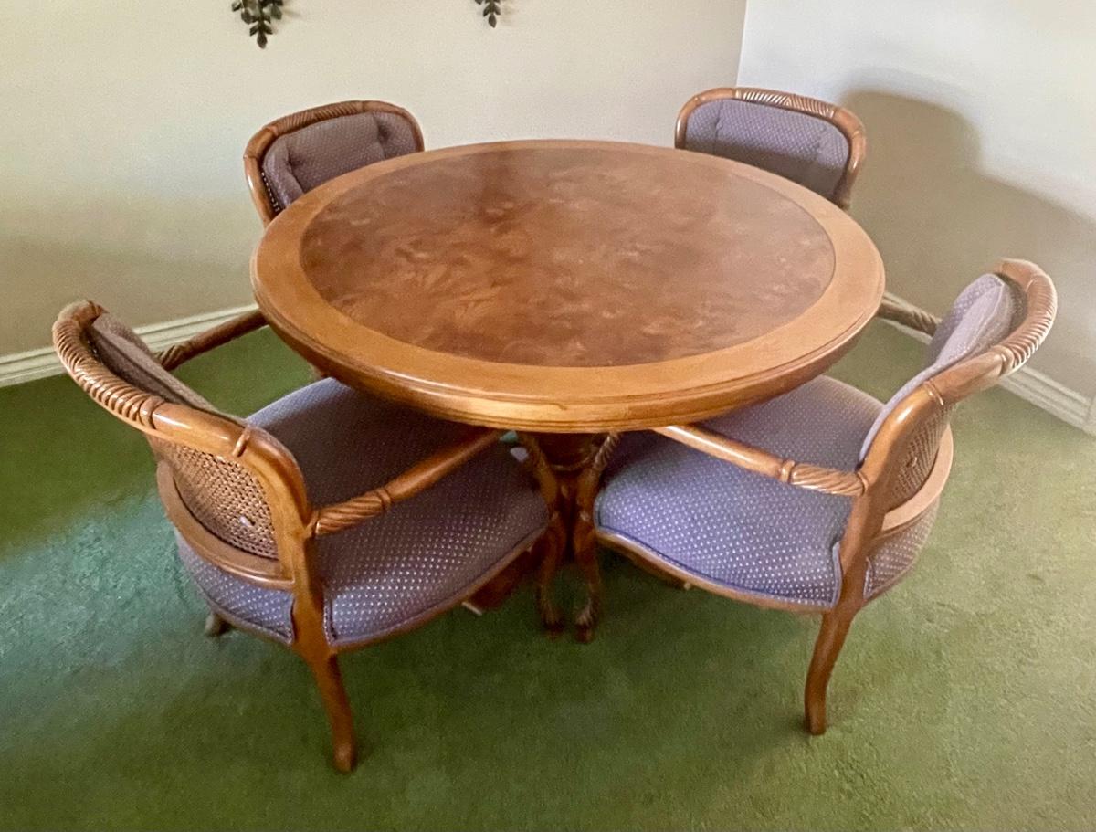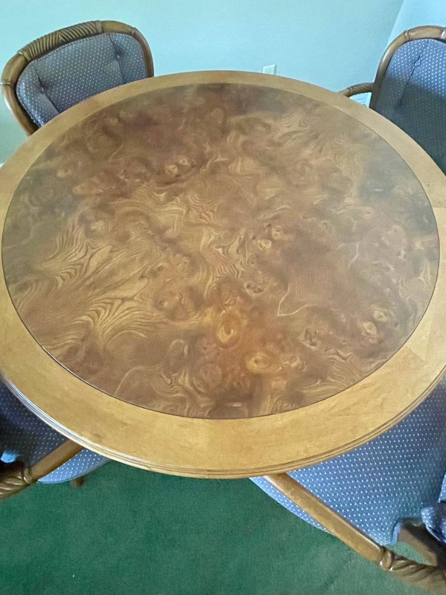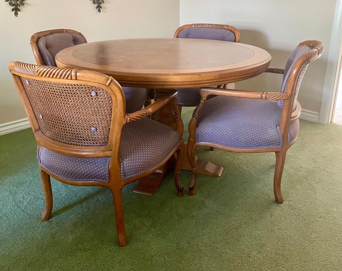 Table is one piece, approx. 48" across and 29" high. Chairs have upholstered seats and backs. Great condition.