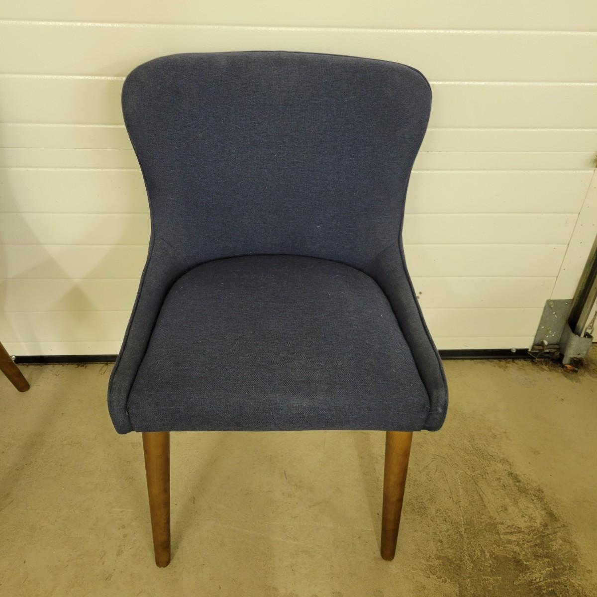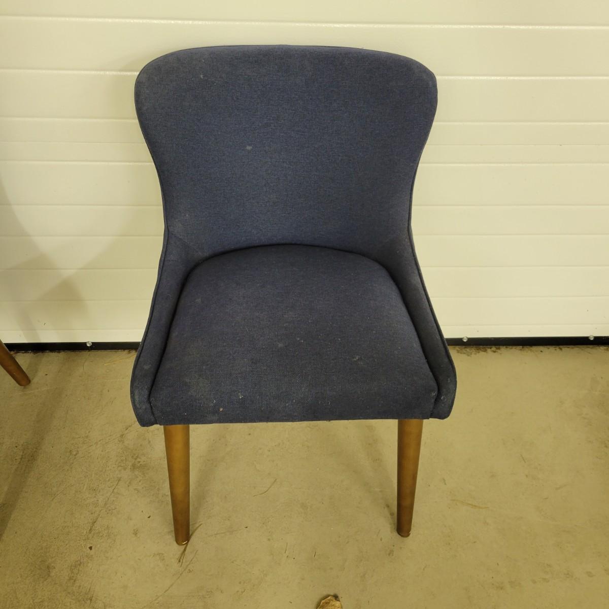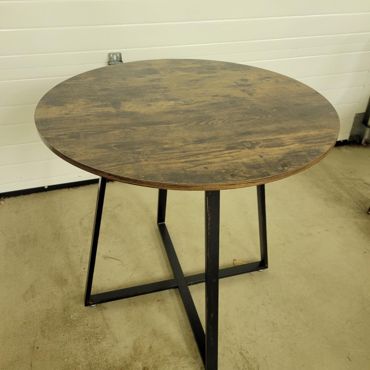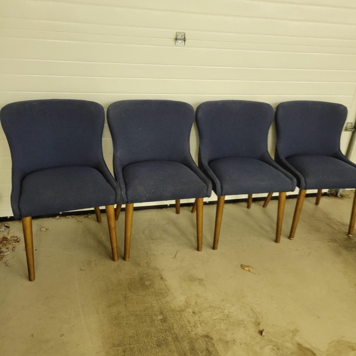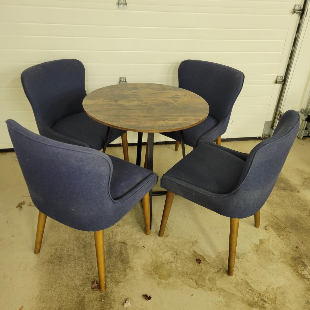 A round table that has an engineered top with a faux wood finish and a metal base that measures approximately 31"D x 30"H. Also included are four chairs upholstered in a navy blue fabric with wooden legs. The chairs measure approximately 22" x 22" x 34"H. The chairs appear to be dirty and need cleaning. The seat height is 20”. Local pickup only