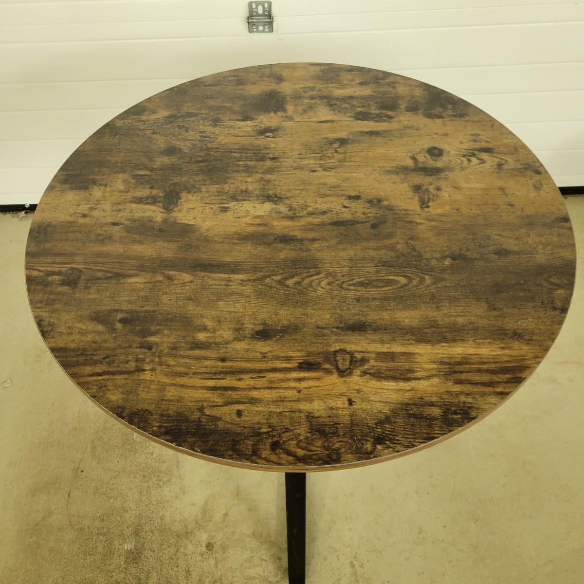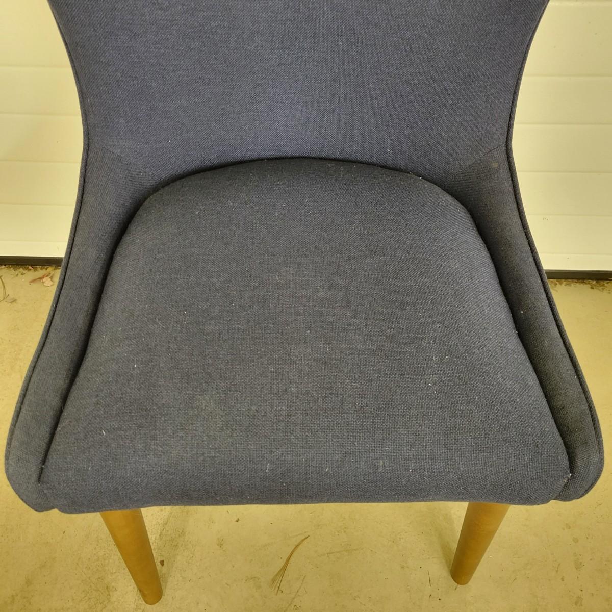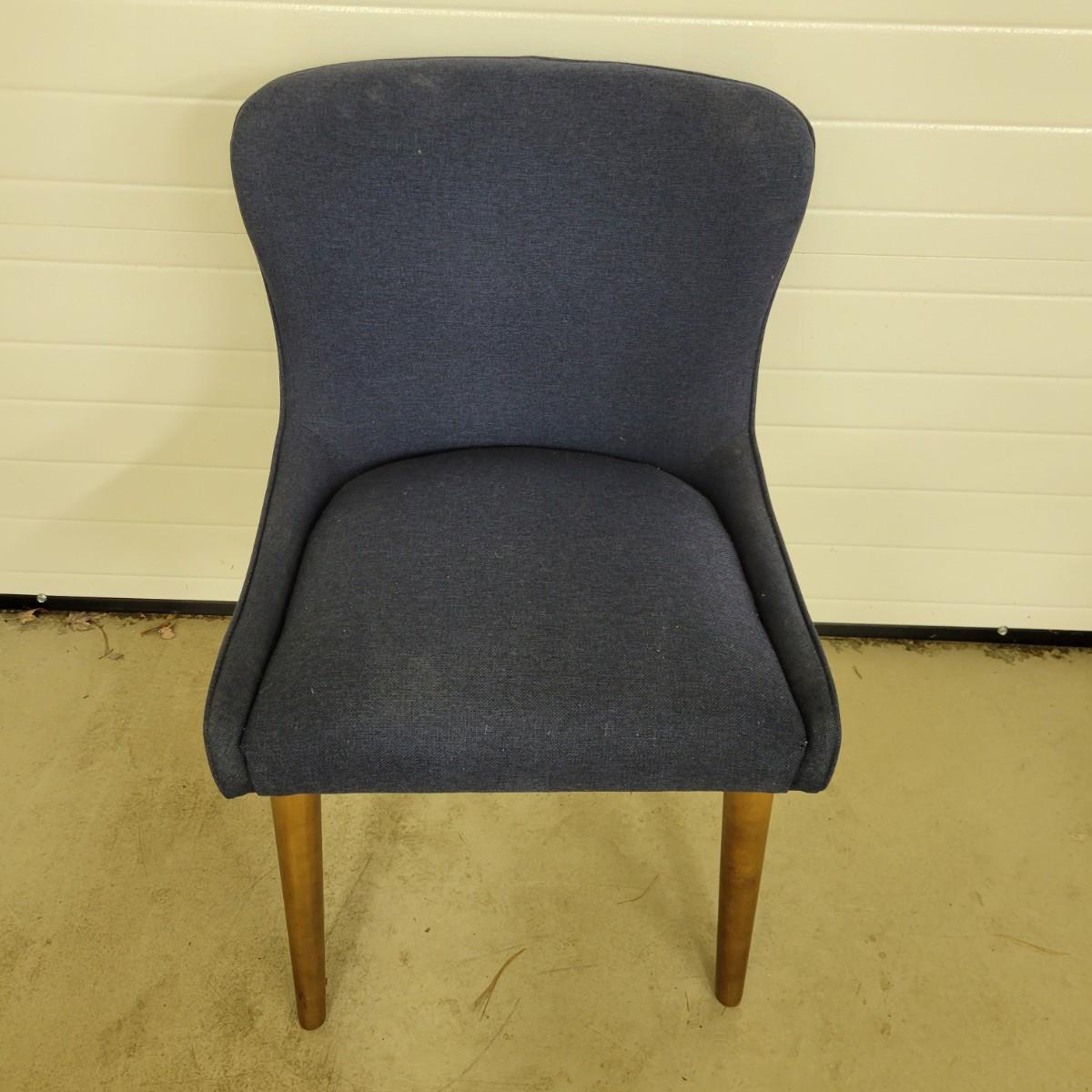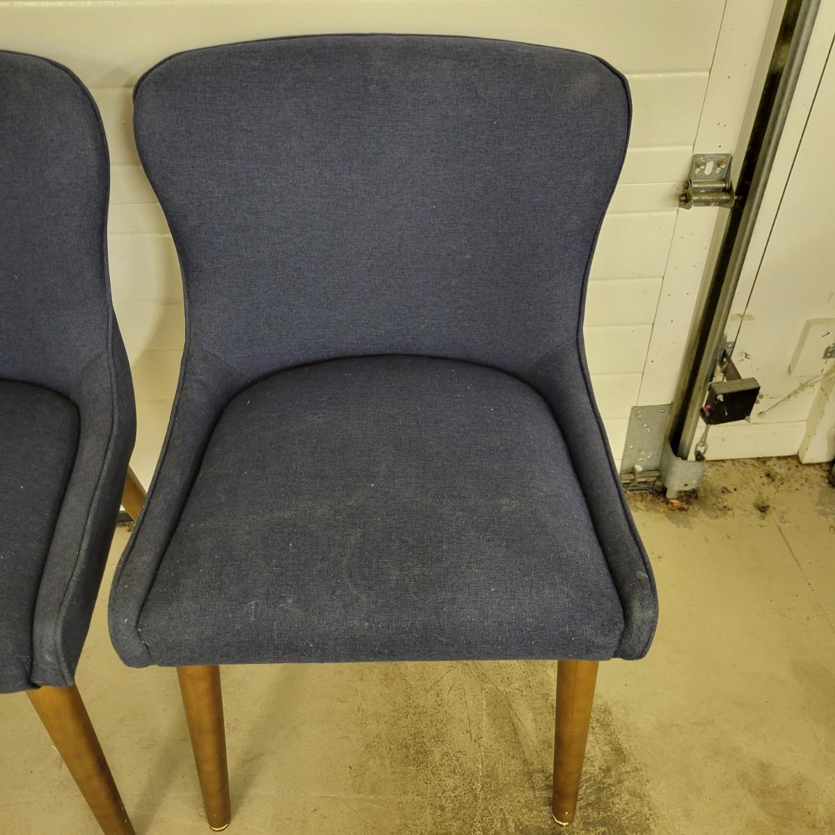 A round table that has an engineered top with a faux wood finish and a metal base that measures approximately 31"D x 30"H. Also included are four chairs upholstered in a navy blue fabric with wooden legs. The chairs measure approximately 22" x 22" x 34"H. The chairs appear to be dirty and need cleaning. The seat height is 20”. Local pickup only