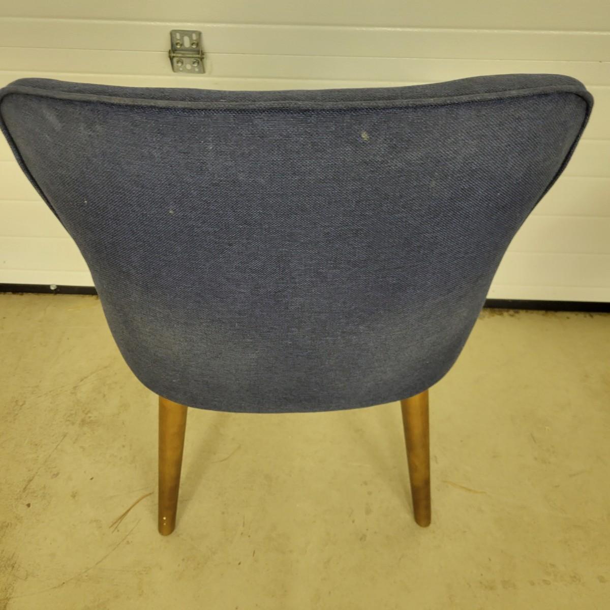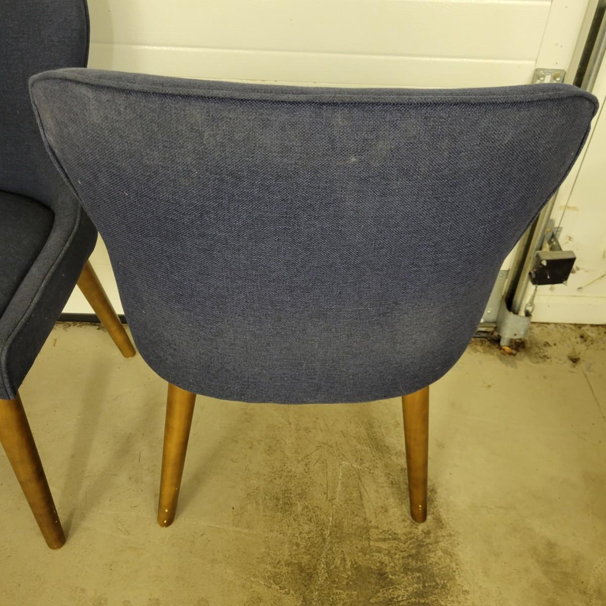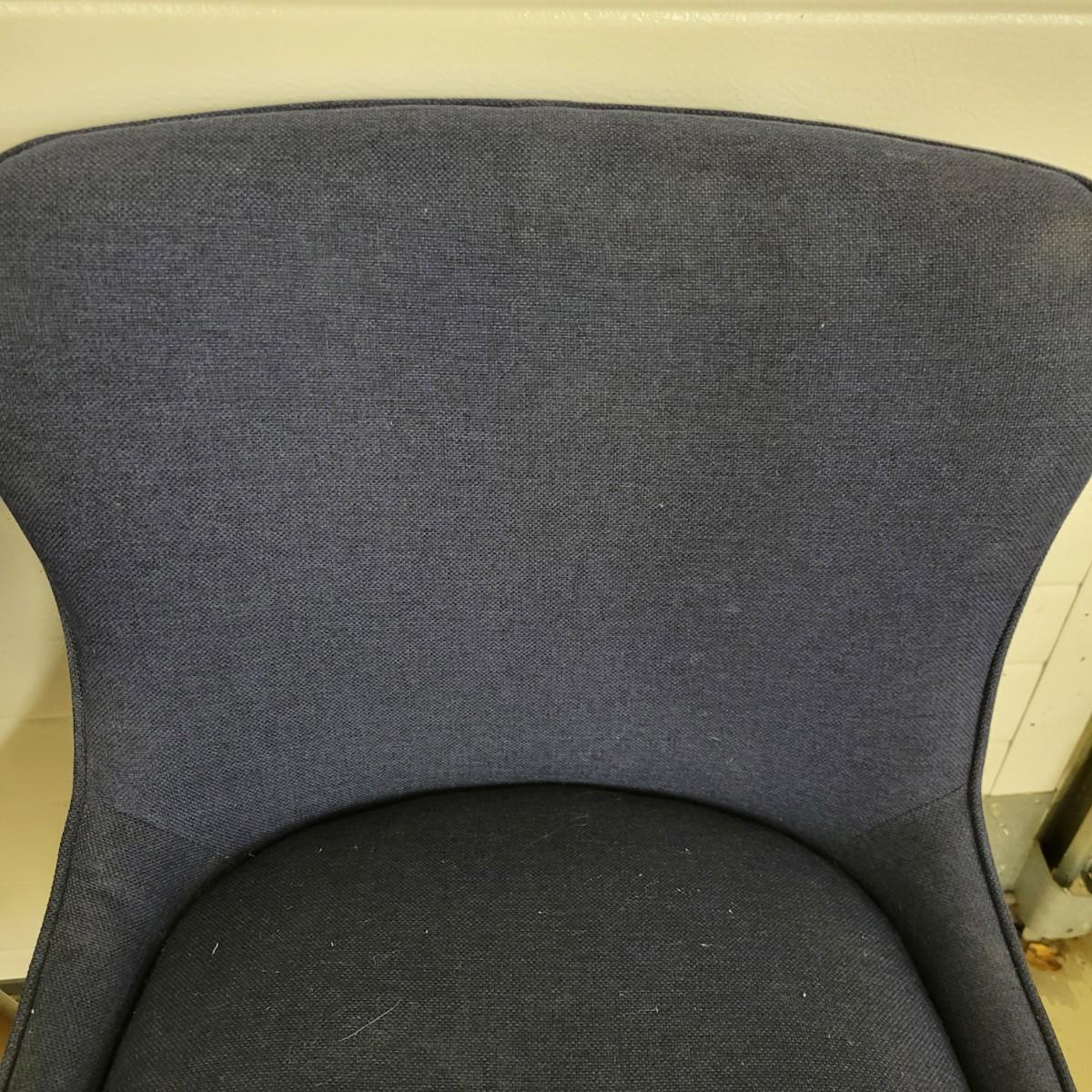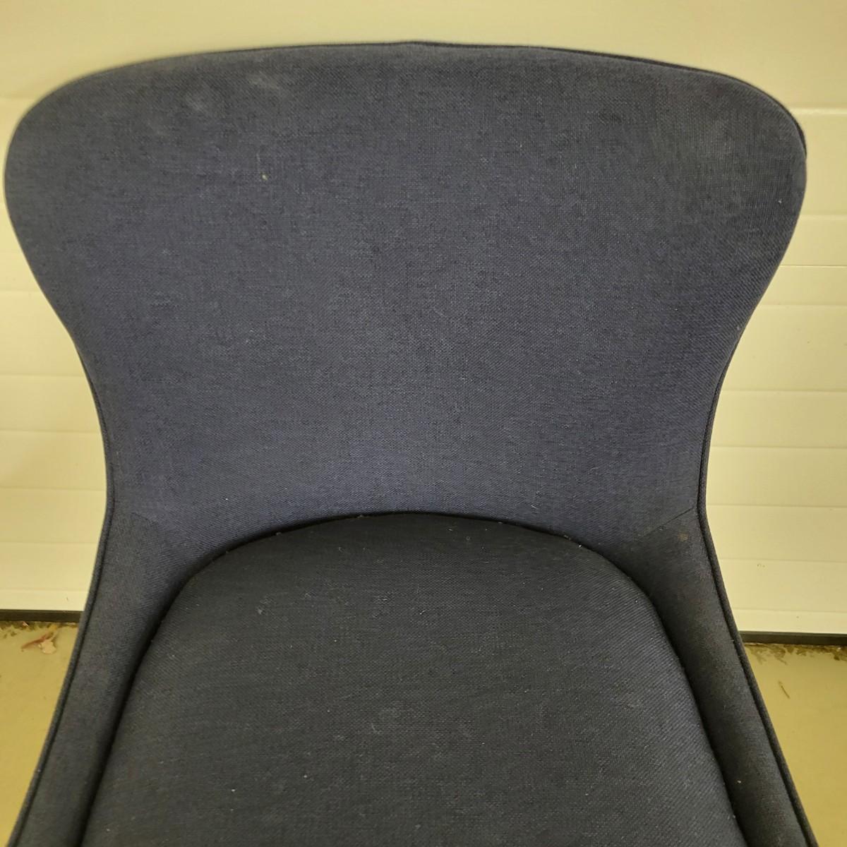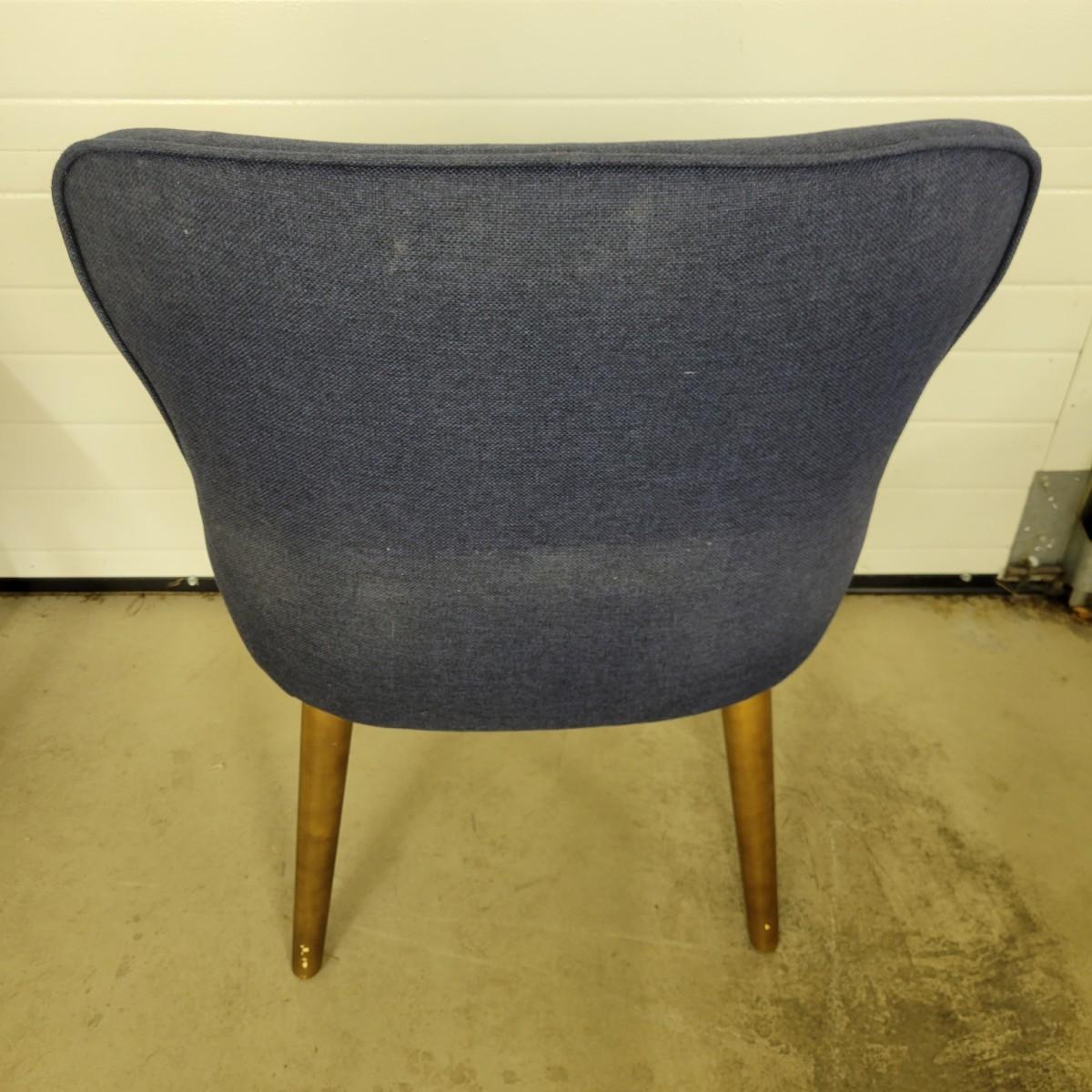 A round table that has an engineered top with a faux wood finish and a metal base that measures approximately 31"D x 30"H. Also included are four chairs upholstered in a navy blue fabric with wooden legs. The chairs measure approximately 22" x 22" x 34"H. The chairs appear to be dirty and need cleaning. The seat height is 20”. Local pickup only