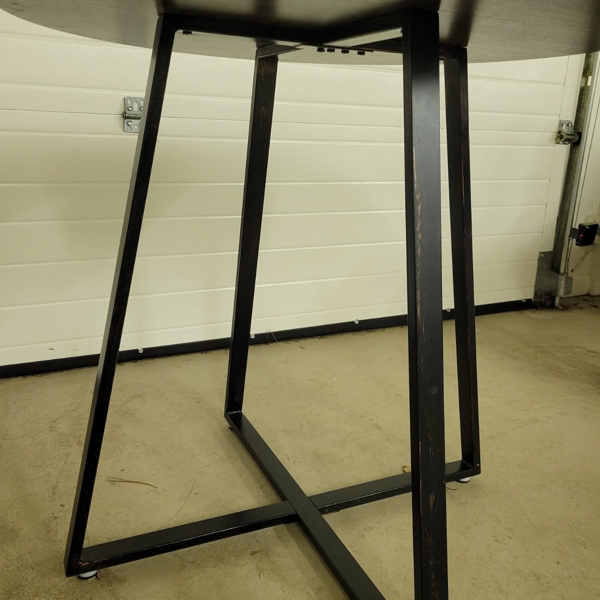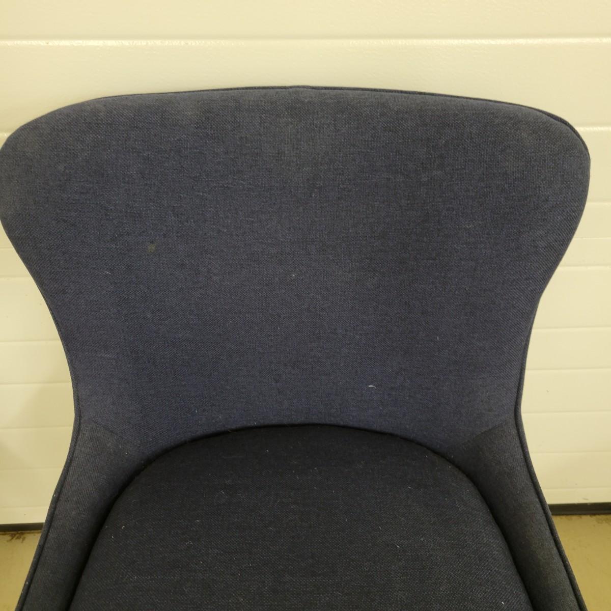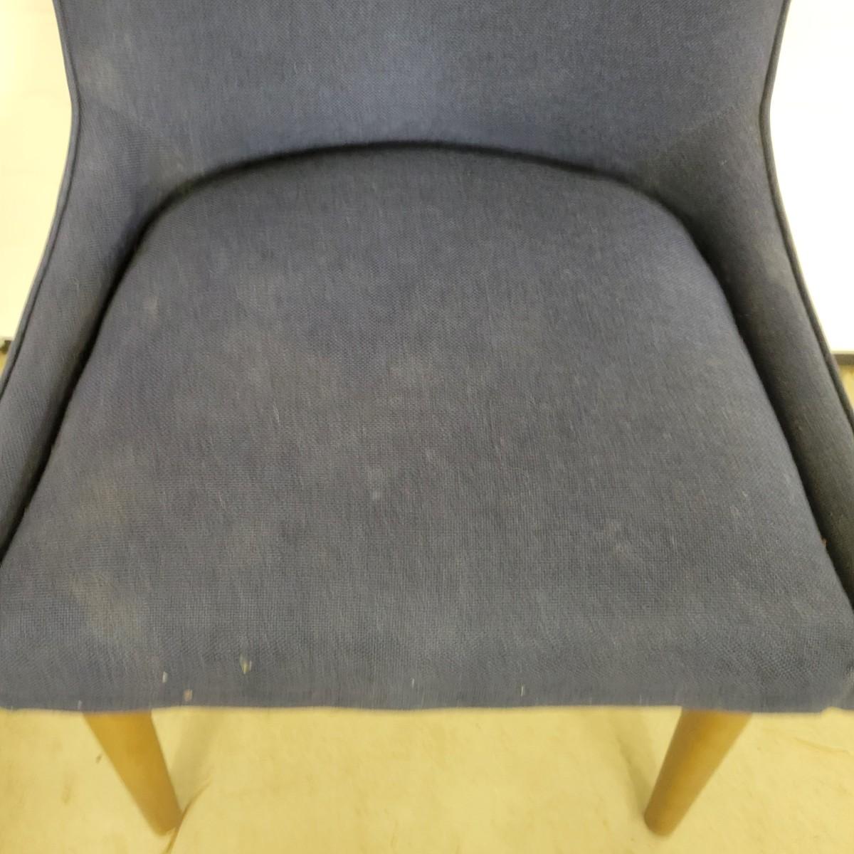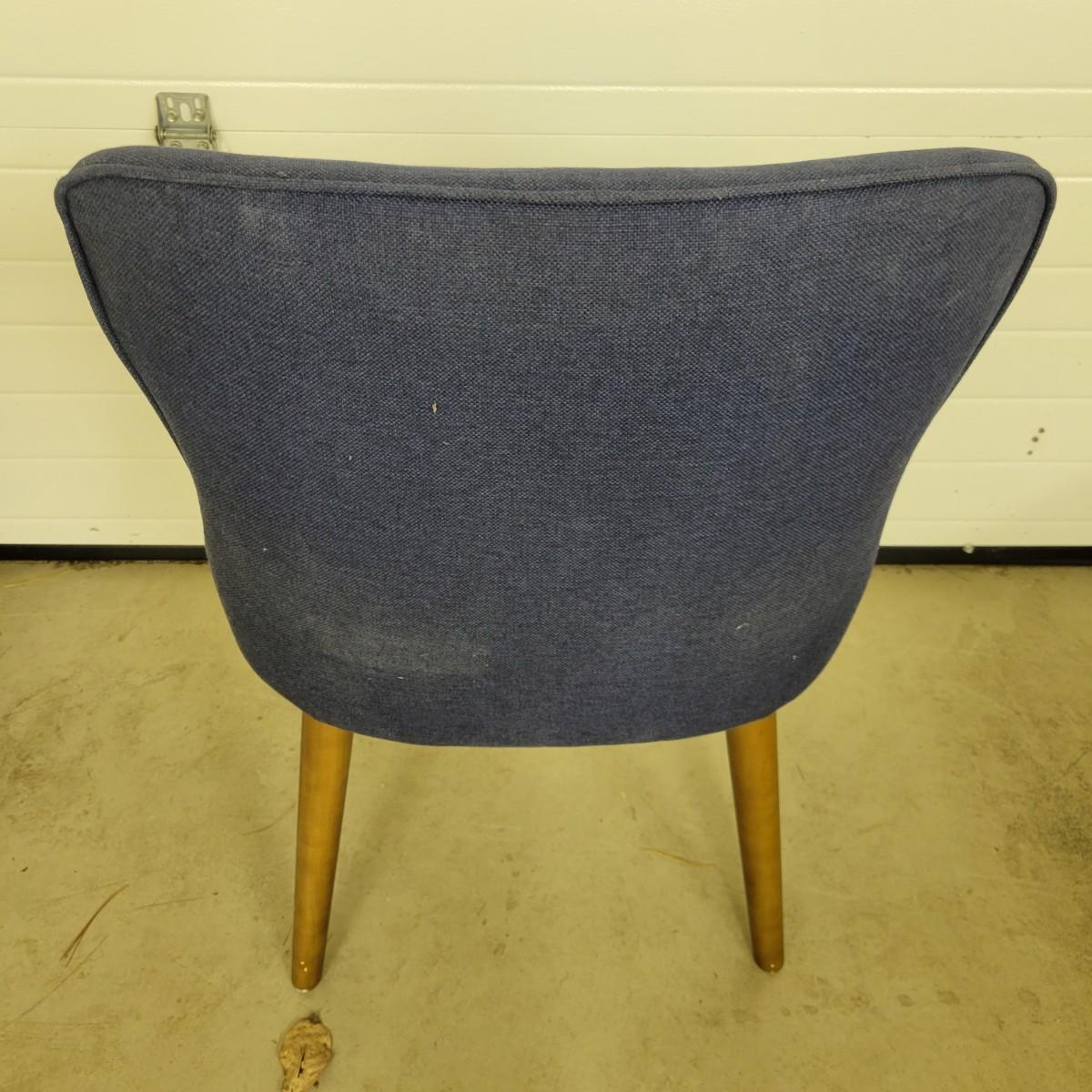 A round table that has an engineered top with a faux wood finish and a metal base that measures approximately 31"D x 30"H. Also included are four chairs upholstered in a navy blue fabric with wooden legs. The chairs measure approximately 22" x 22" x 34"H. The chairs appear to be dirty and need cleaning. The seat height is 20”. Local pickup only