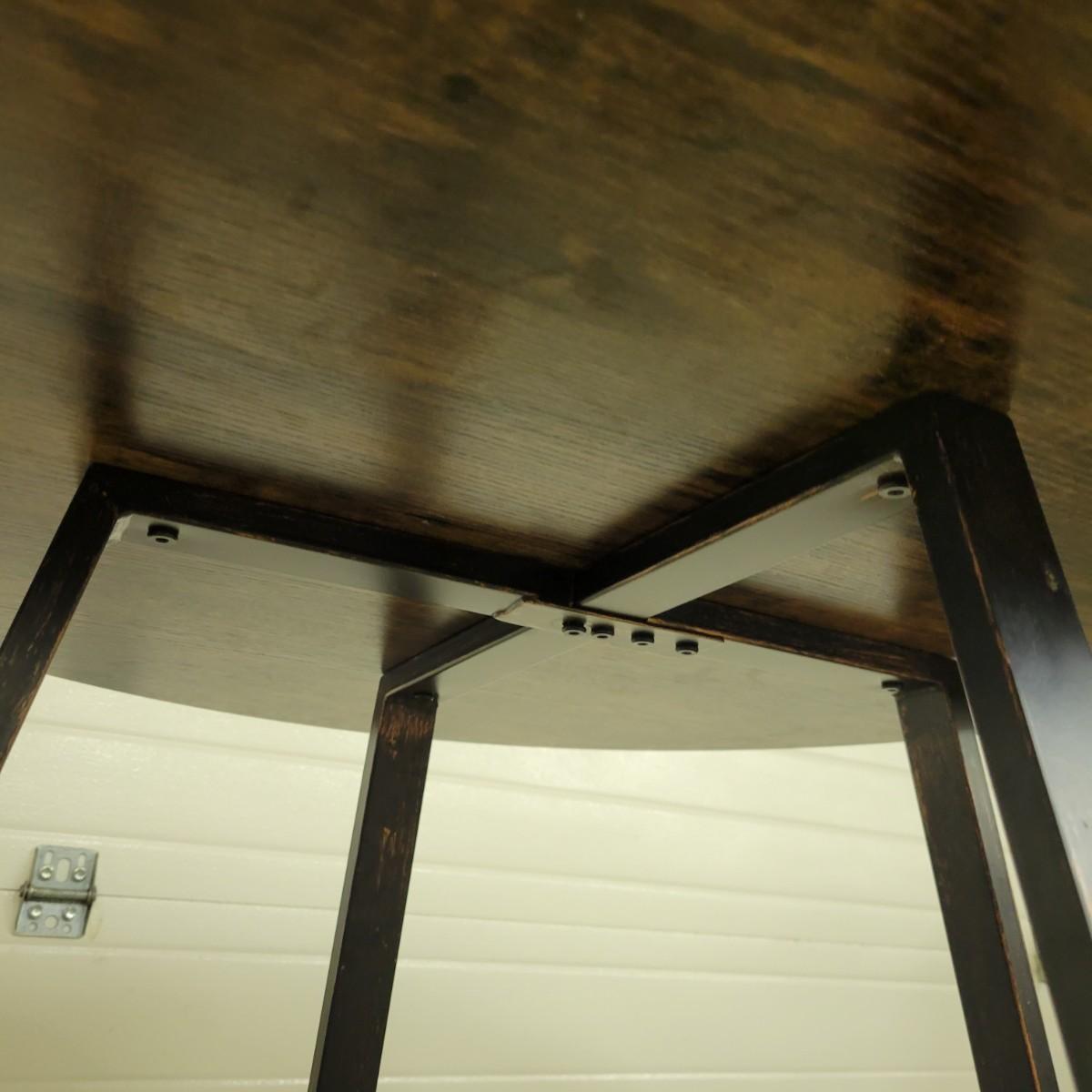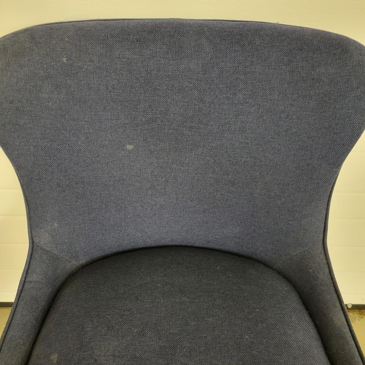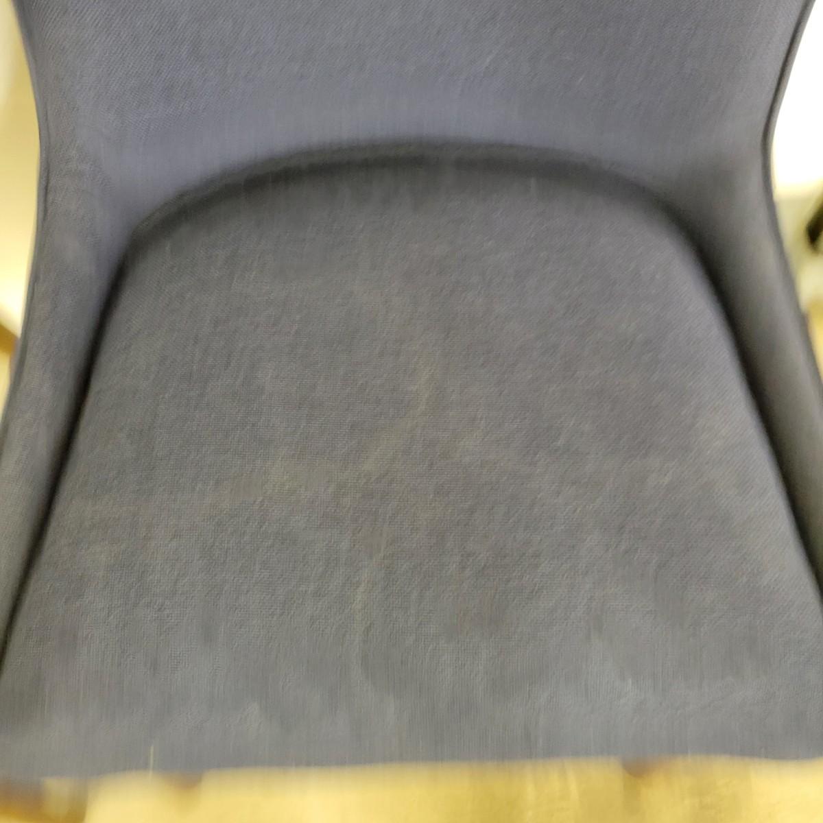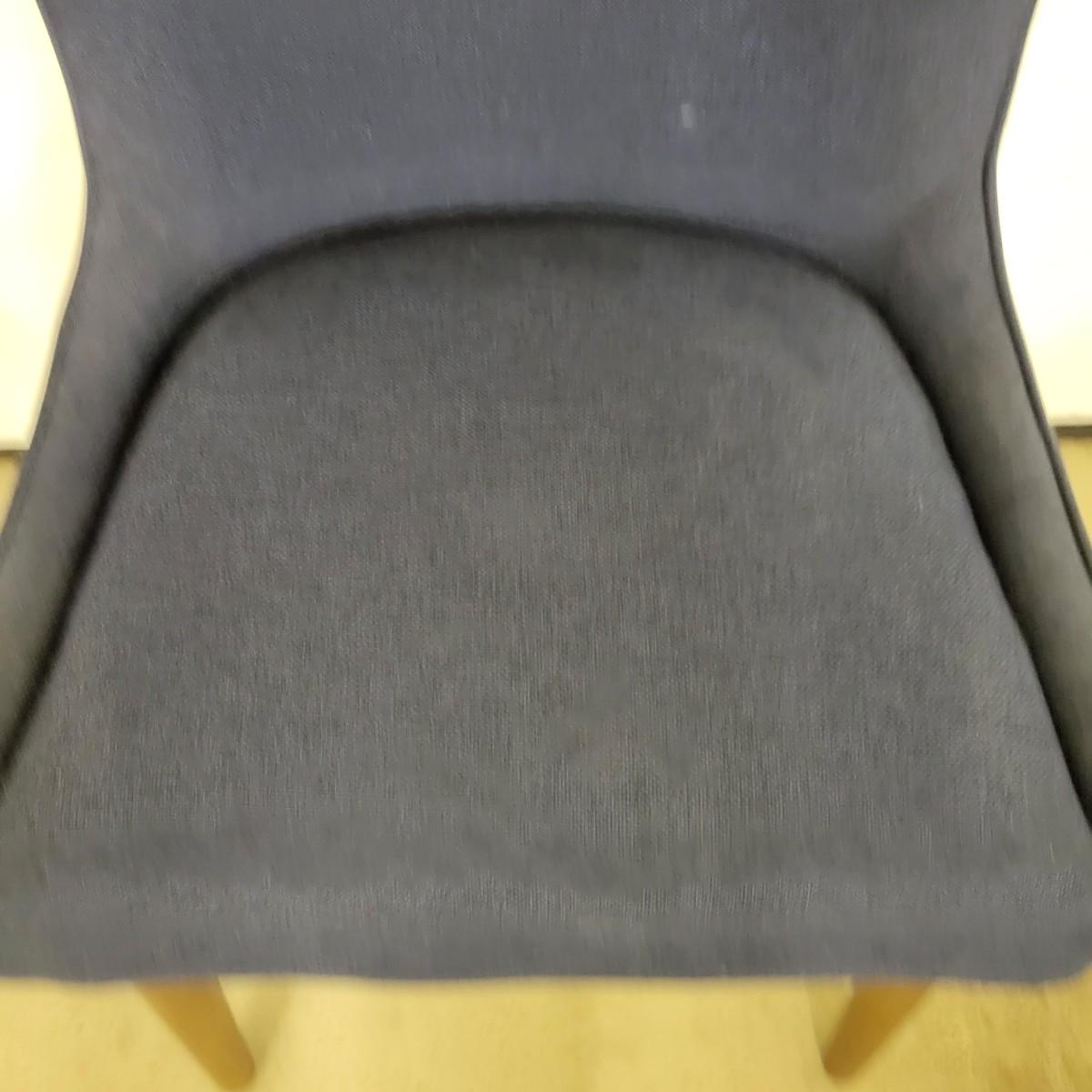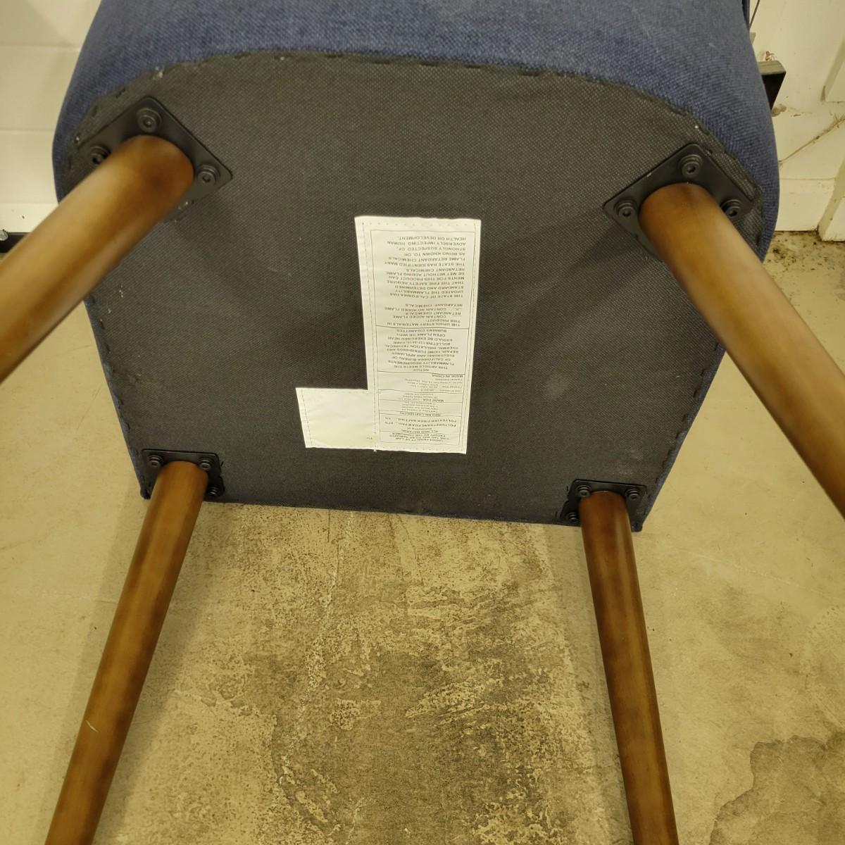 A round table that has an engineered top with a faux wood finish and a metal base that measures approximately 31"D x 30"H. Also included are four chairs upholstered in a navy blue fabric with wooden legs. The chairs measure approximately 22" x 22" x 34"H. The chairs appear to be dirty and need cleaning. The seat height is 20”. Local pickup only