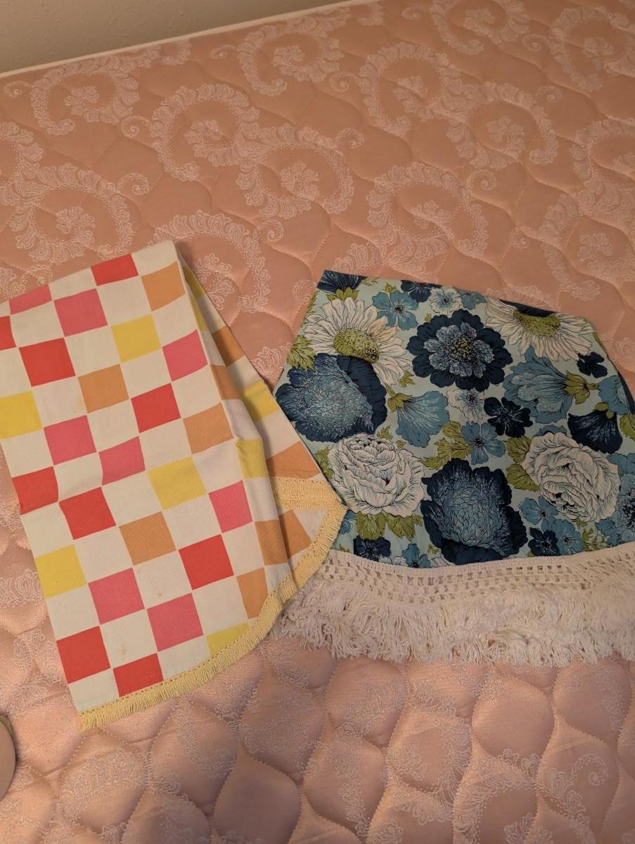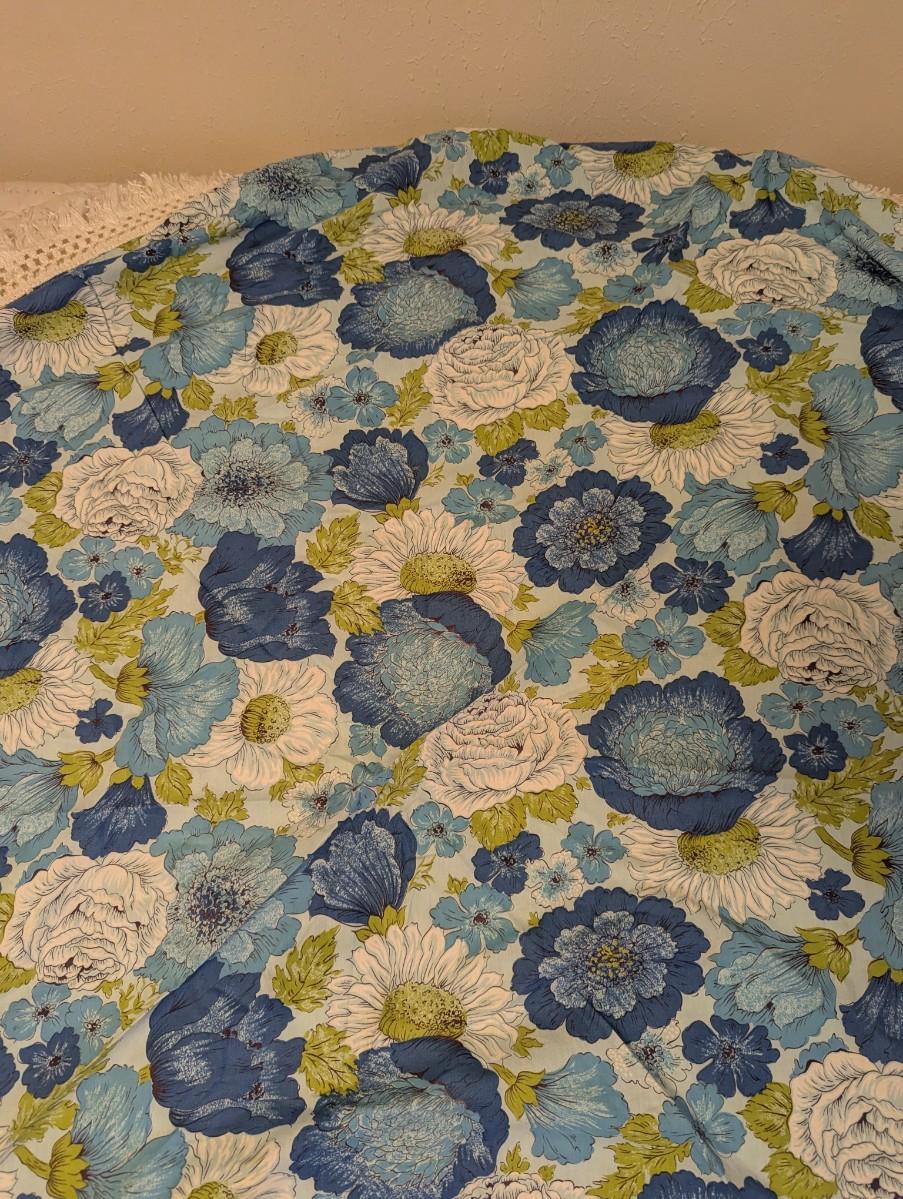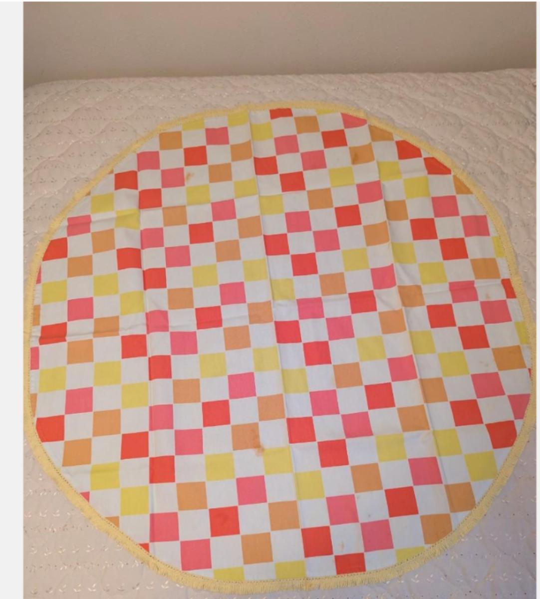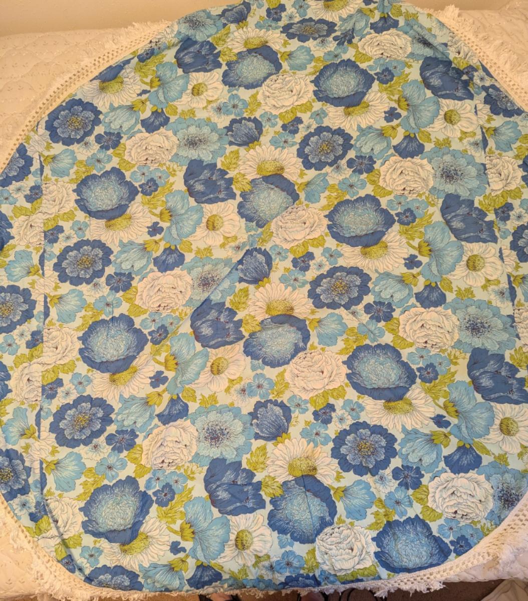 Vintage Round Tablecloth With Blue's, Green, and White Flower Pattern With Fringe All The Way Around. Yellow and Orange Checkered Round.