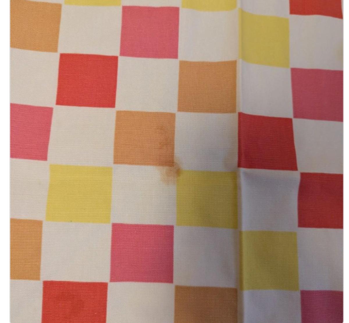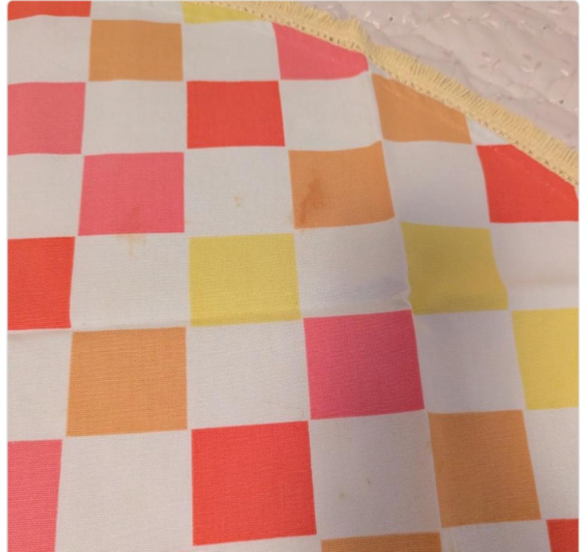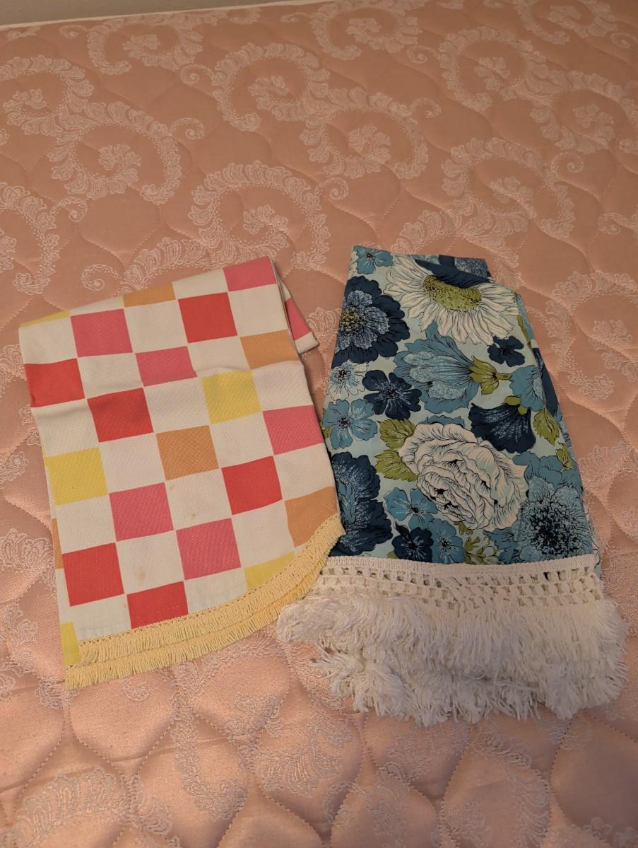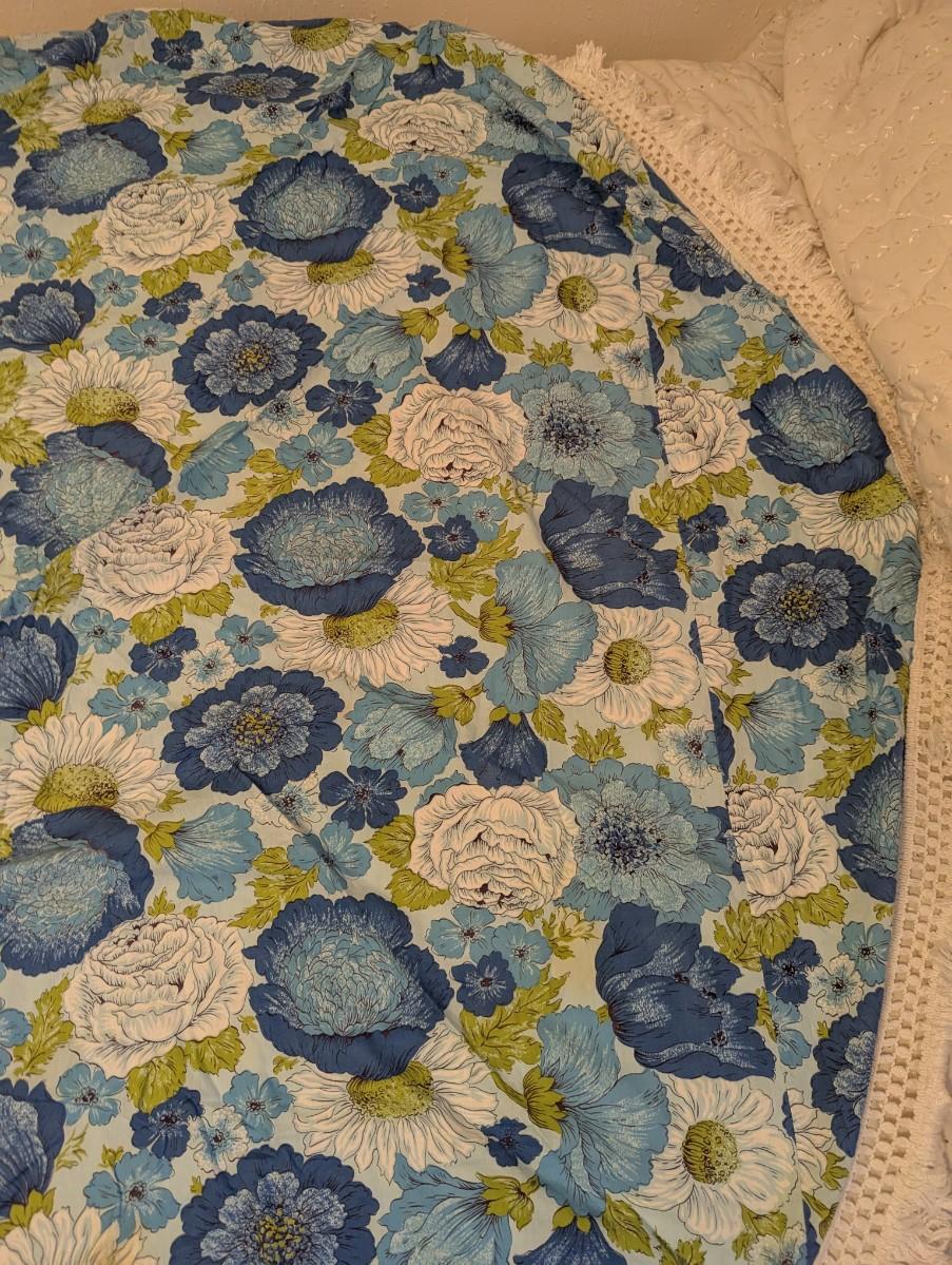 Vintage Round Tablecloth With Blue's, Green, and White Flower Pattern With Fringe All The Way Around. Yellow and Orange Checkered Round.