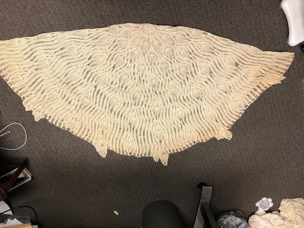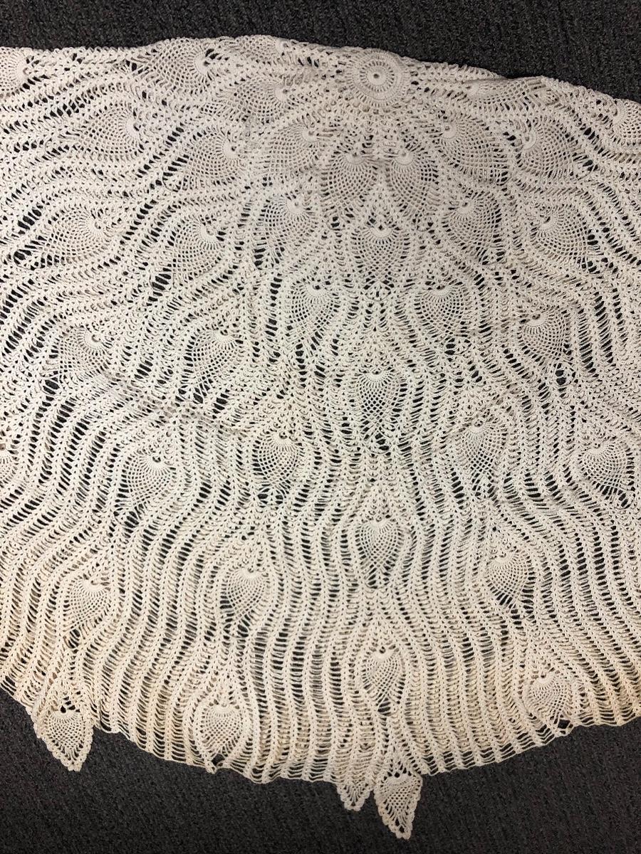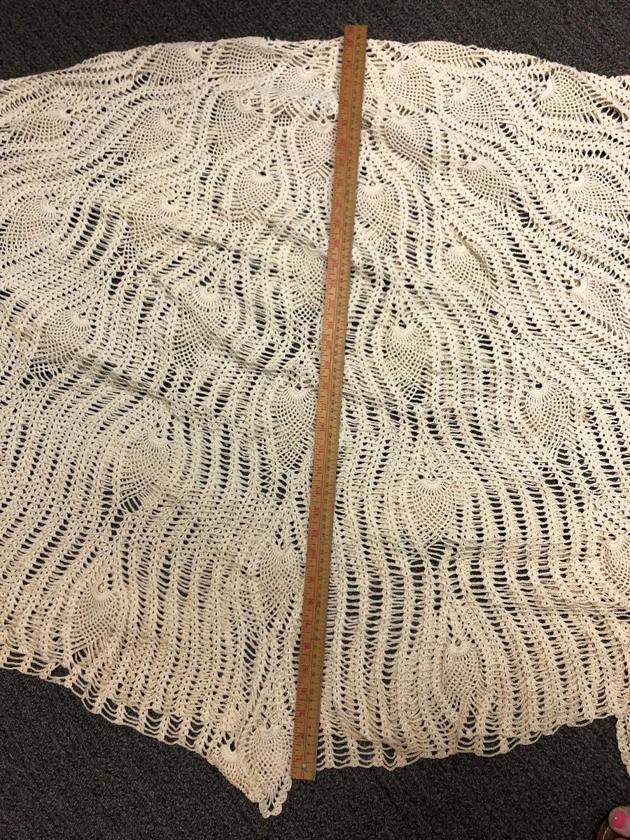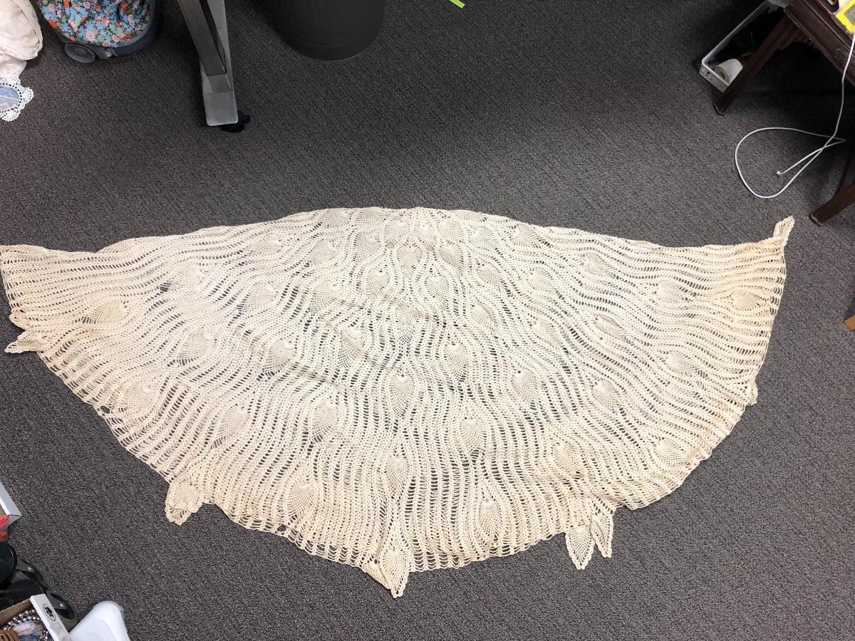 Round table cloth, handmade crochet, approximately 85 inches diameter.