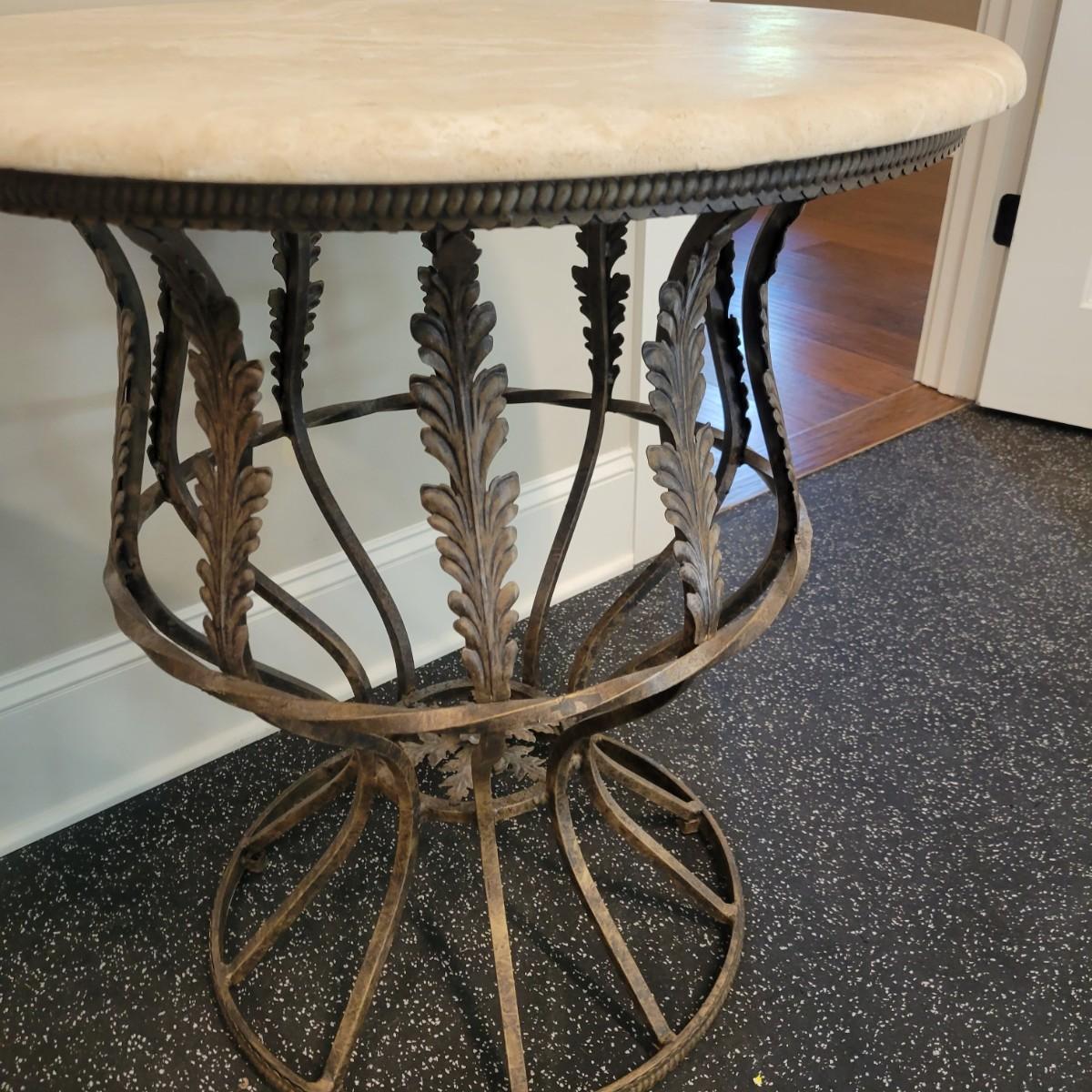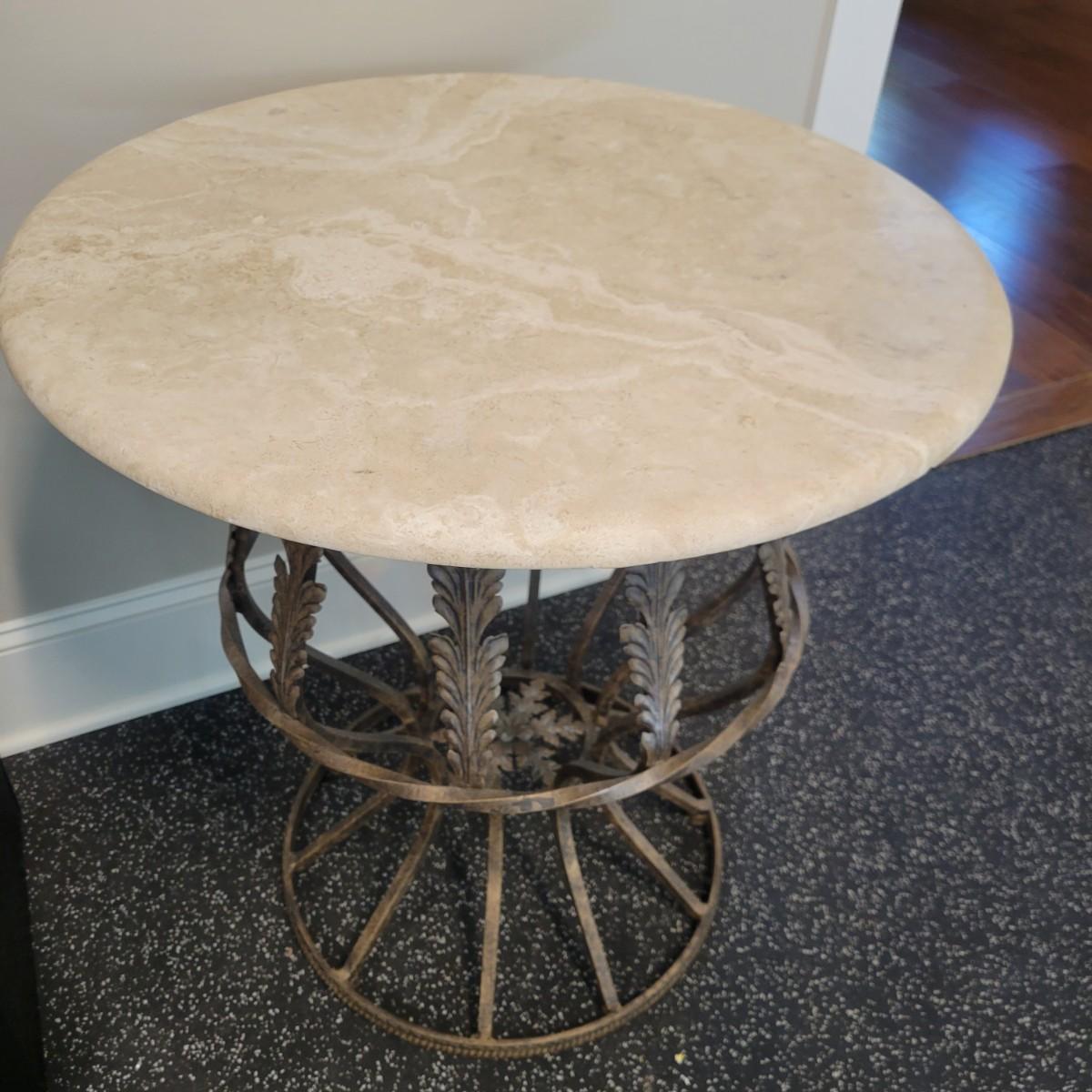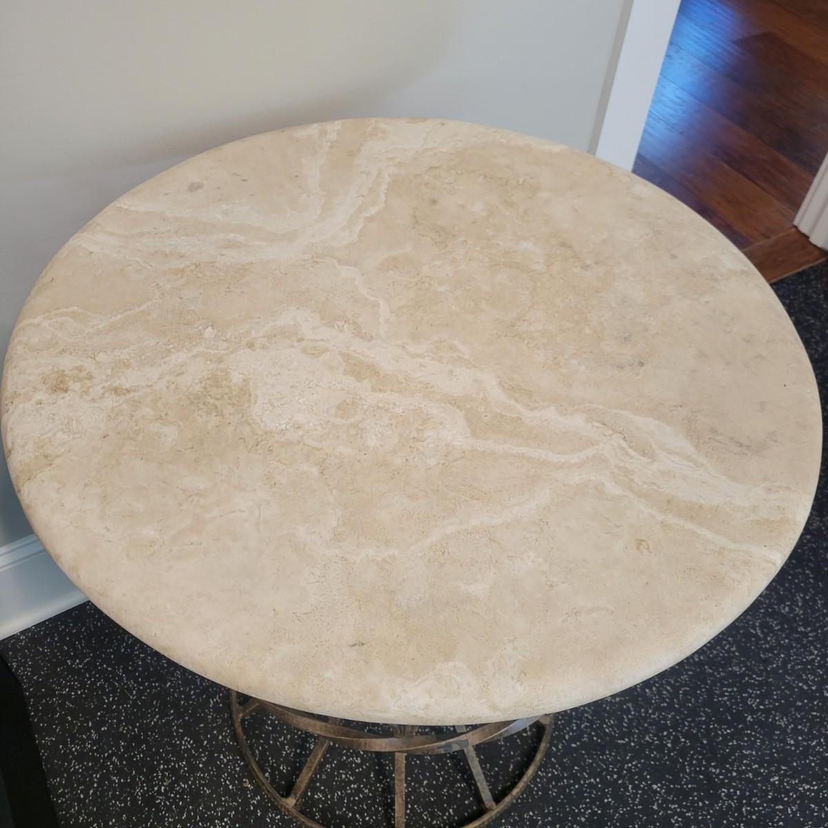 A round lamp table that has an ornate metal frame with a mottled bronze finish and a travertine-like top that separates from the base. It measures approximately 27.5"D x 29.5"H. Local pickup only. Winning bidder must bring assistance to help move and load this item due to its weight and/or size.