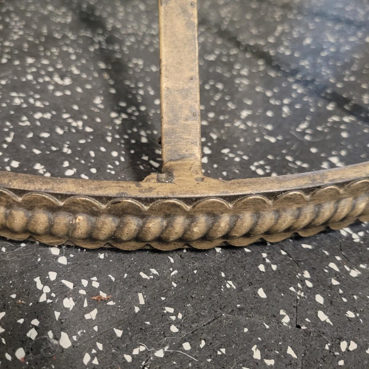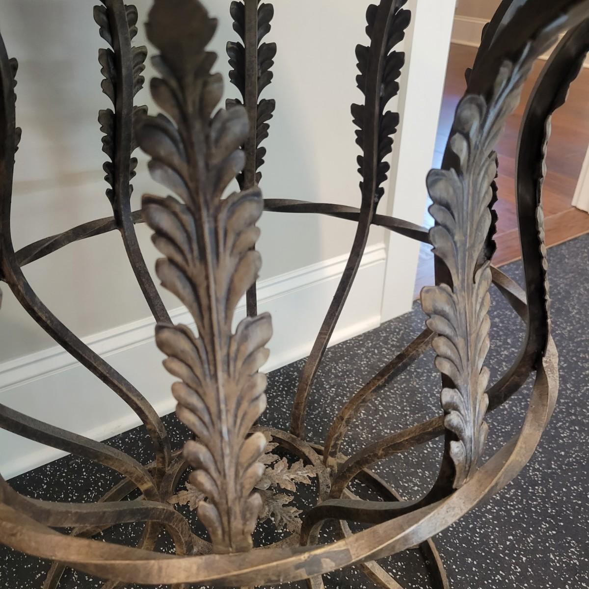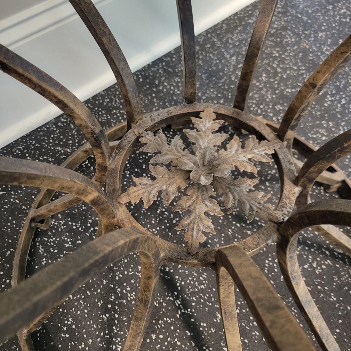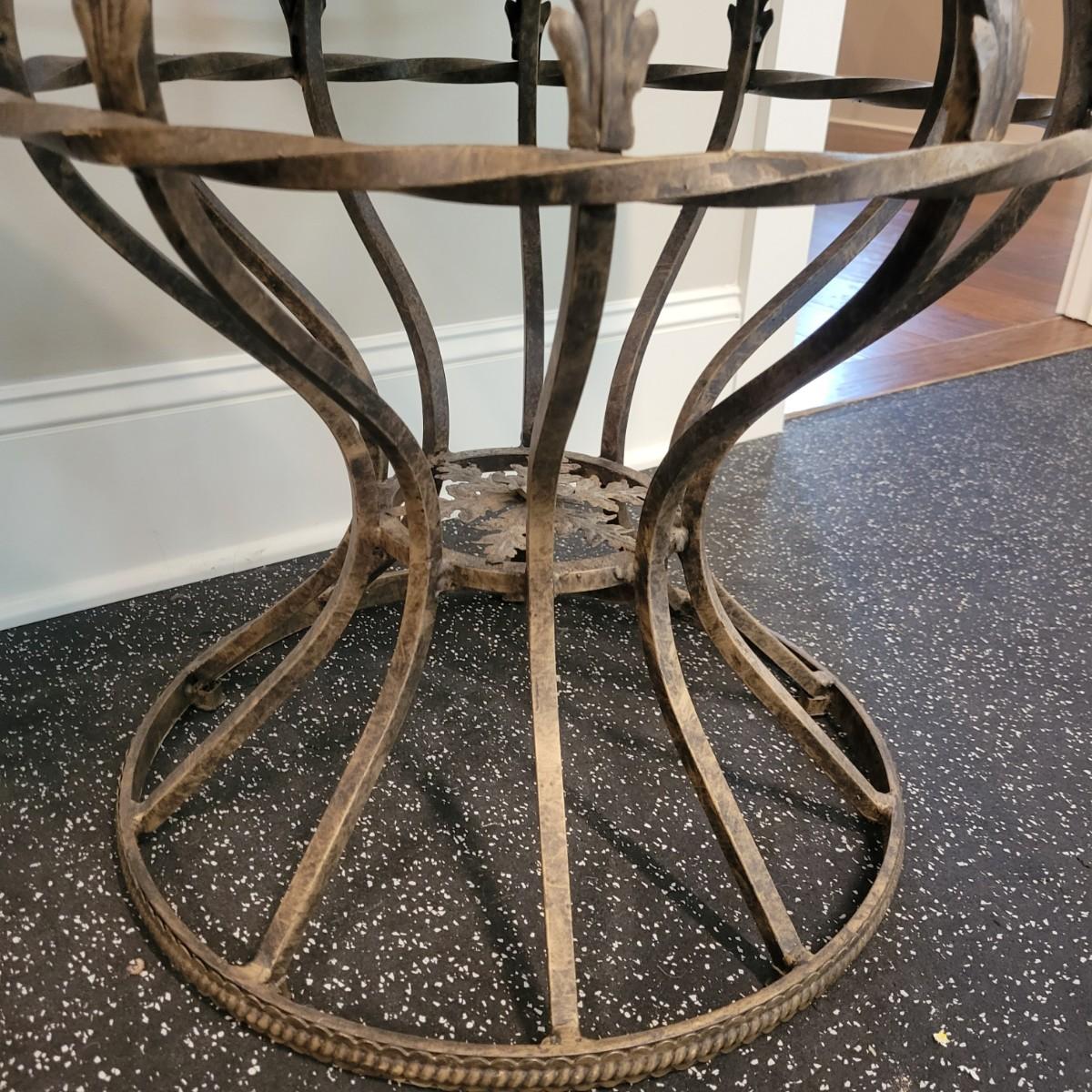 A round lamp table that has an ornate metal frame with a mottled bronze finish and a travertine-like top that separates from the base. It measures approximately 27.5"D x 29.5"H. Local pickup only. Winning bidder must bring assistance to help move and load this item due to its weight and/or size.