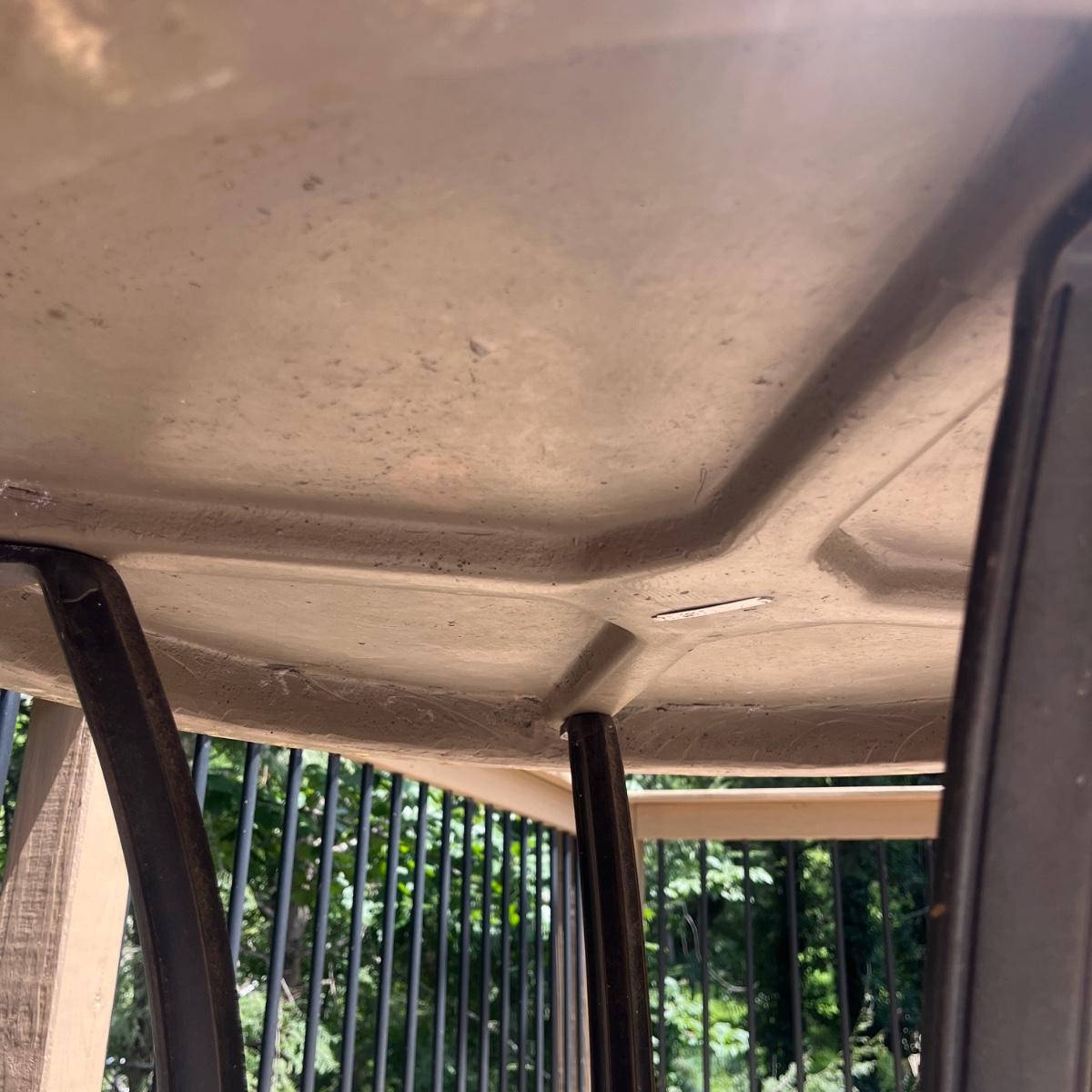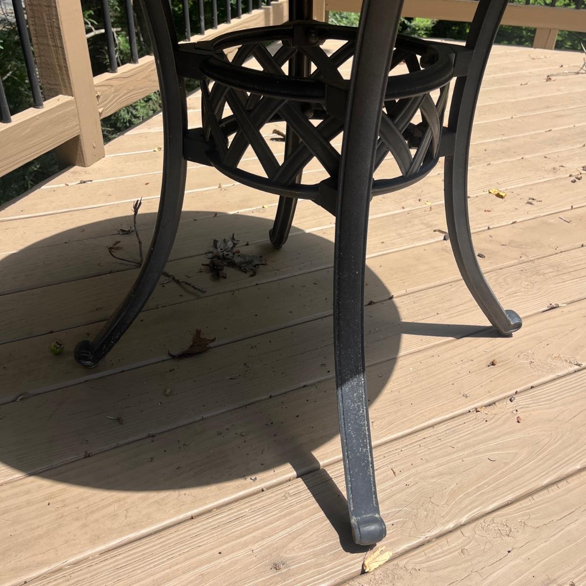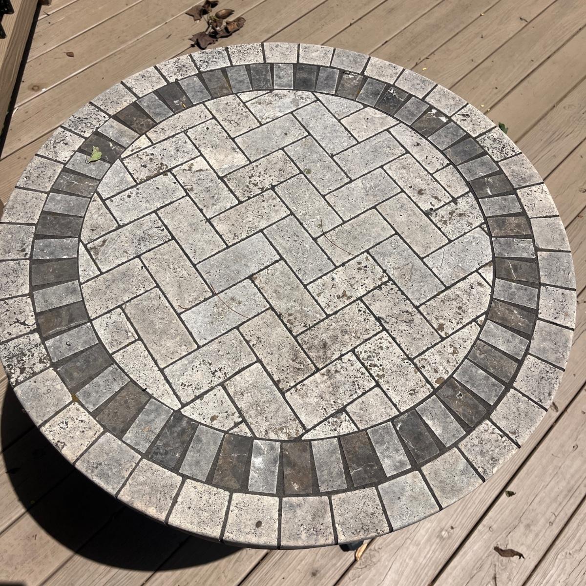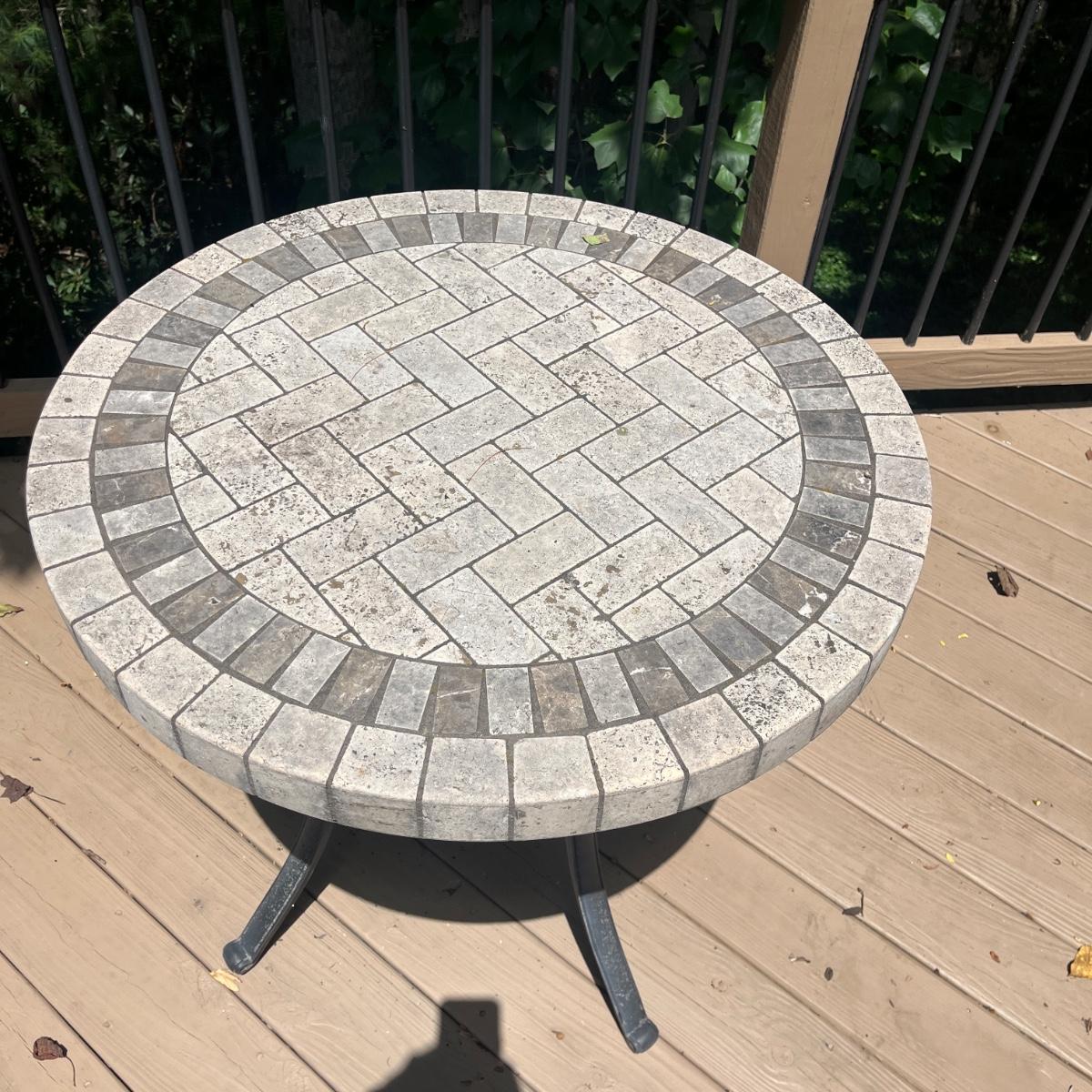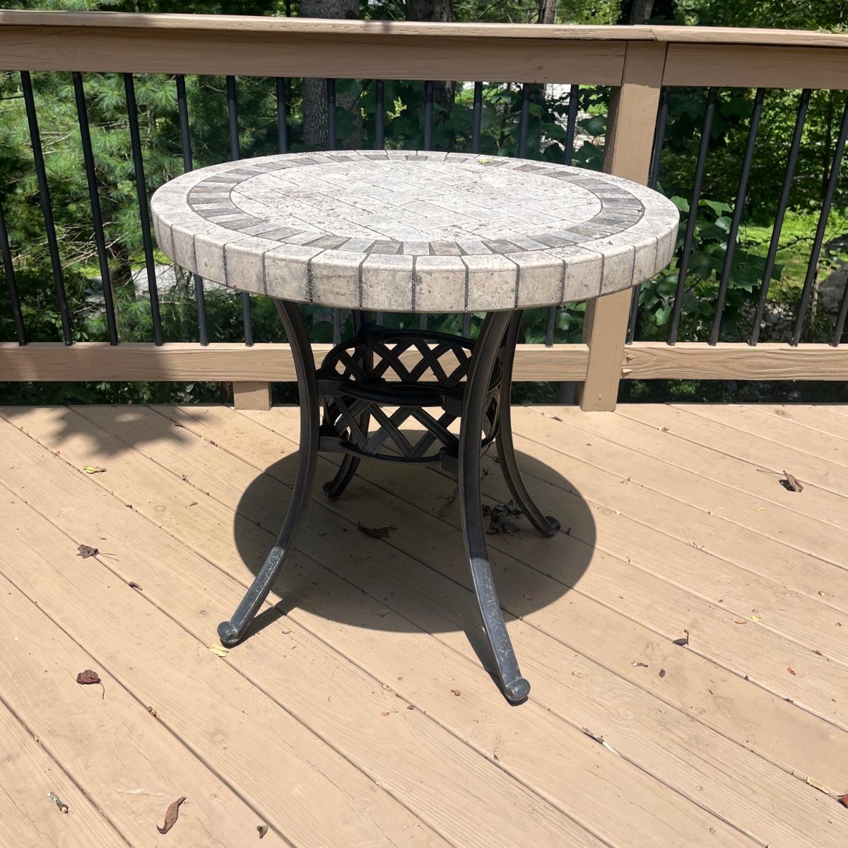 This round tile top table has a cast aluminum base and what looks like a tile top that appears to be resin. Table measures 30”D x 28”H.