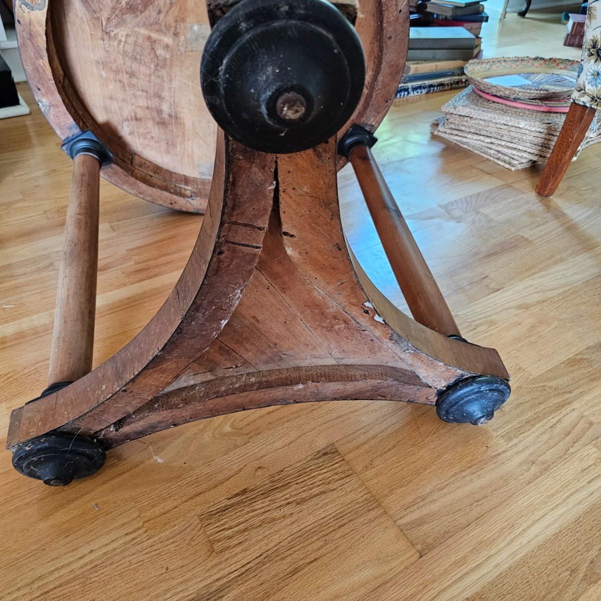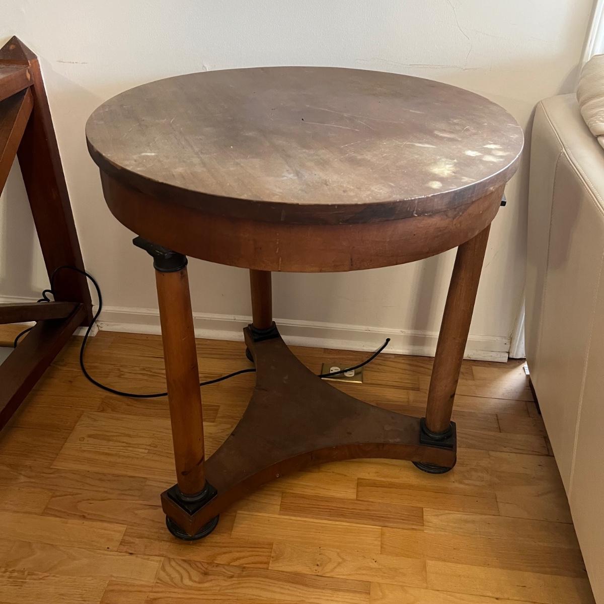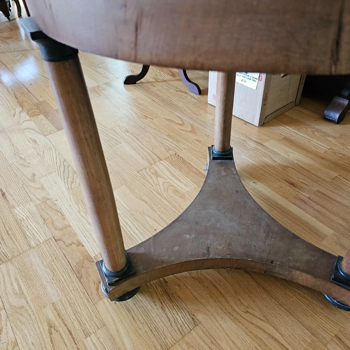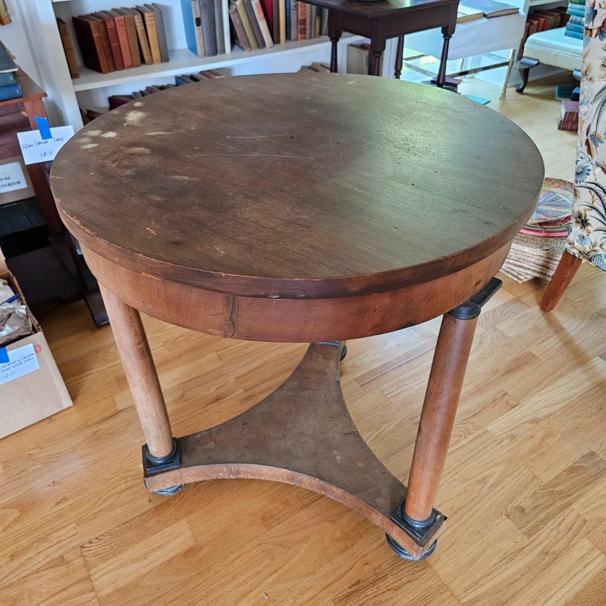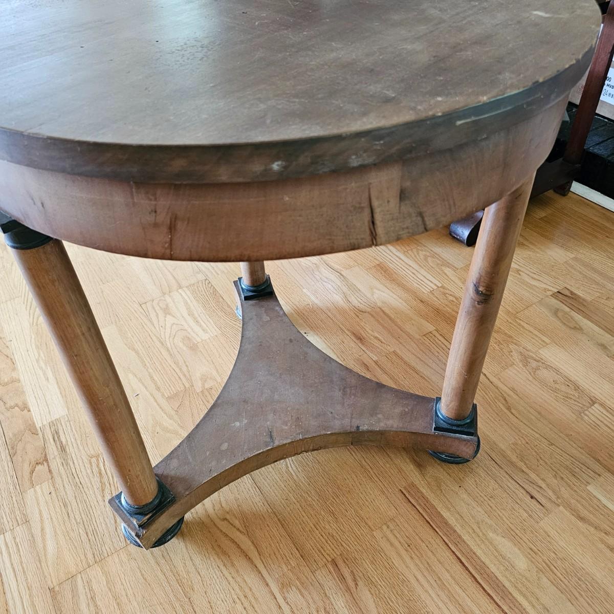 Round top table with unique tri-leg base and shelf. Triangular base has round column legs and foot decorations. Table measures 28"D x 30.5"H. Some scratches and blemishes on top and legs. See photos for details. Local pickup only.