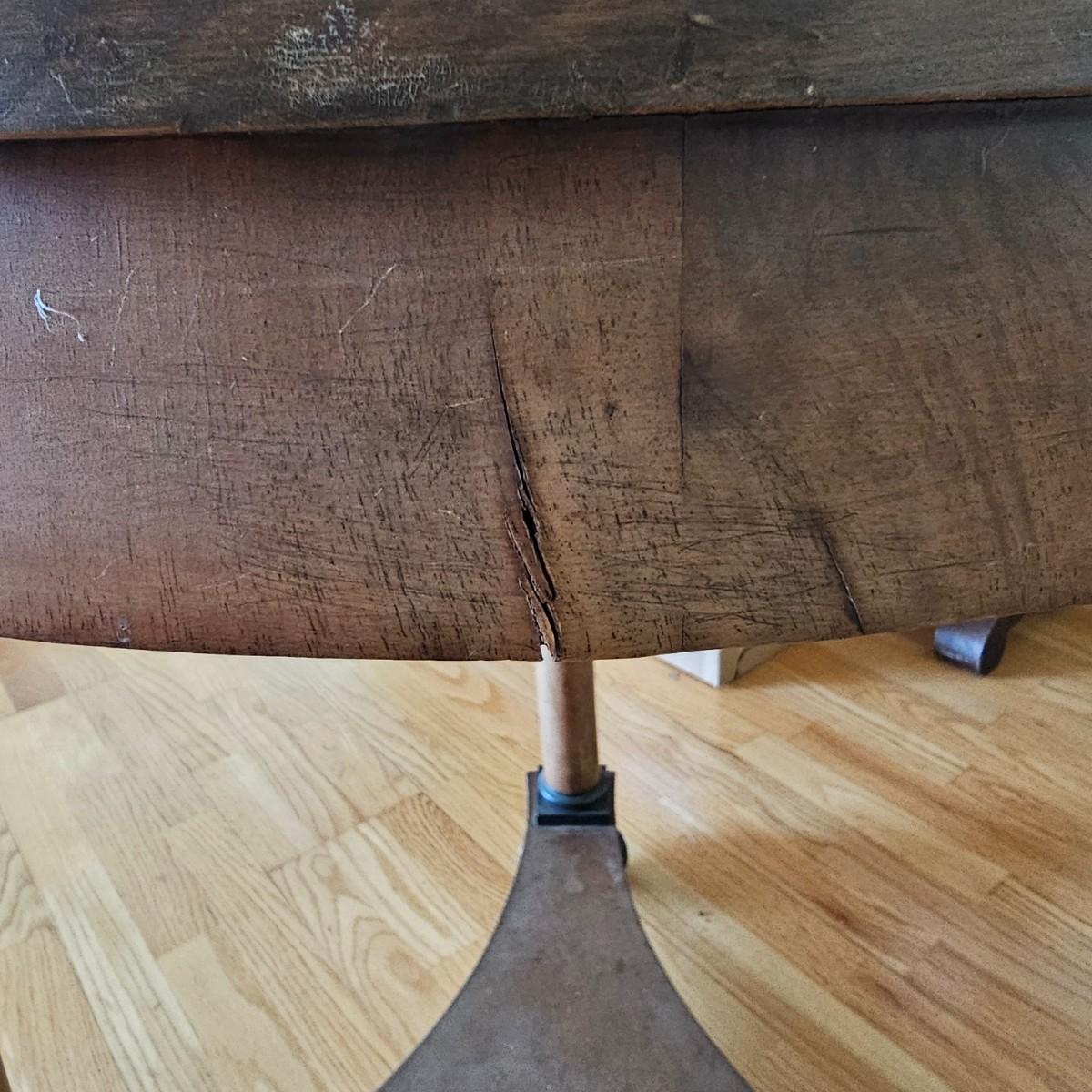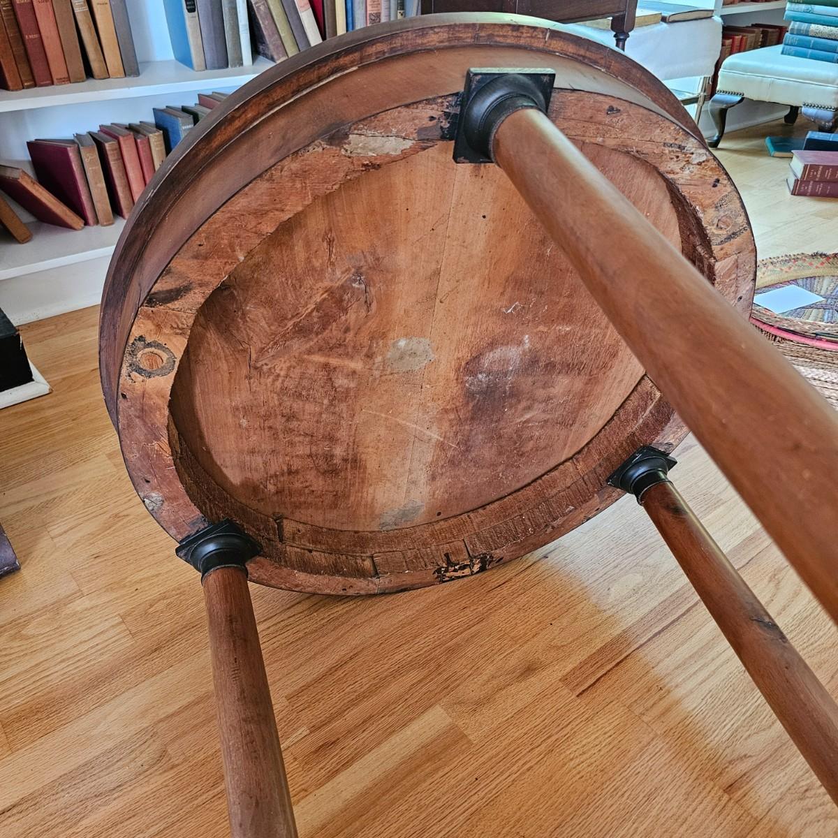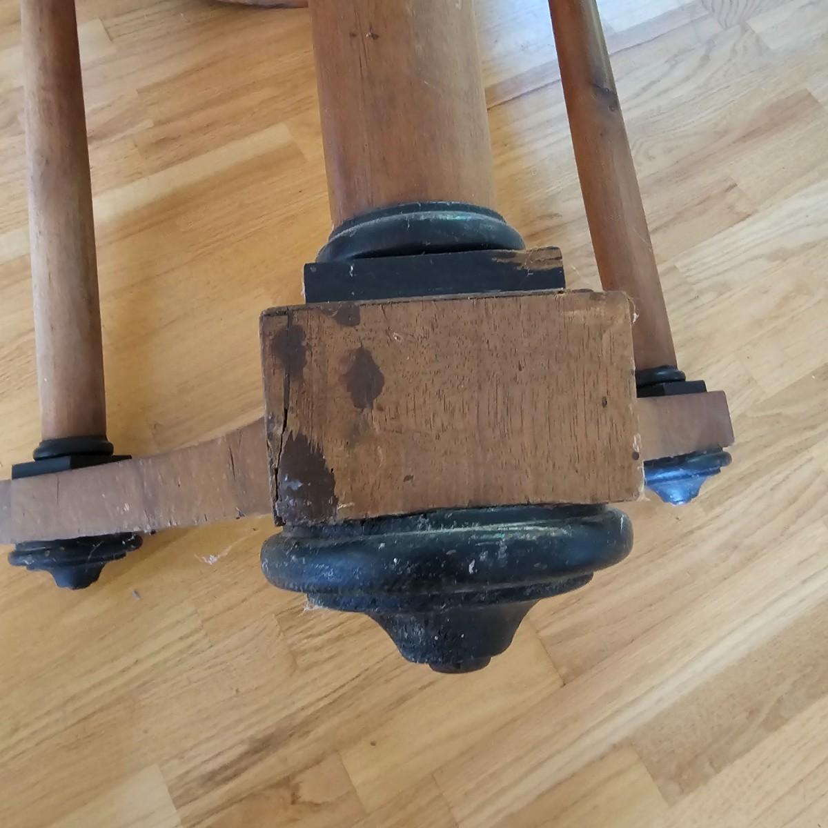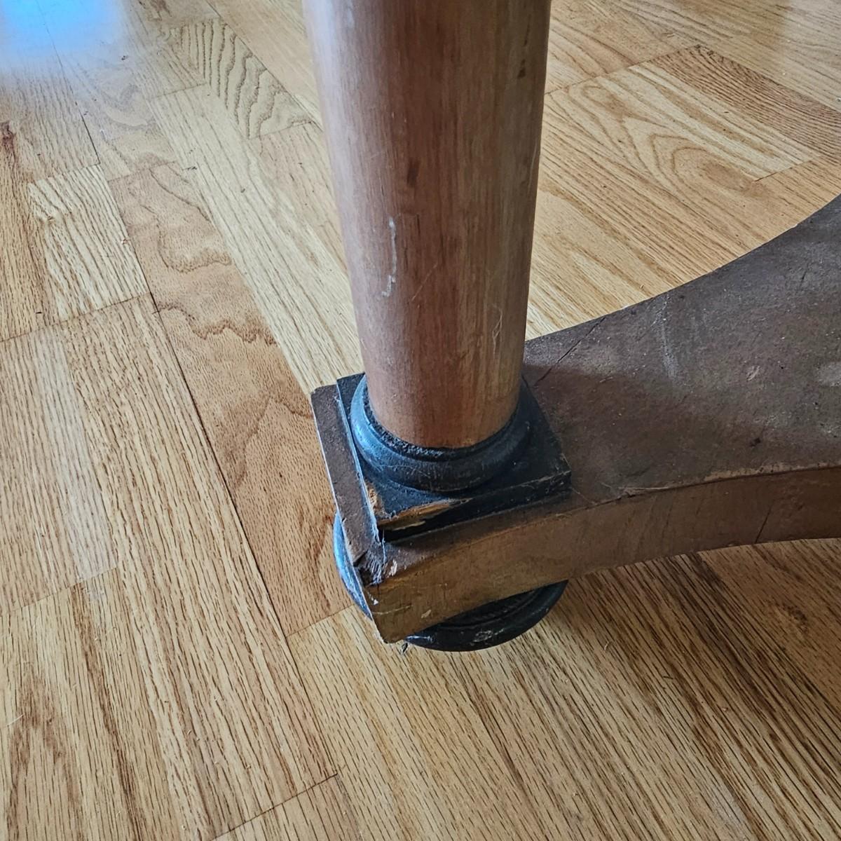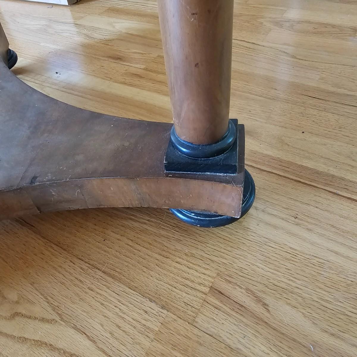 Round top table with unique tri-leg base and shelf. Triangular base has round column legs and foot decorations. Table measures 28"D x 30.5"H. Some scratches and blemishes on top and legs. See photos for details. Local pickup only.
