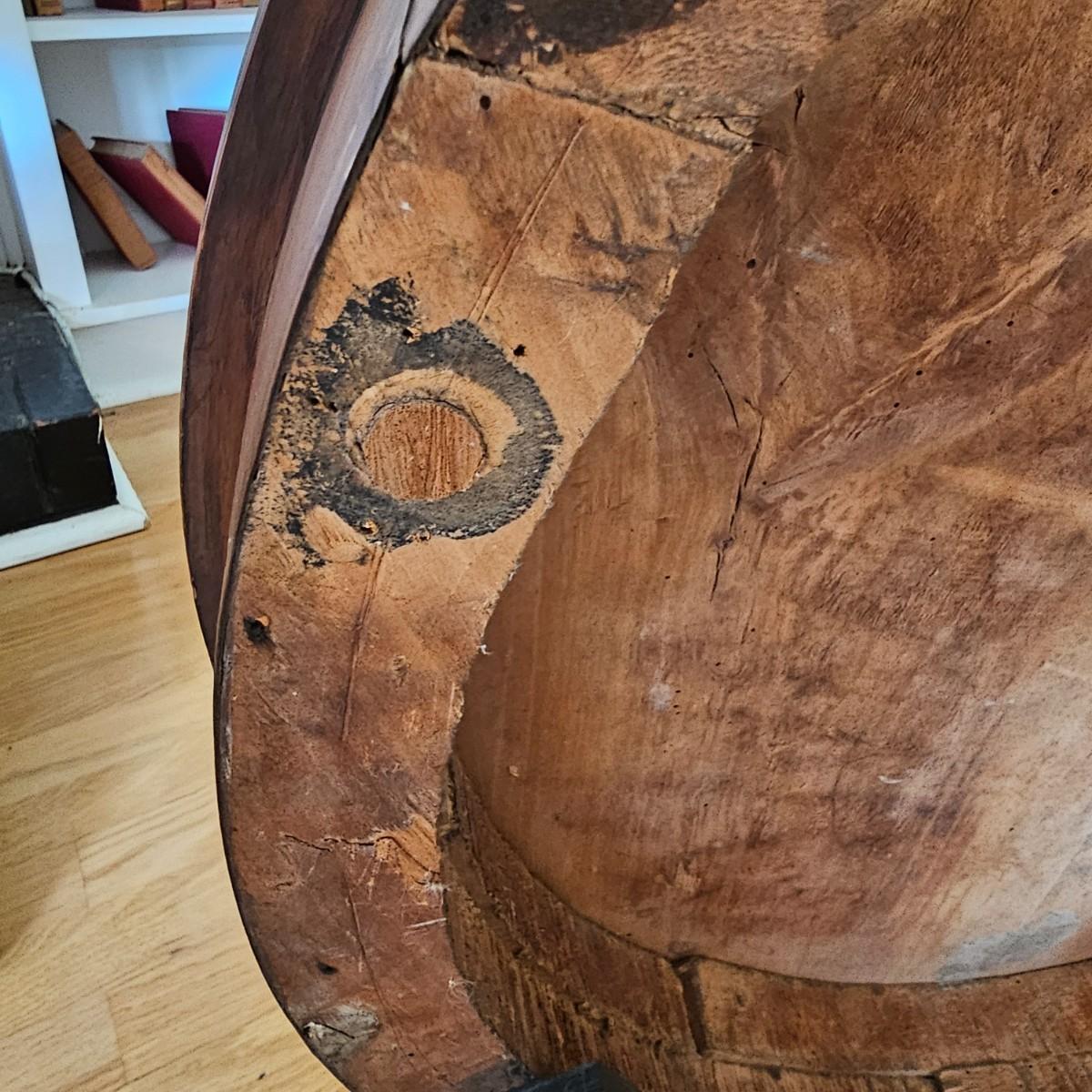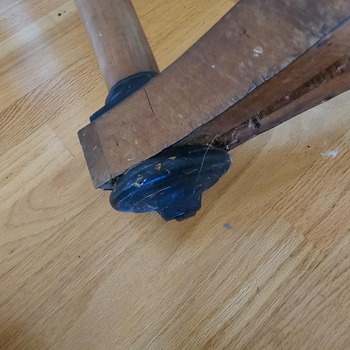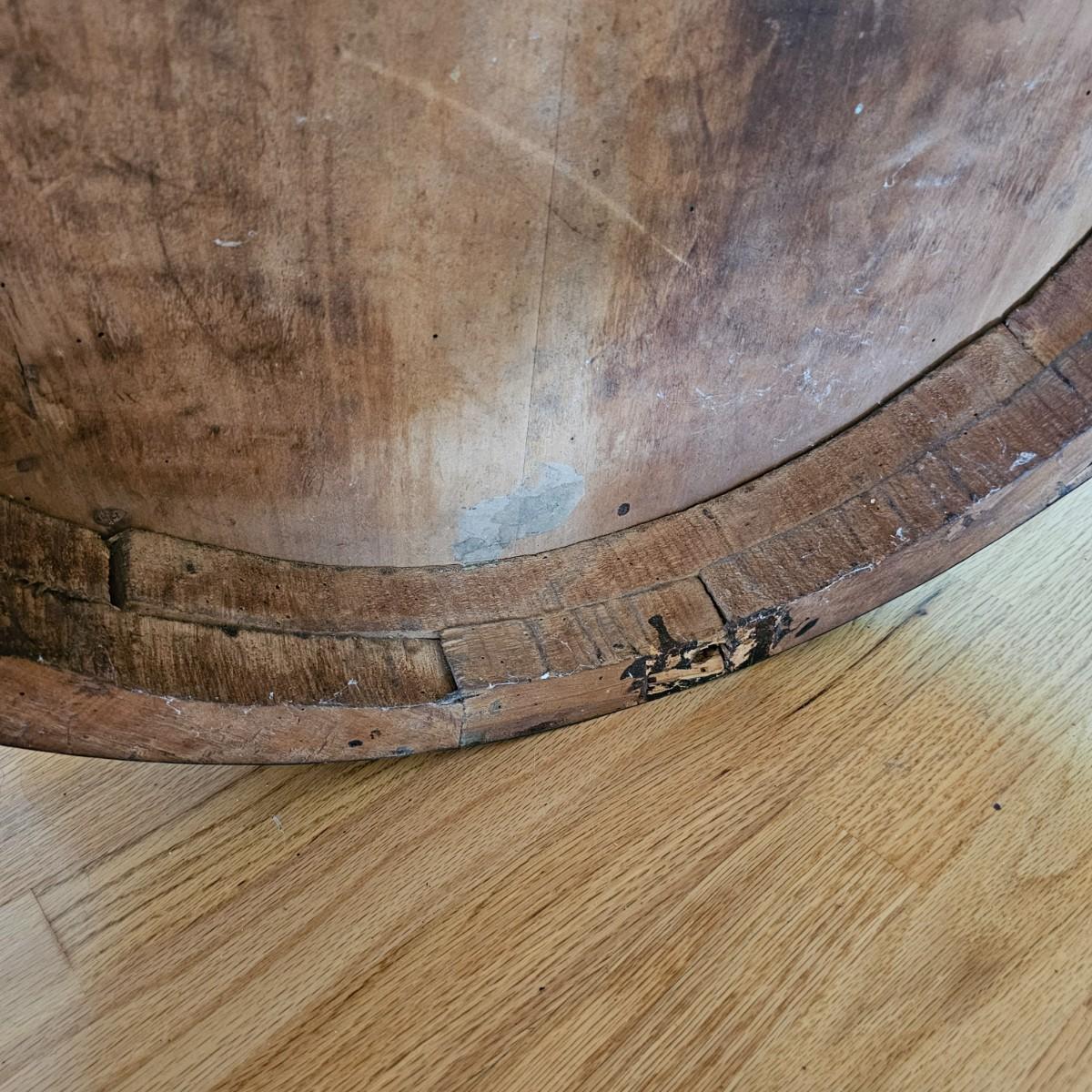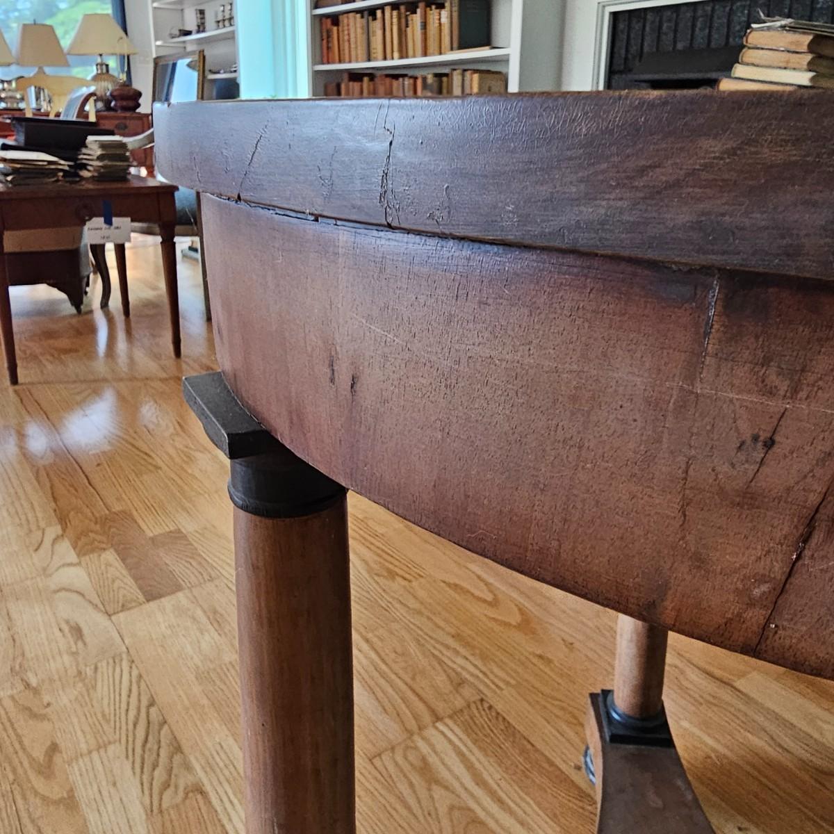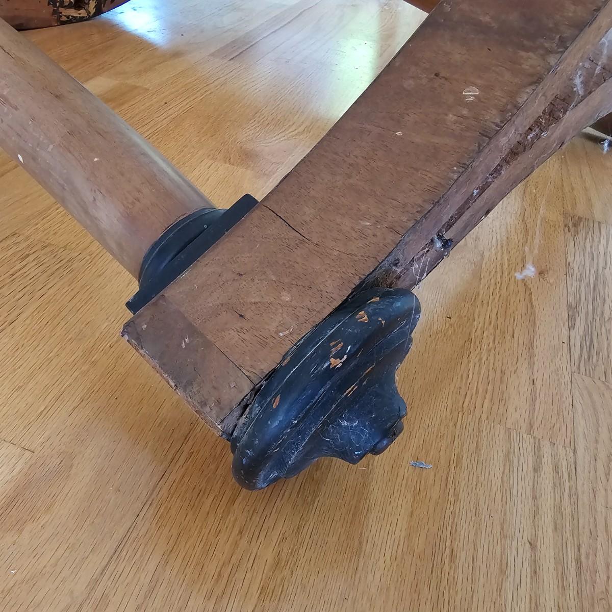 Round top table with unique tri-leg base and shelf. Triangular base has round column legs and foot decorations. Table measures 28"D x 30.5"H. Some scratches and blemishes on top and legs. See photos for details. Local pickup only.