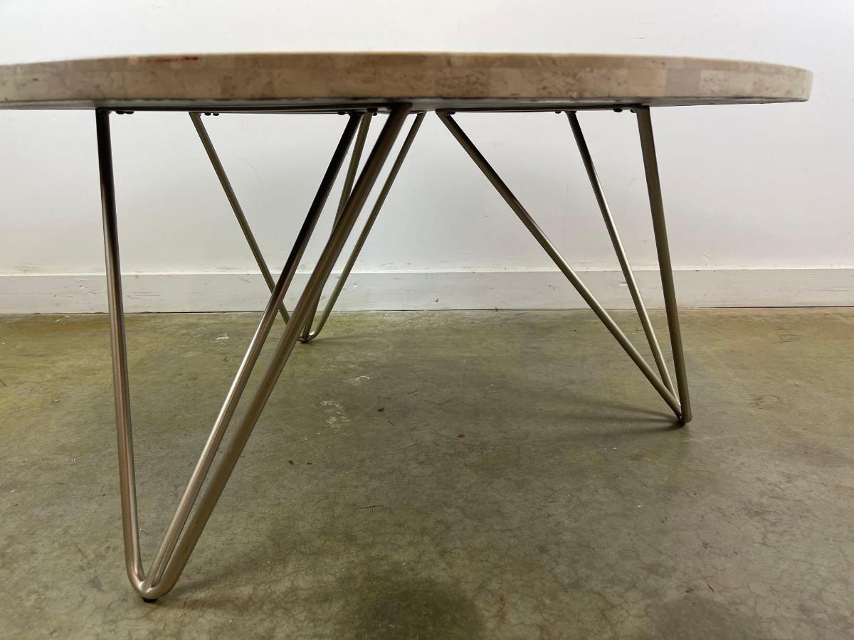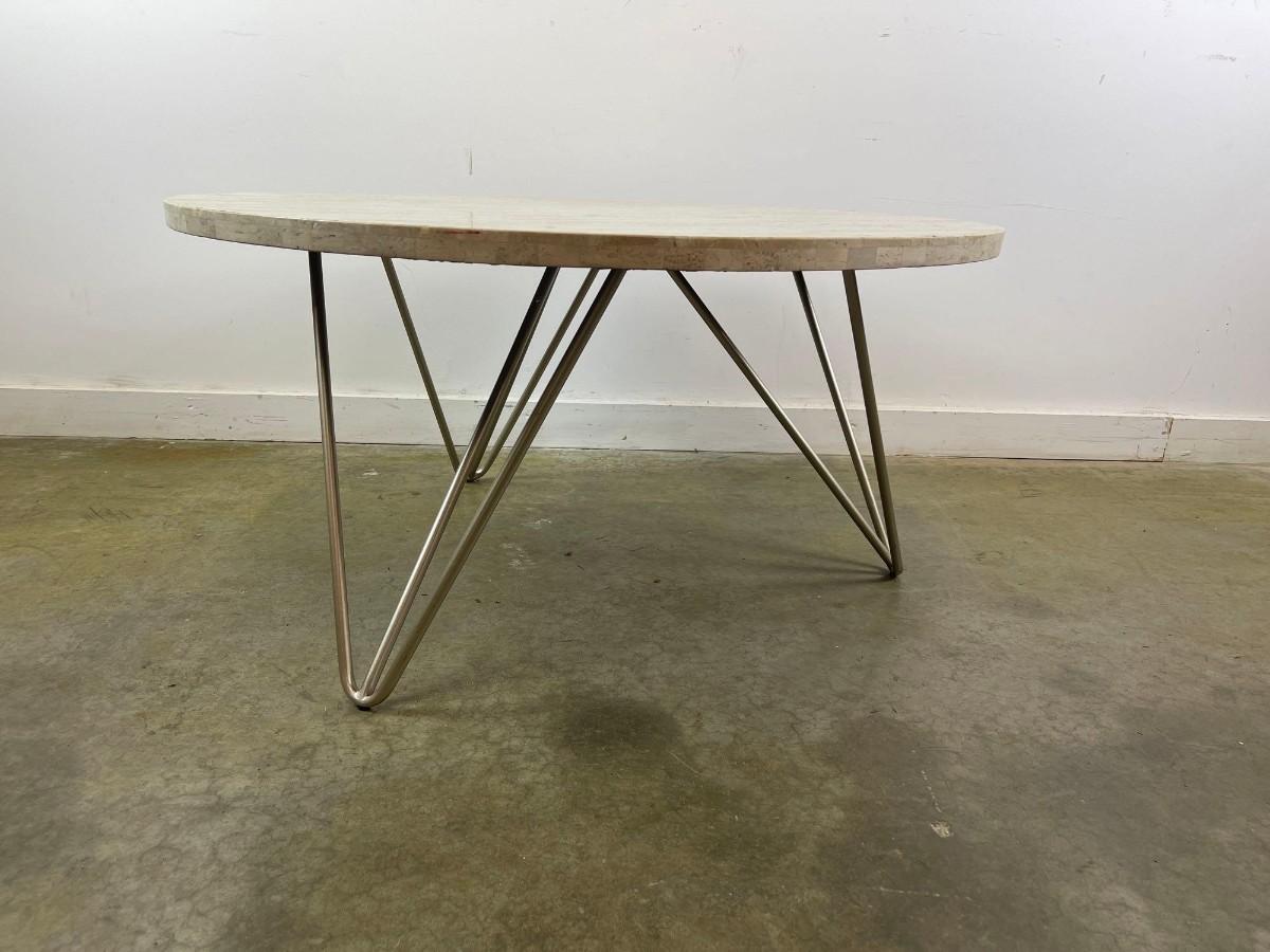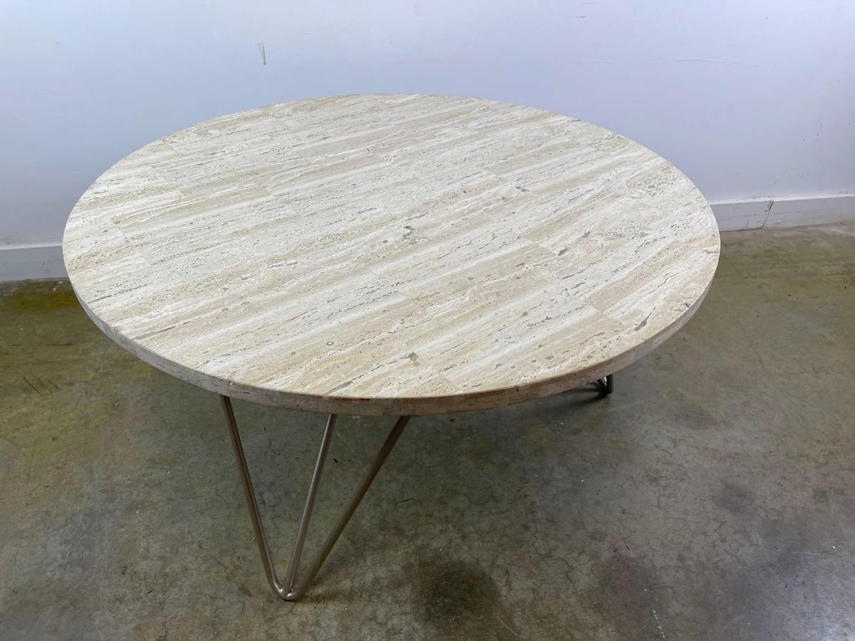 Round Travertine Top Coffee Table with Metal Hairpin Legs. Excellent condition. 36” diameter.