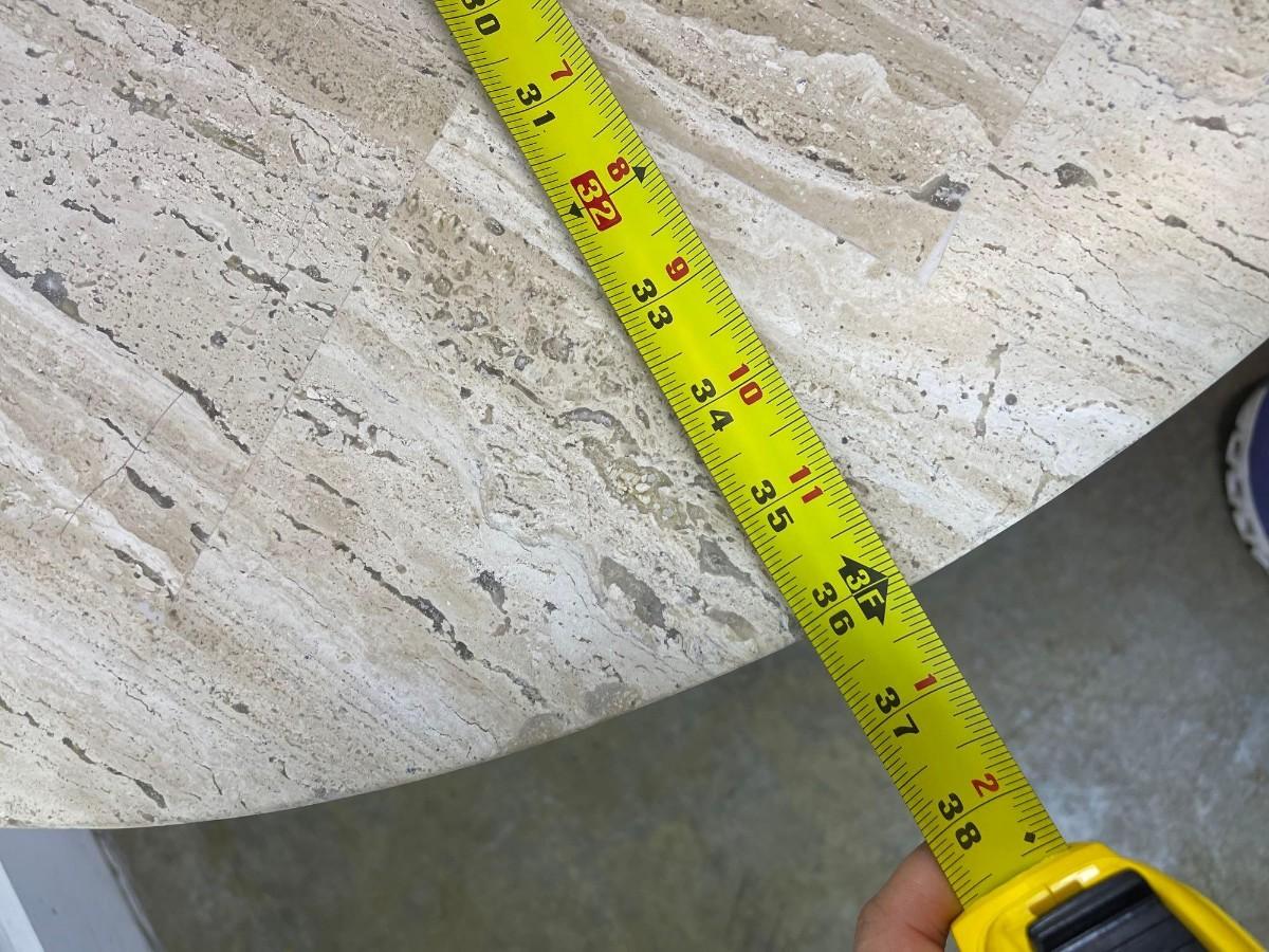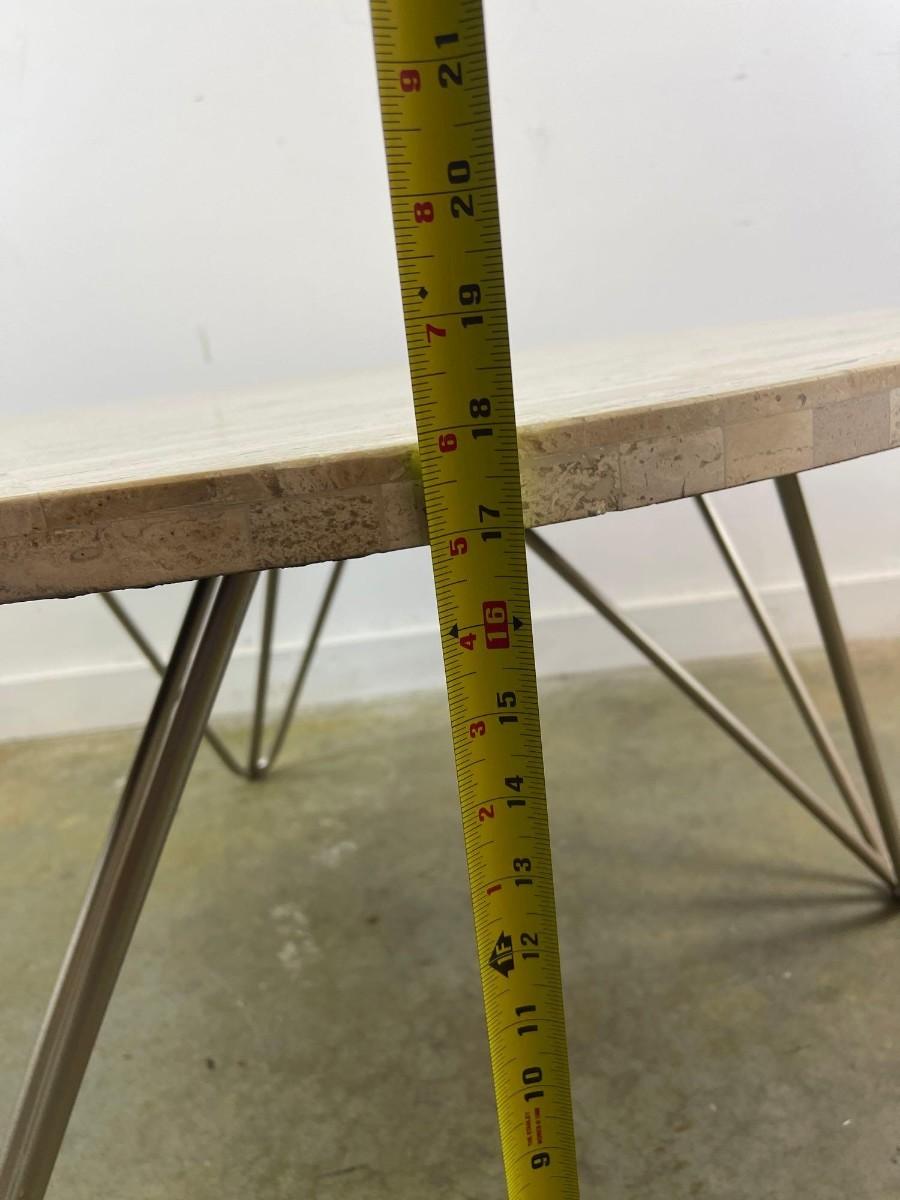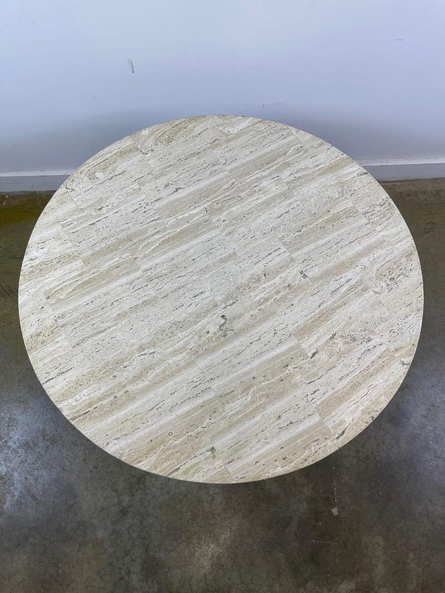 Round Travertine Top Coffee Table with Metal Hairpin Legs. Excellent condition. 36” diameter.