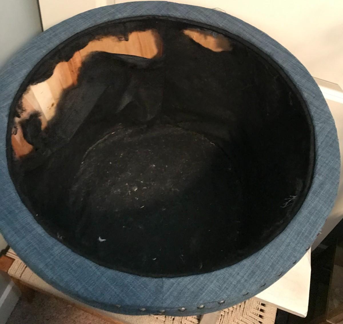 Has some damage to the inside lining. Small stain on top, can be cleaned off
