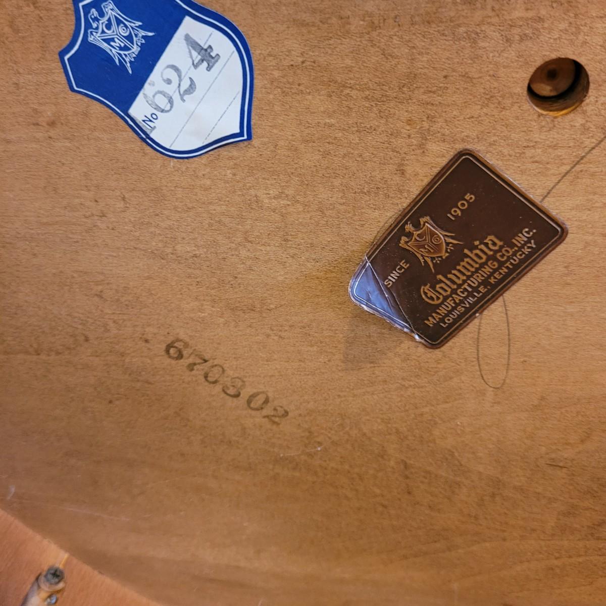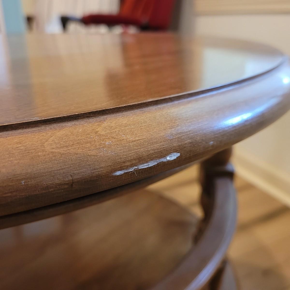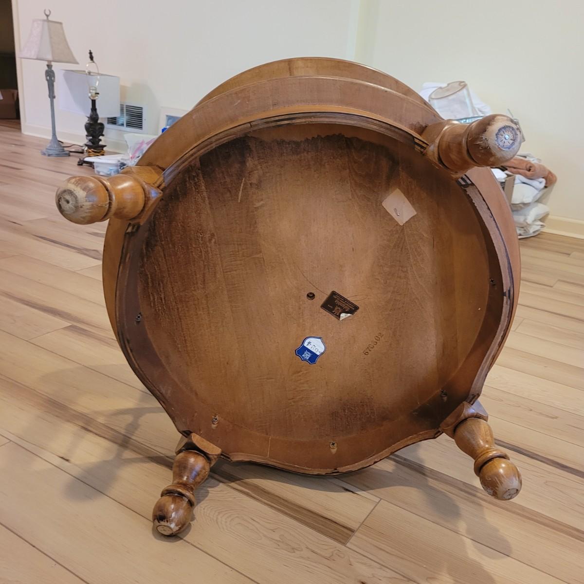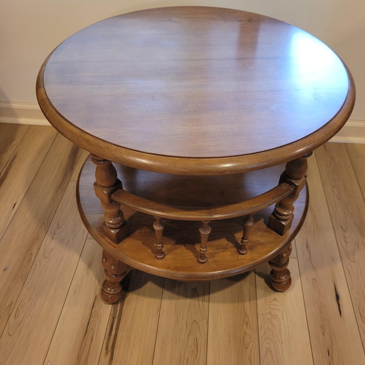 This sturdy solid wood side table by Columbia Manufacturing Co. has extra storage with a lower level. Minor scratches throughout (see photos). Measures approximately 26.5"D x 22"H. Local pickup only.