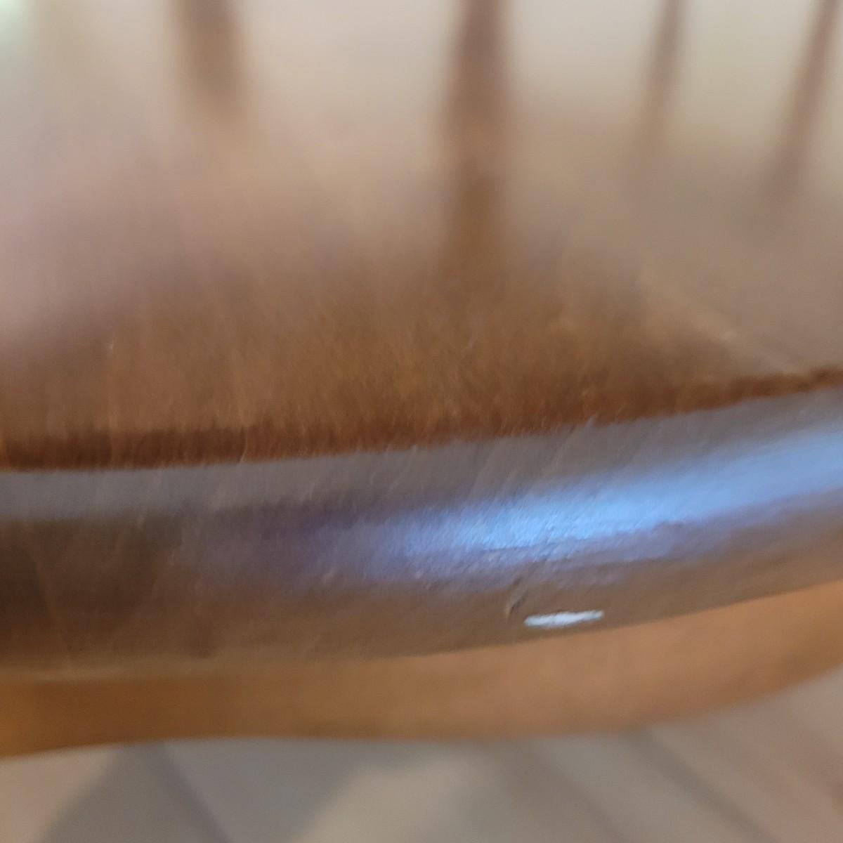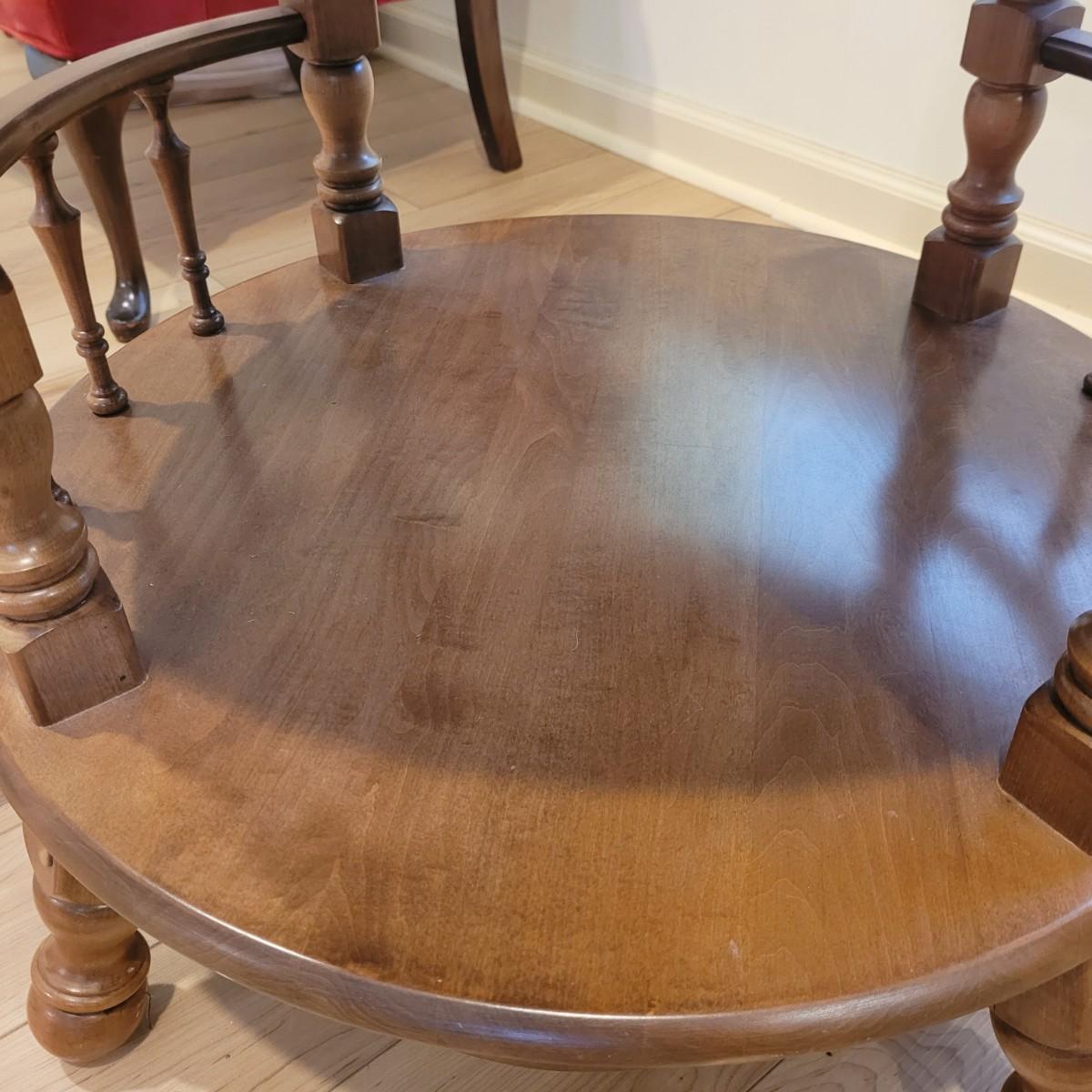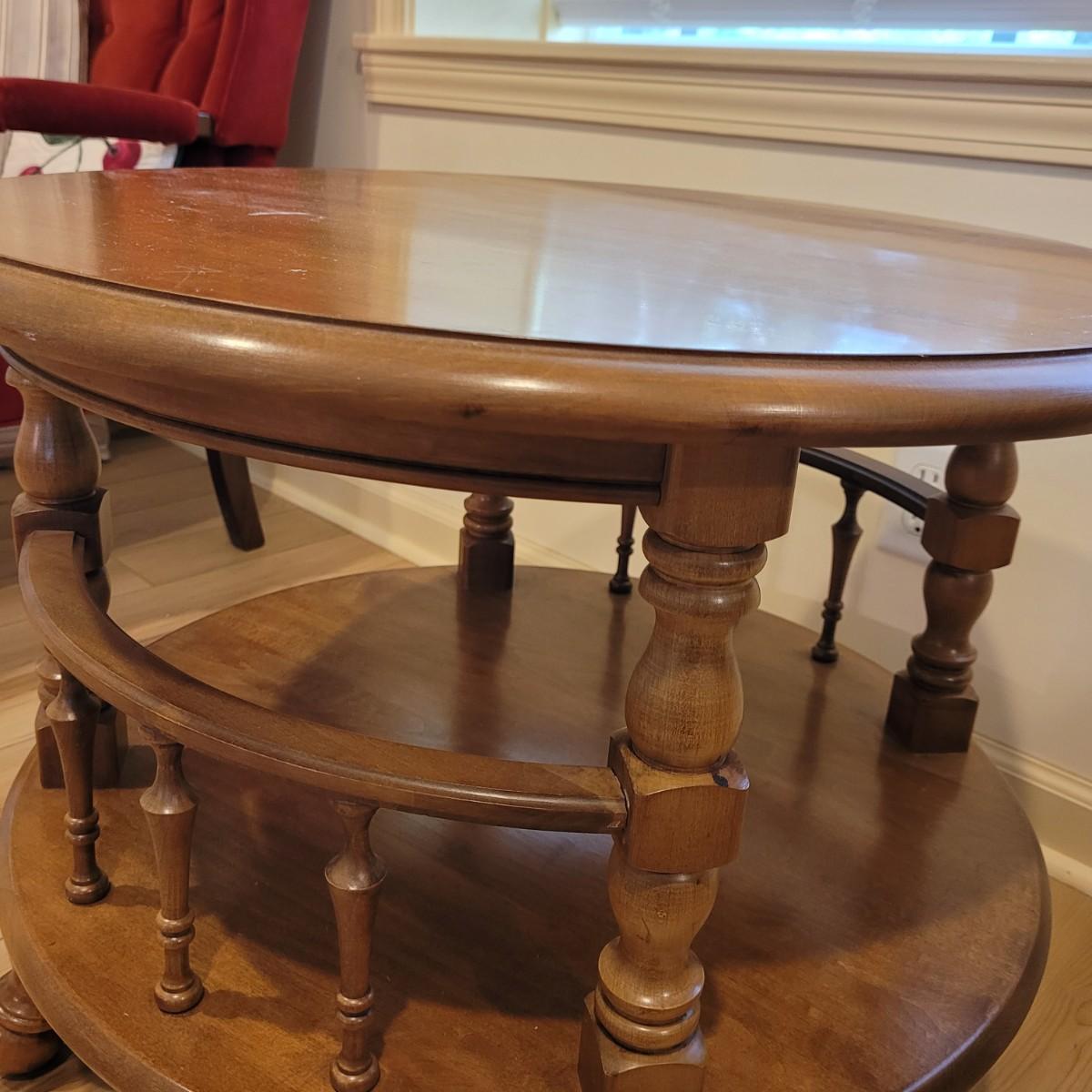 This sturdy solid wood side table by Columbia Manufacturing Co. has extra storage with a lower level. Minor scratches throughout (see photos). Measures approximately 26.5"D x 22"H. Local pickup only.