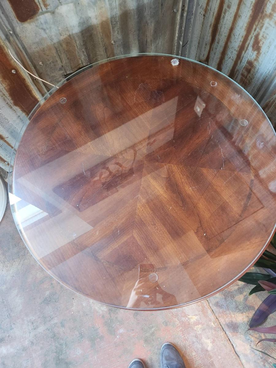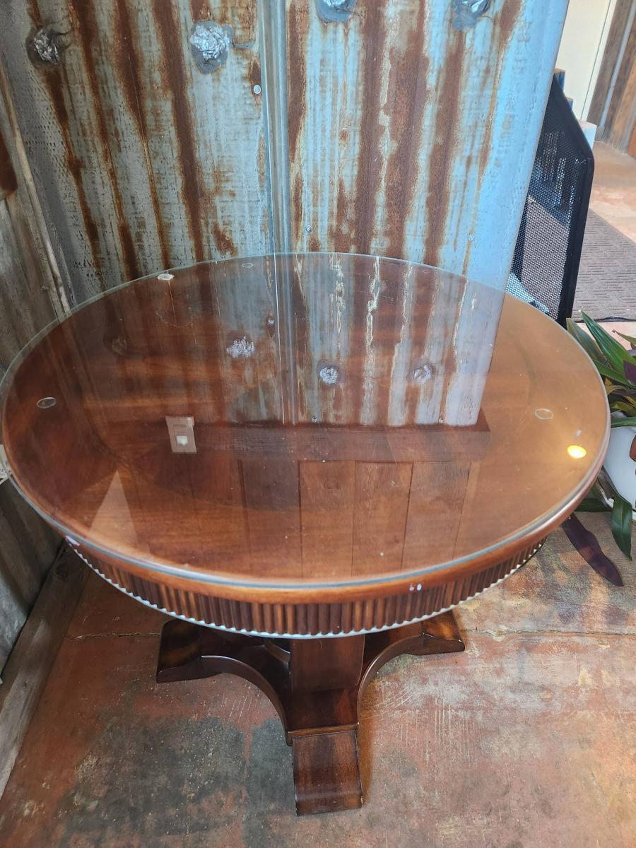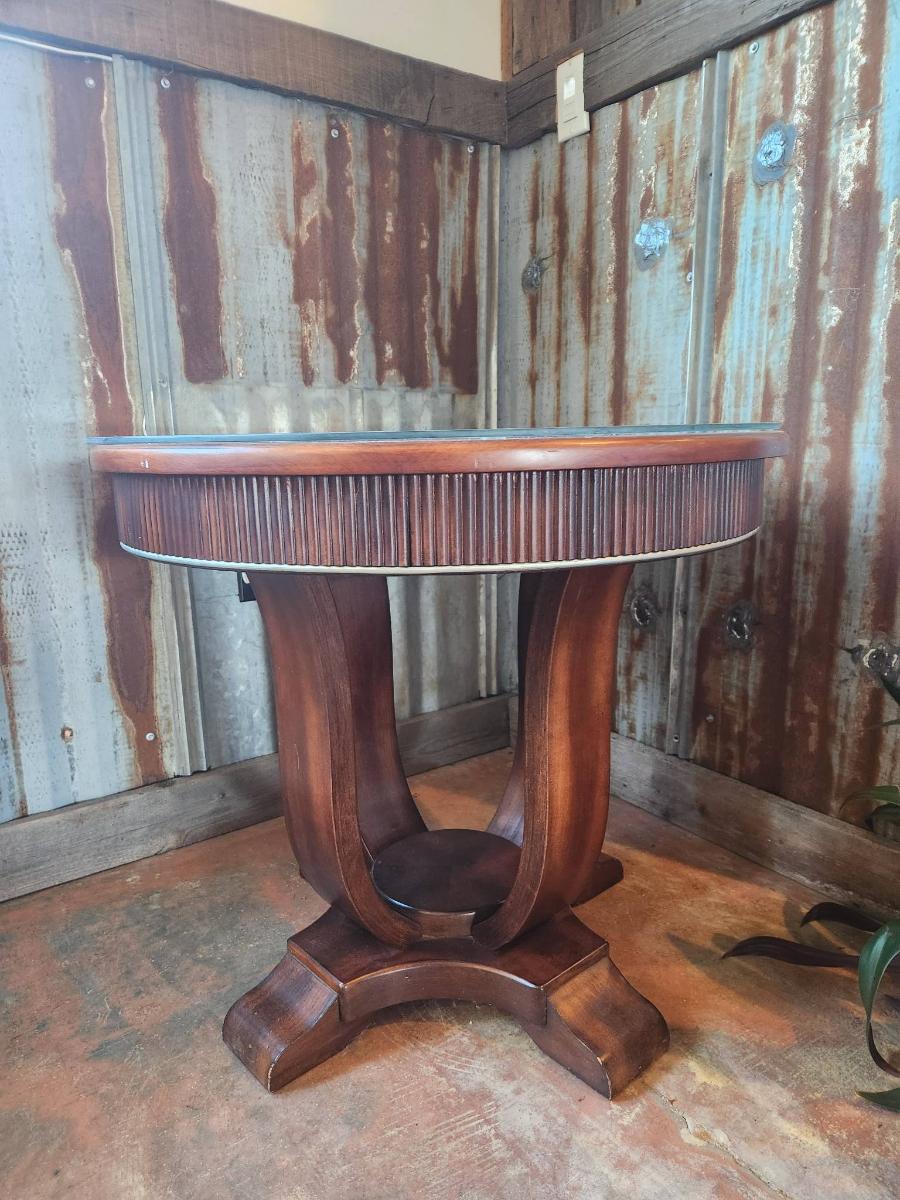 Round accent table featuring a wood base with vertical detailing on the apron and a unique pedestal-style support. The tabletop is clear glass with beveled edges, secured atop the wooden frame. Appears to combine functional design with aesthetic detailing, suitable for various interior styles. Dimensions not specified.