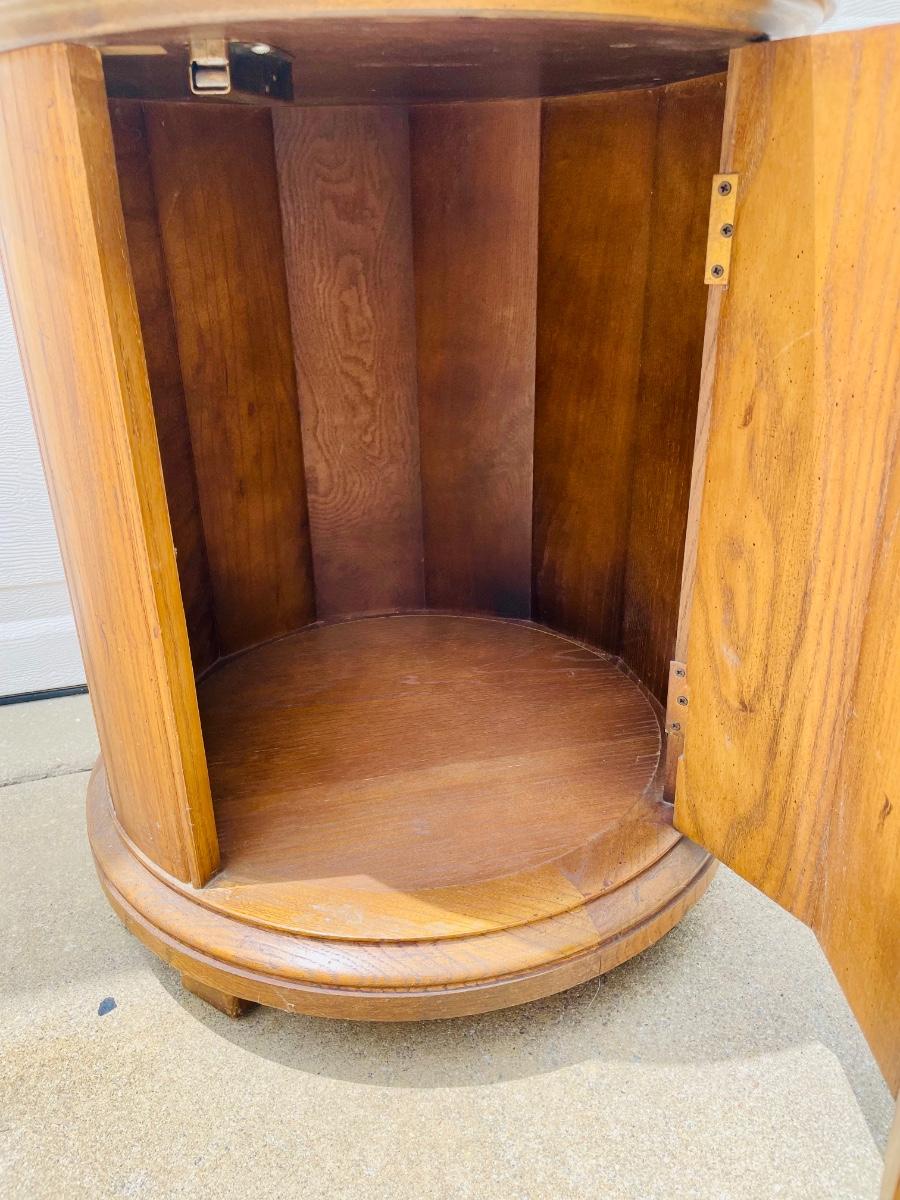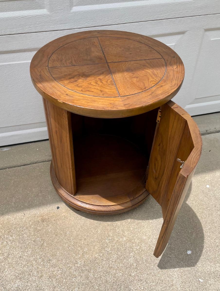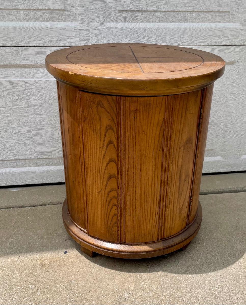 Table has a door in the base, opens to a large storage area. Approx. 22” high x 19” across the top. In good condition.