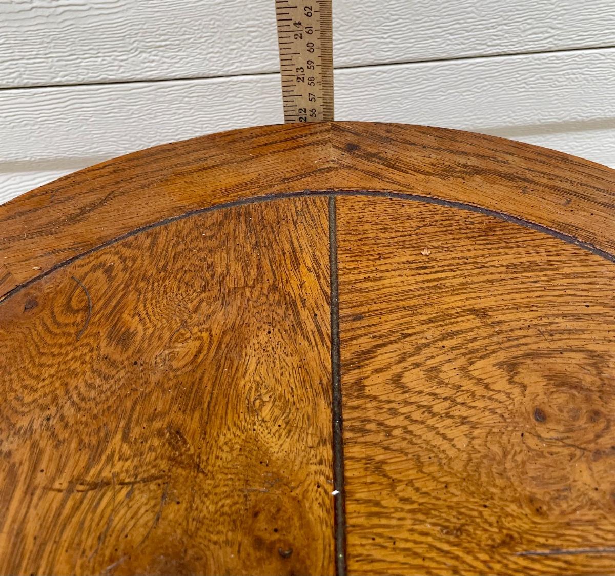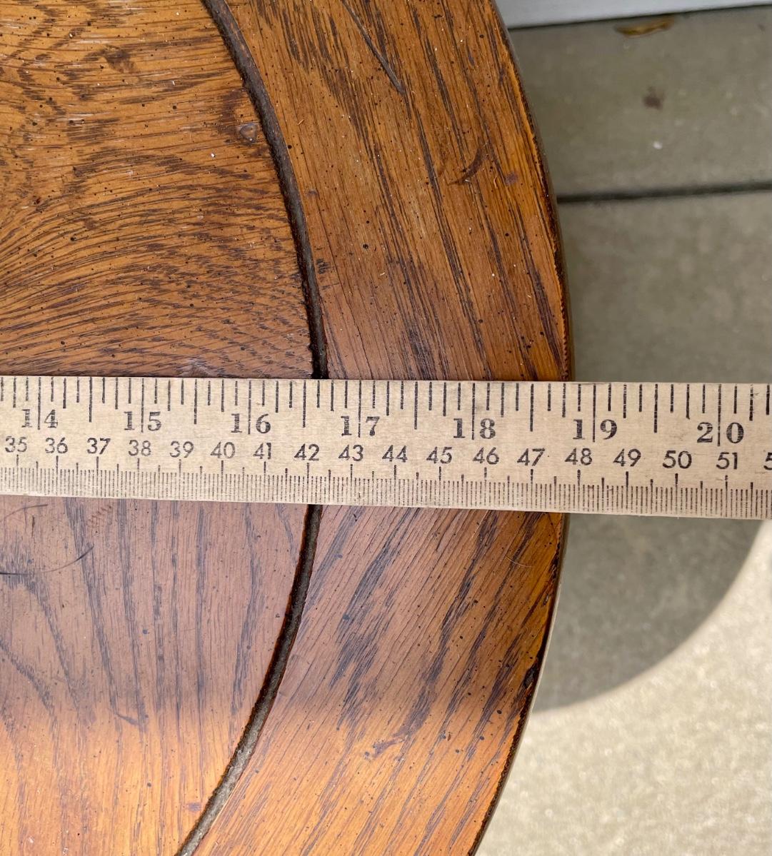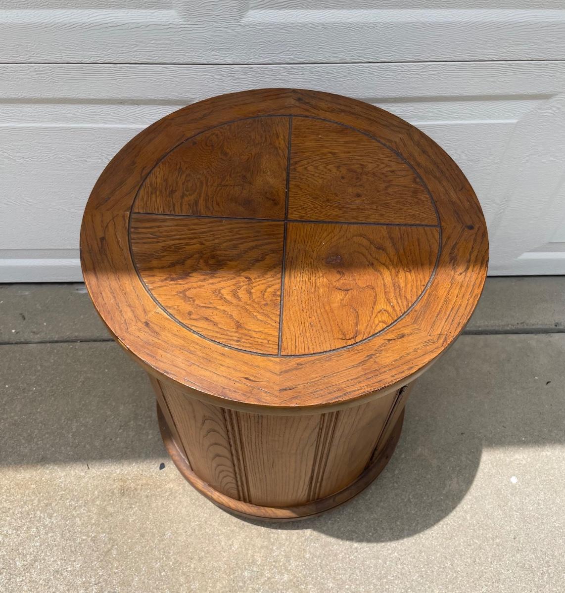 Table has a door in the base, opens to a large storage area. Approx. 22” high x 19” across the top. In good condition.