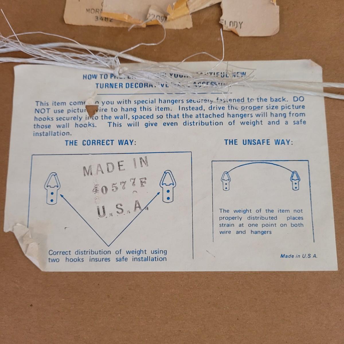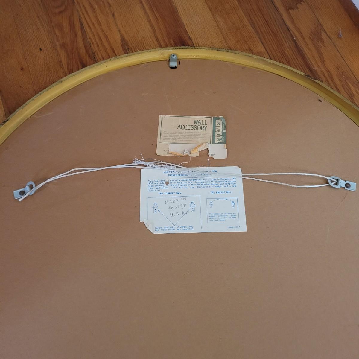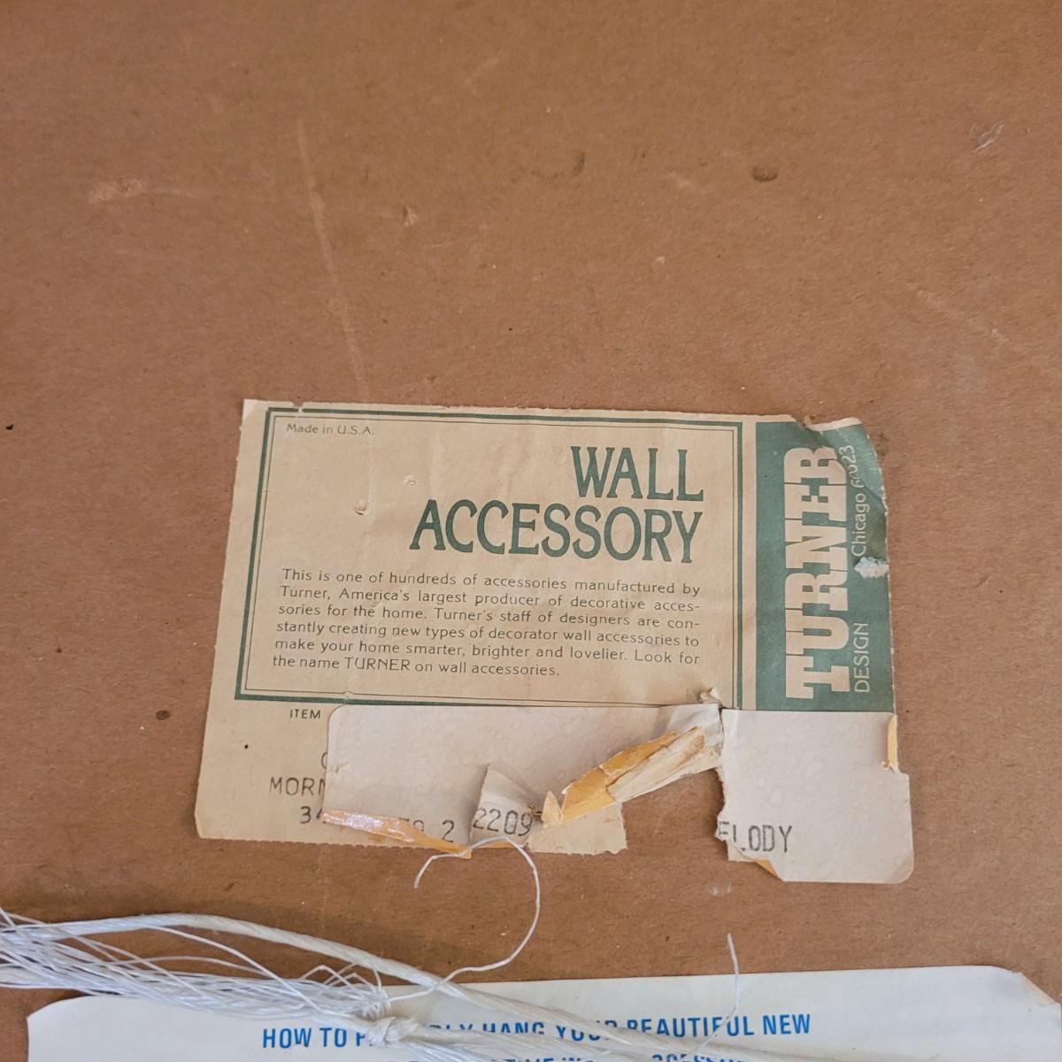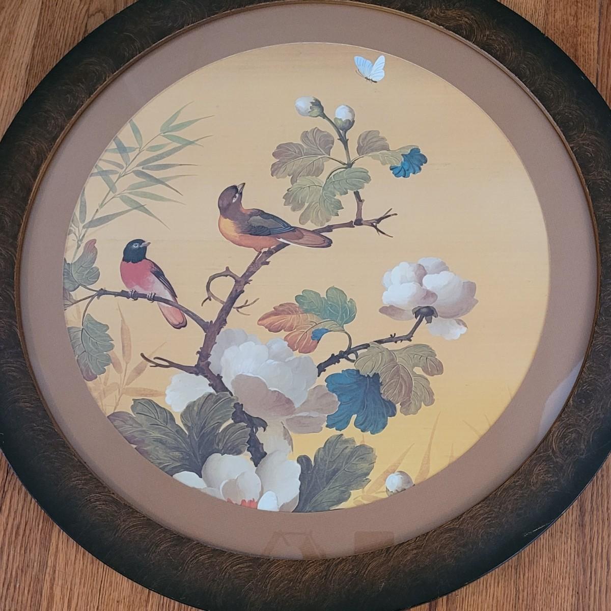 This lot includes a wall art piece in a round wooden frame. The piece depicts two songbirds on a tree branch with large white flowers. The piece was made in the U.S. by the Turner Design Company of Chicago. It is placed in a round wooden frame, matted, and under glass. Includes hanging hardware. The piece measures 28" x 28". Shipping available.Shipping available. Shipping can be costly. We suggest contacting our preferred local shipping provider, Postage Express, with dimensions and getting an estimate before bidding: (828) 255-9250 or shipping@postageexpressnc.com.