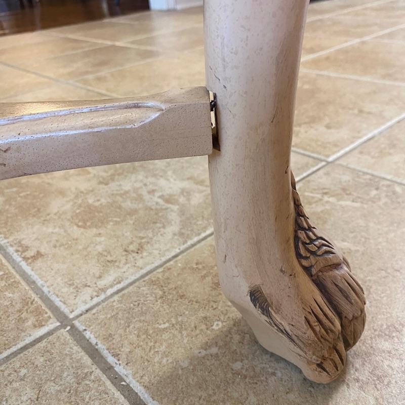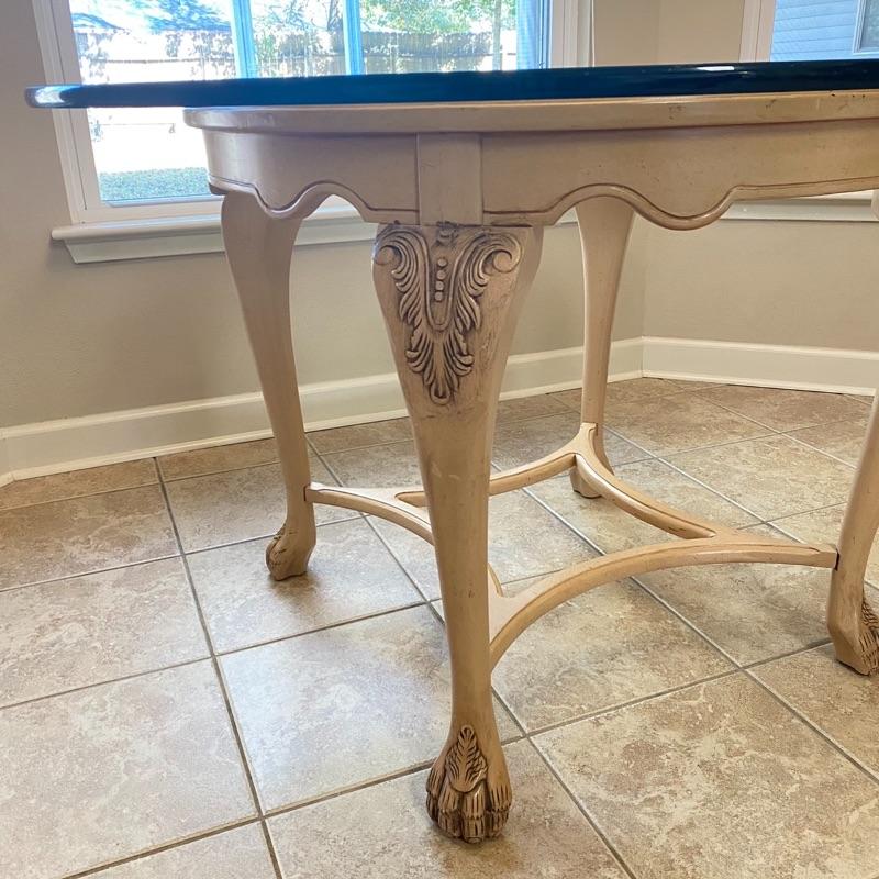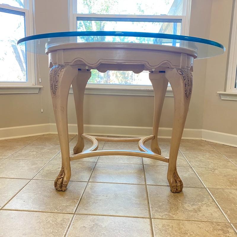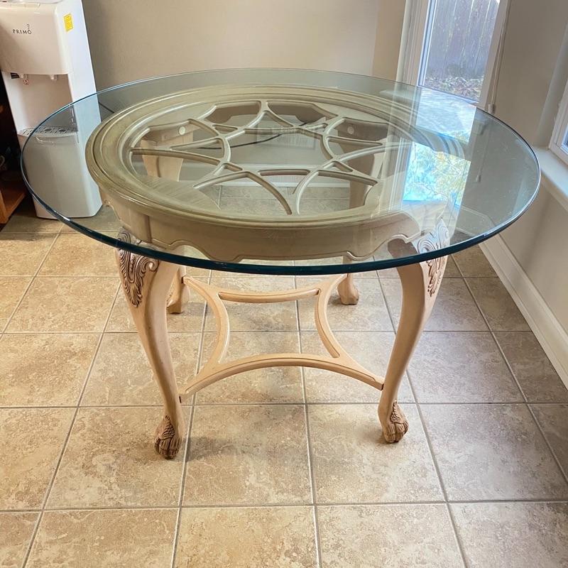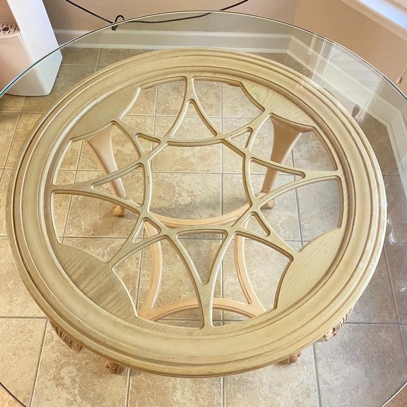 31” H x 48” Round / Some surface glass scratches / Leg needs minor screw repair to tighten / Beautiful Wood detail