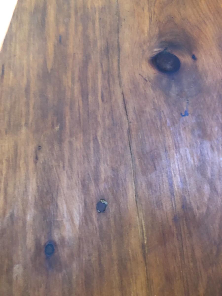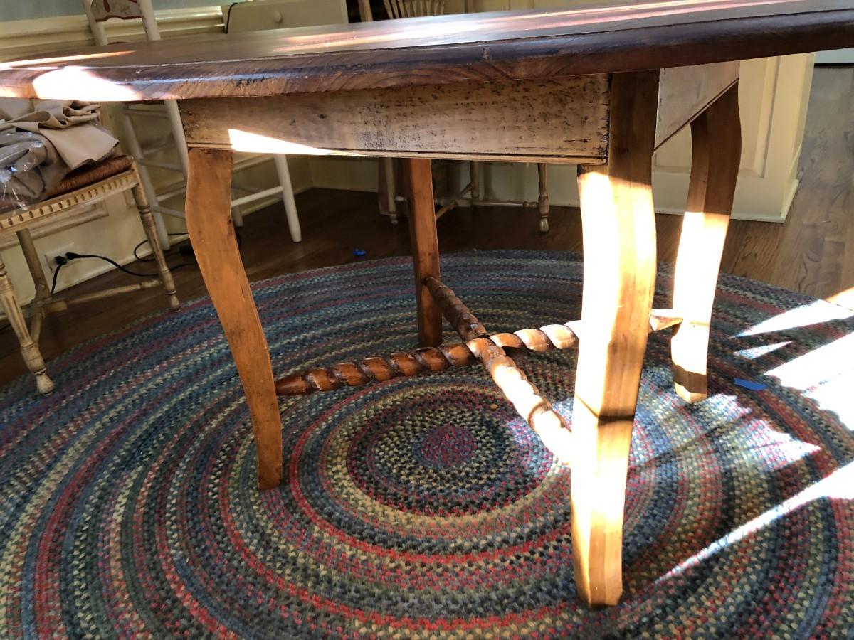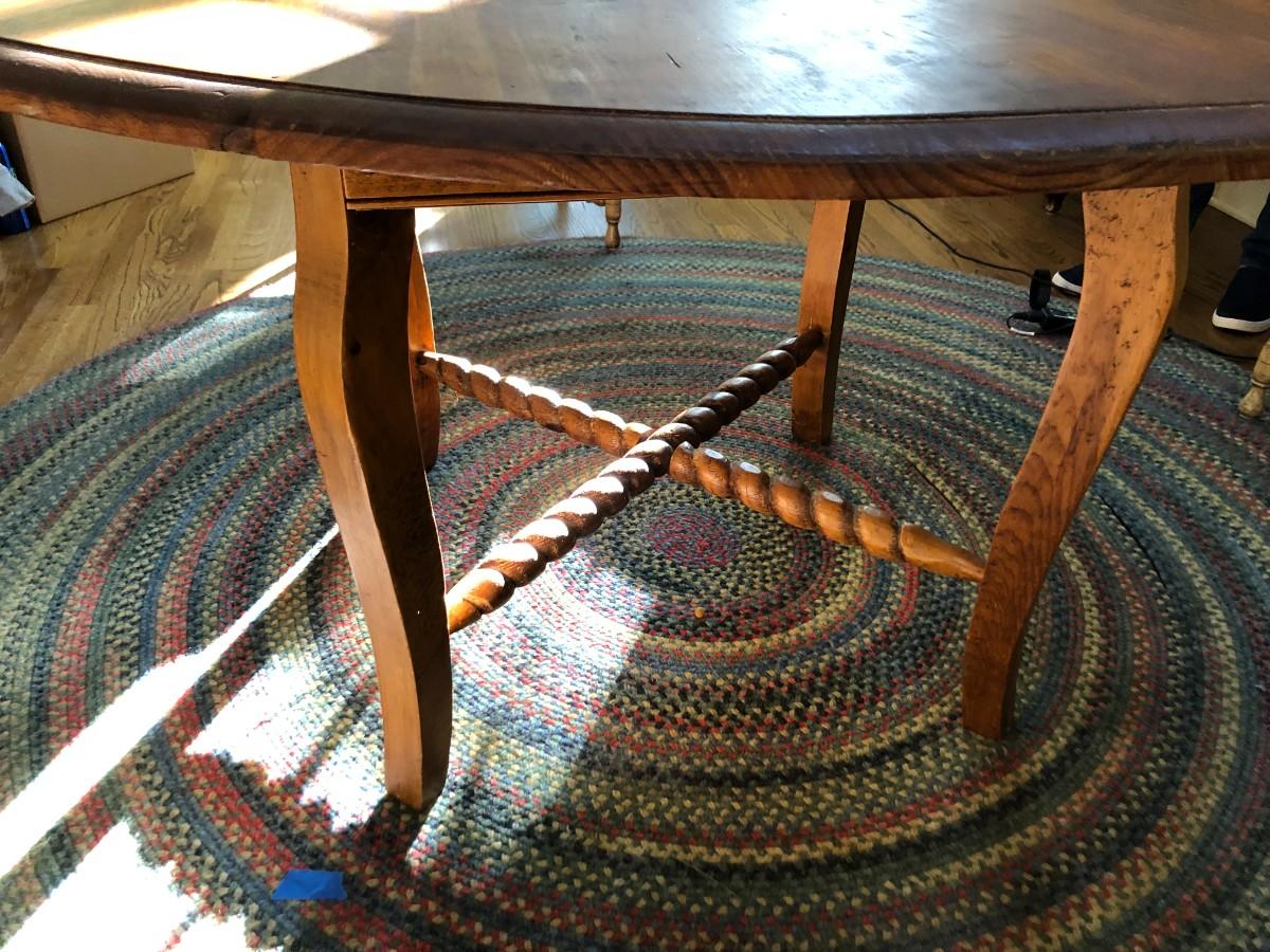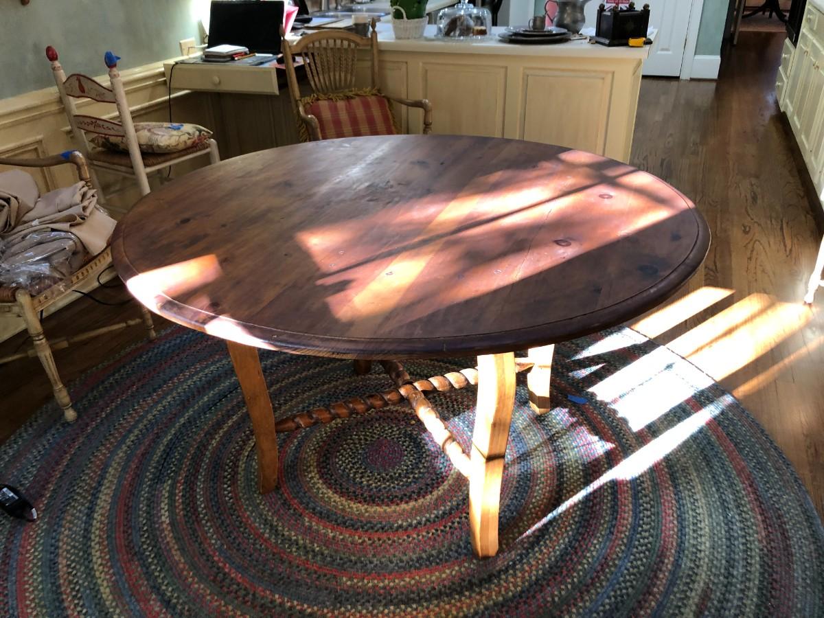 Wonderful wood table with scrolled cross supports measures 53" diameter x 30" tall