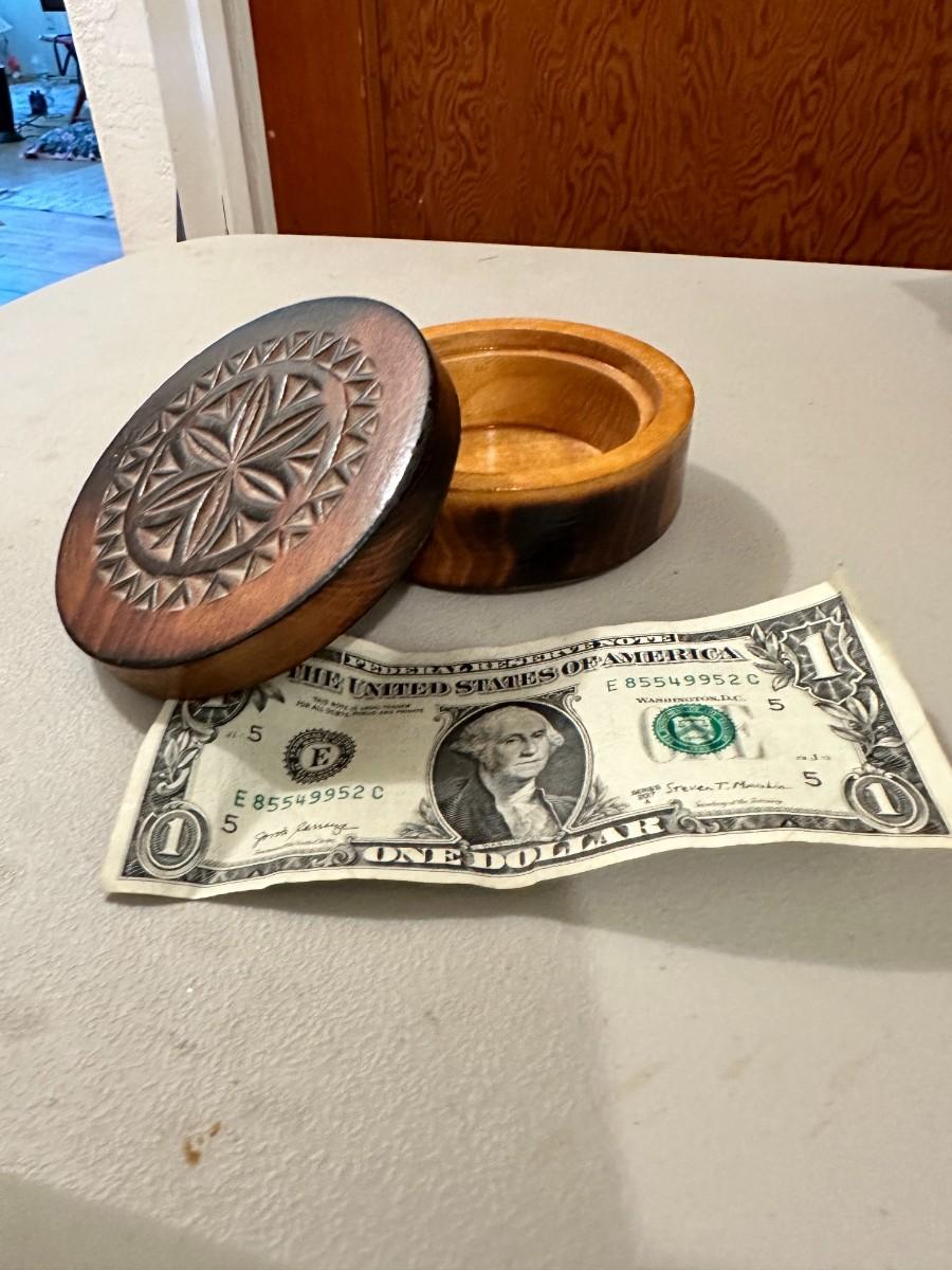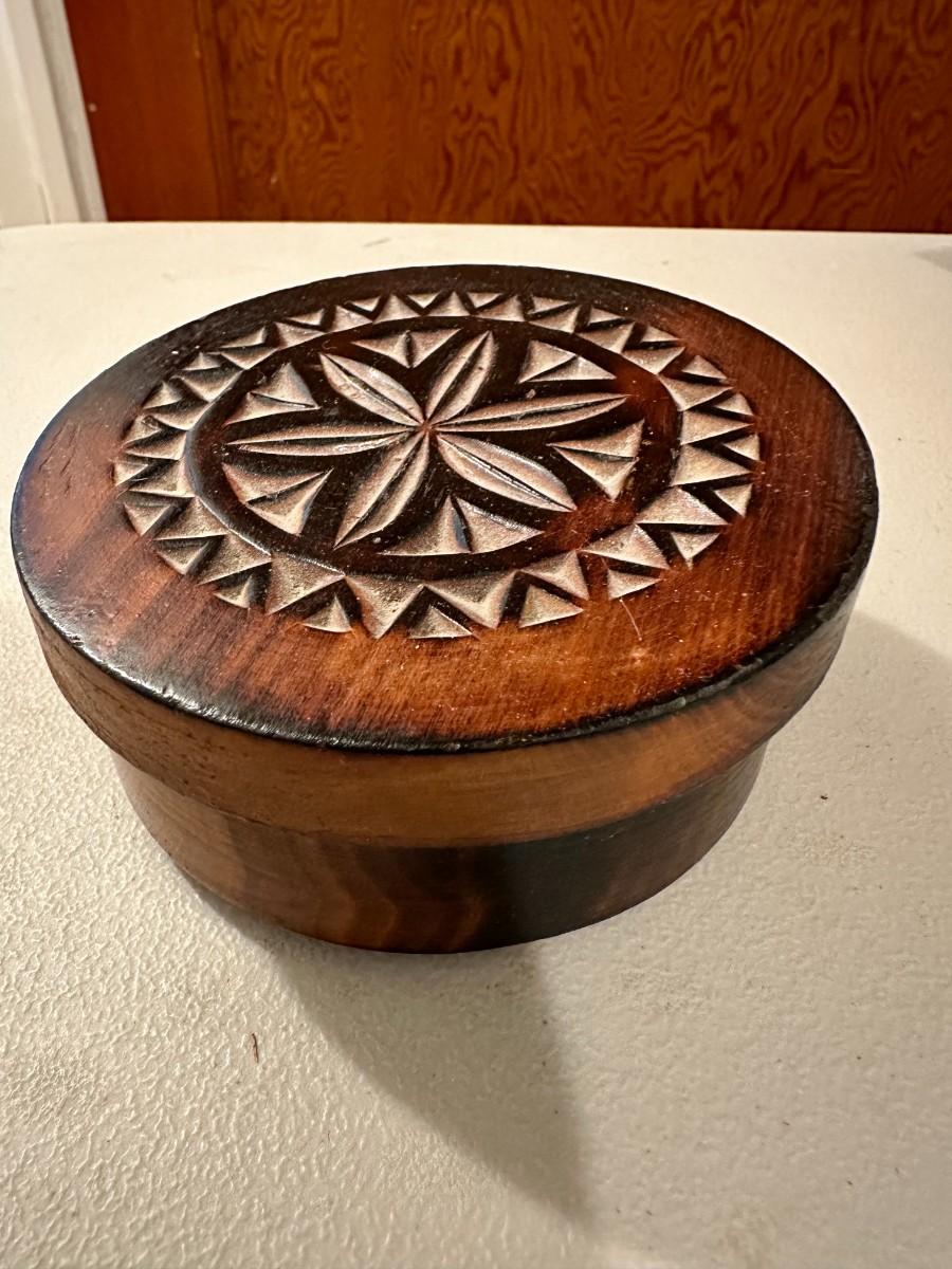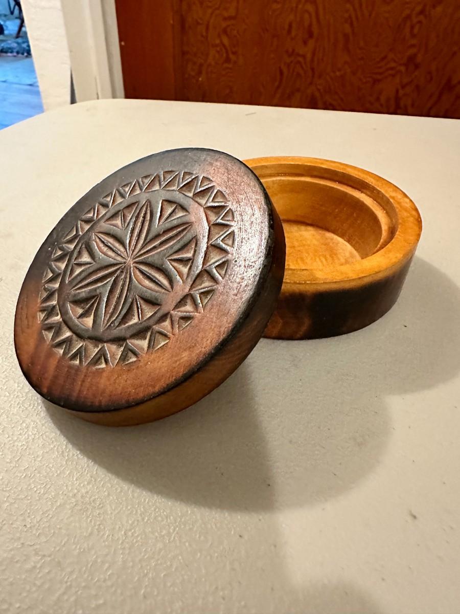Round Wood Mini Jewelry Box with Hand-Carved Floral Motif, "Majestic Flower"