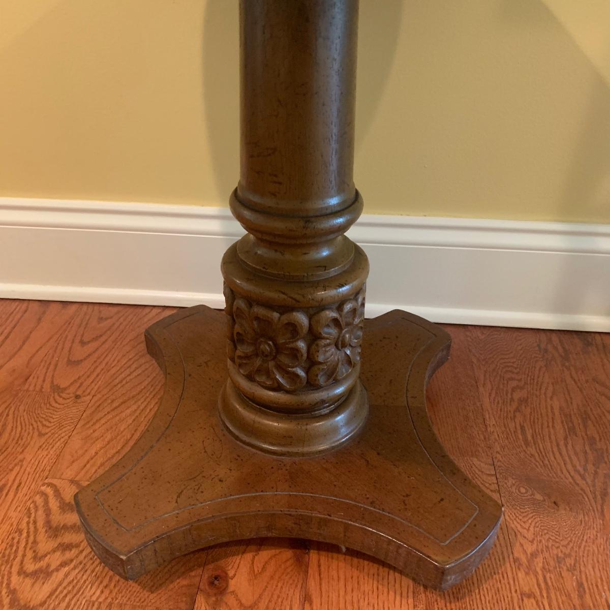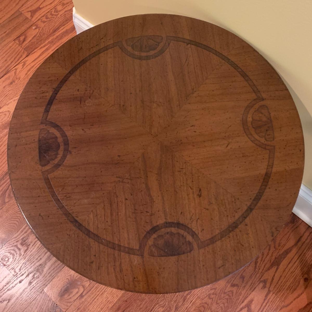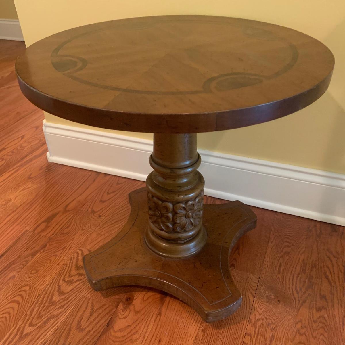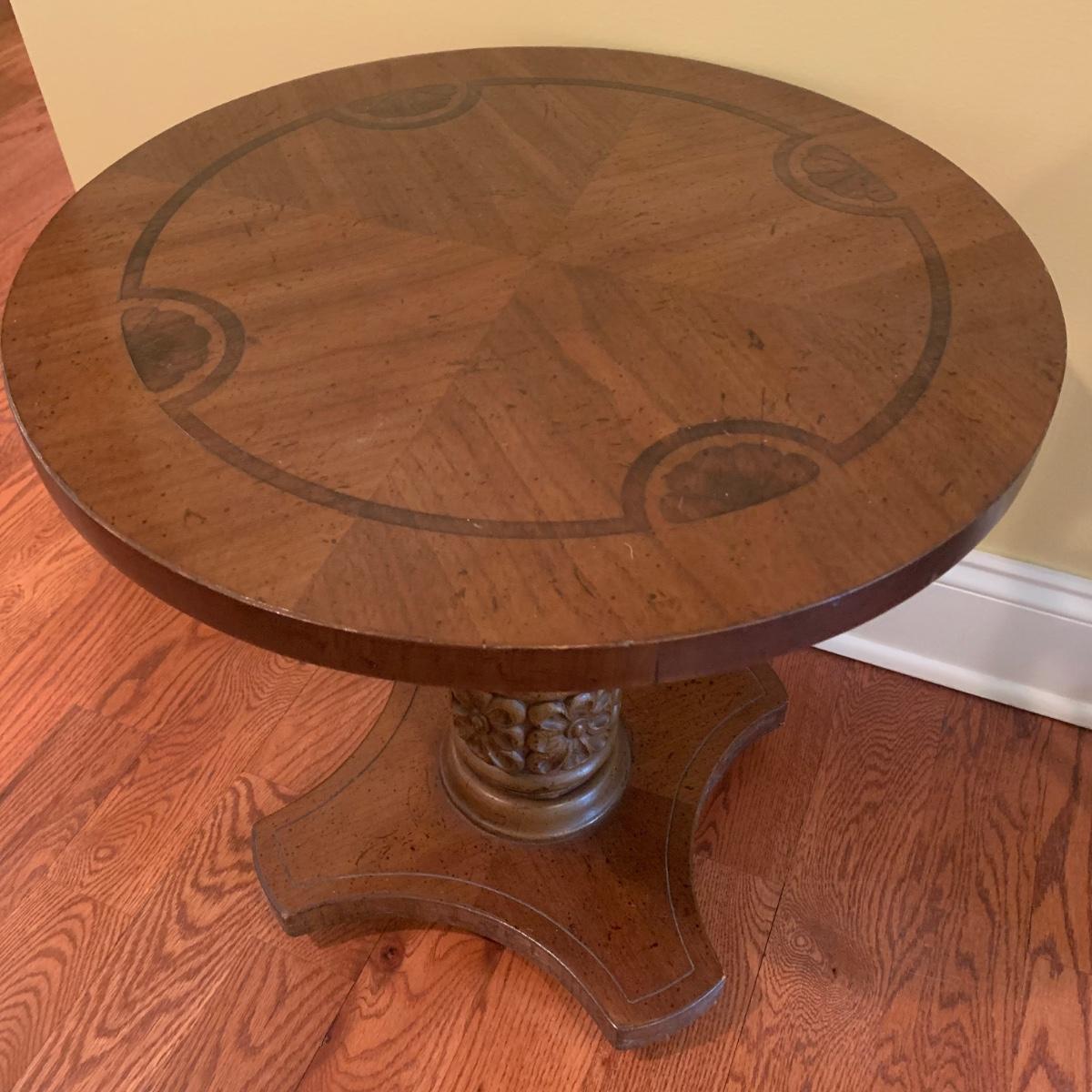 Small wooden side table with inlaid wood design. Table is footed with floral designs around the base and measures, 19”D x 19”H. Local pickup only.