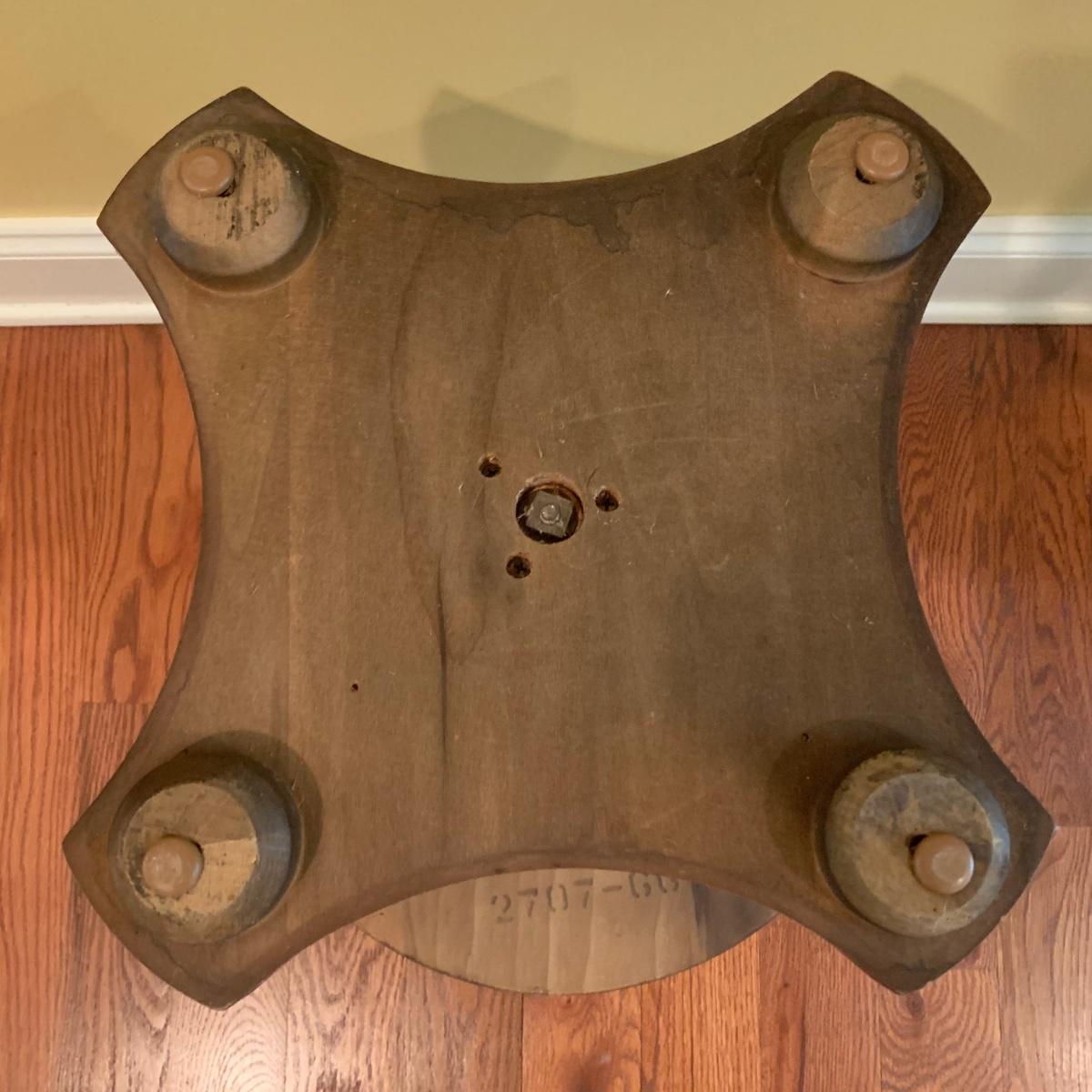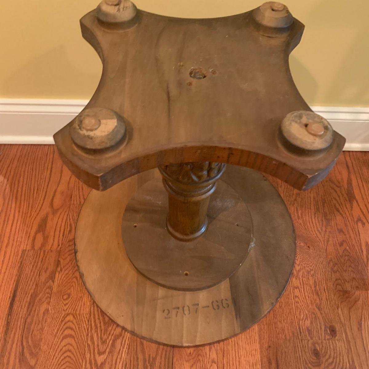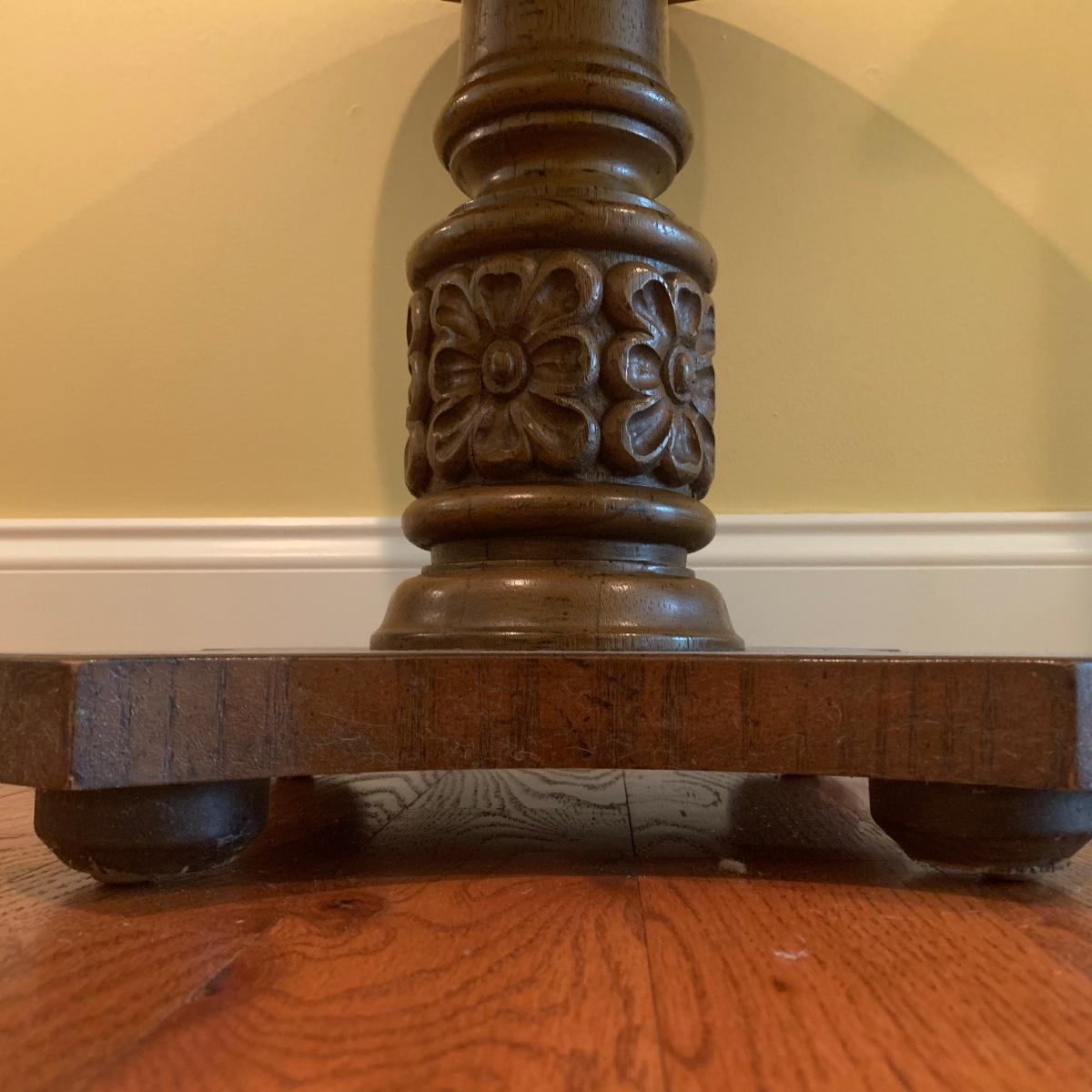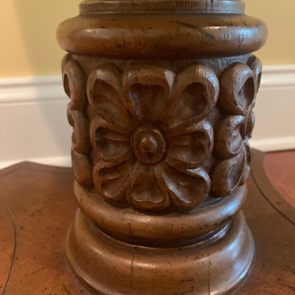 Small wooden side table with inlaid wood design. Table is footed with floral designs around the base and measures, 19”D x 19”H. Local pickup only.