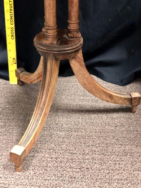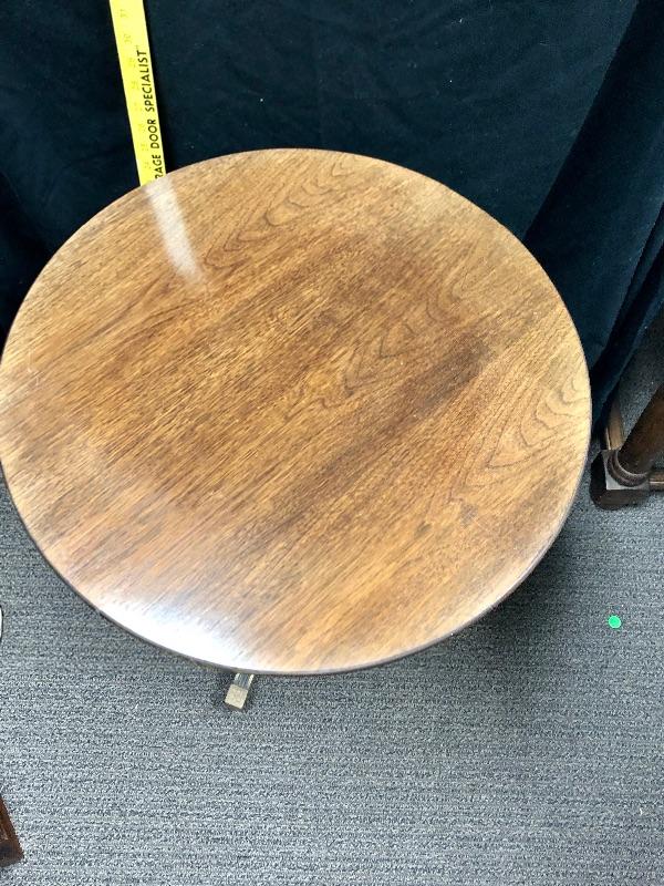 Round wood side table. center support with three legs. Glass top protector. Has some fading and discoloration from age. Stands about 26" tall.