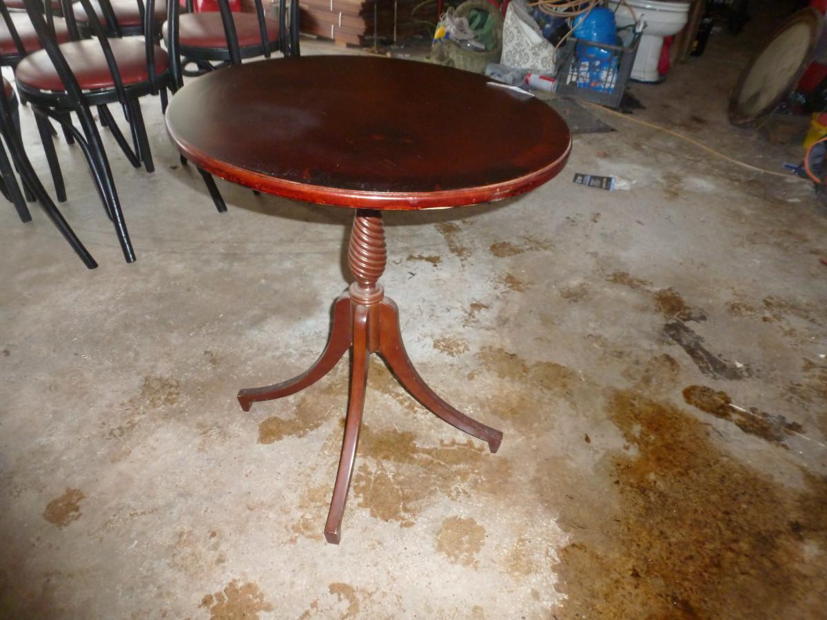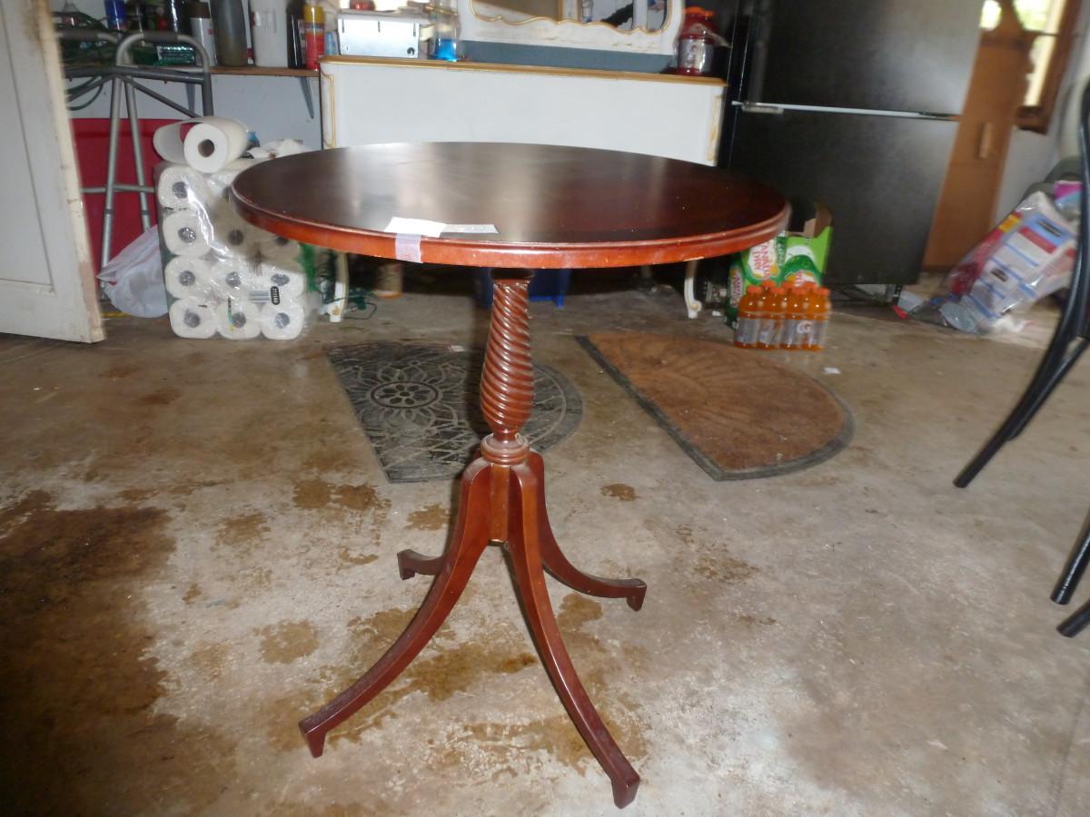 Round Wooden Accent Table. Measures approx 22" in diameter, 27" tall.