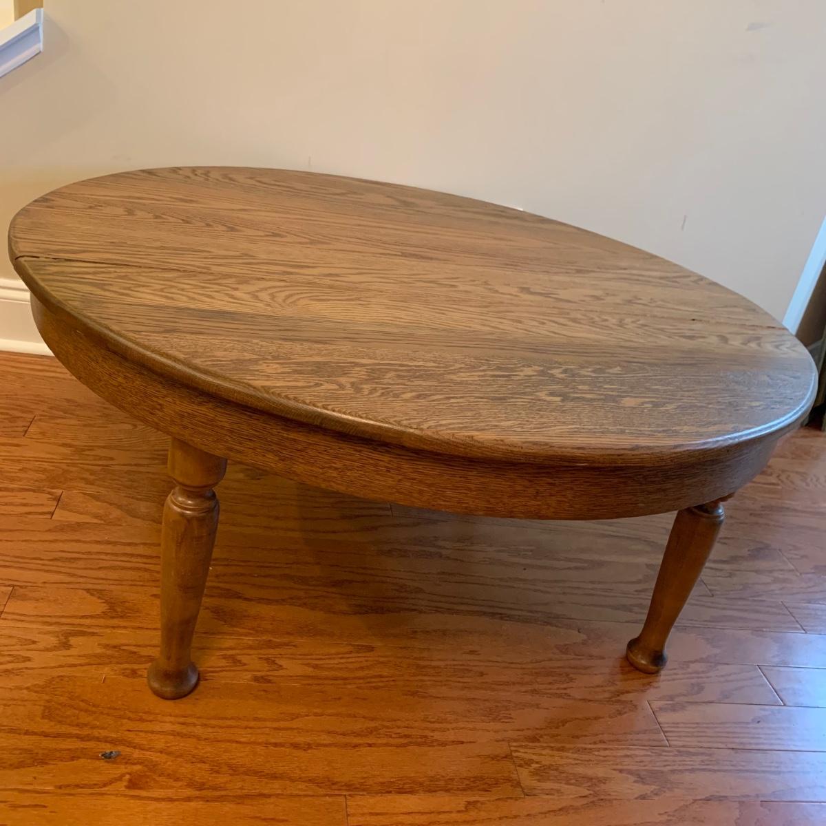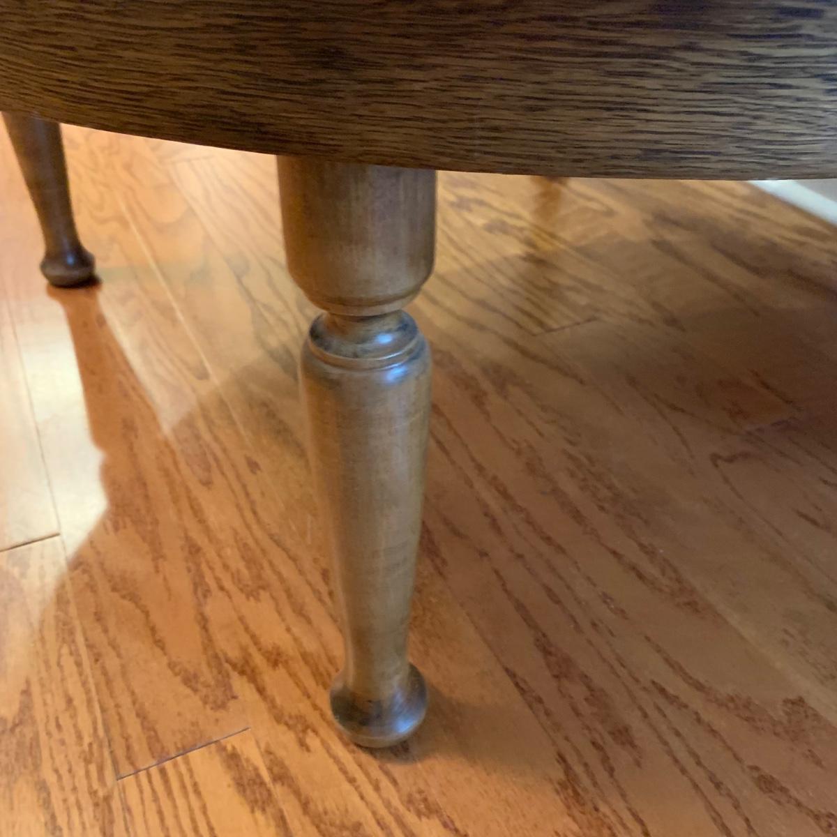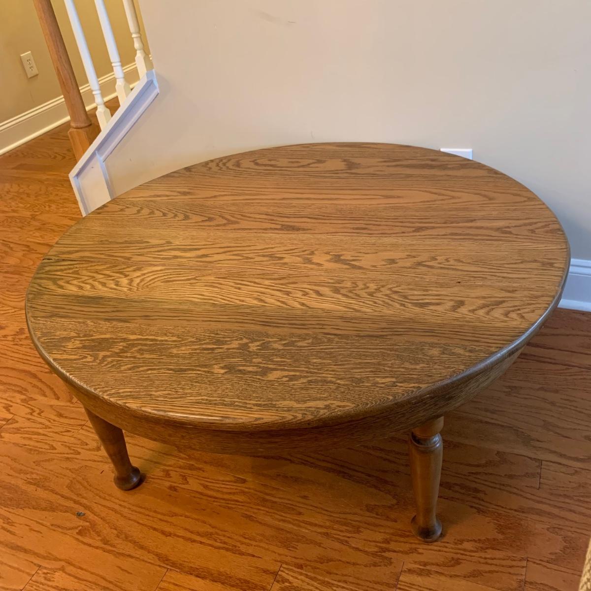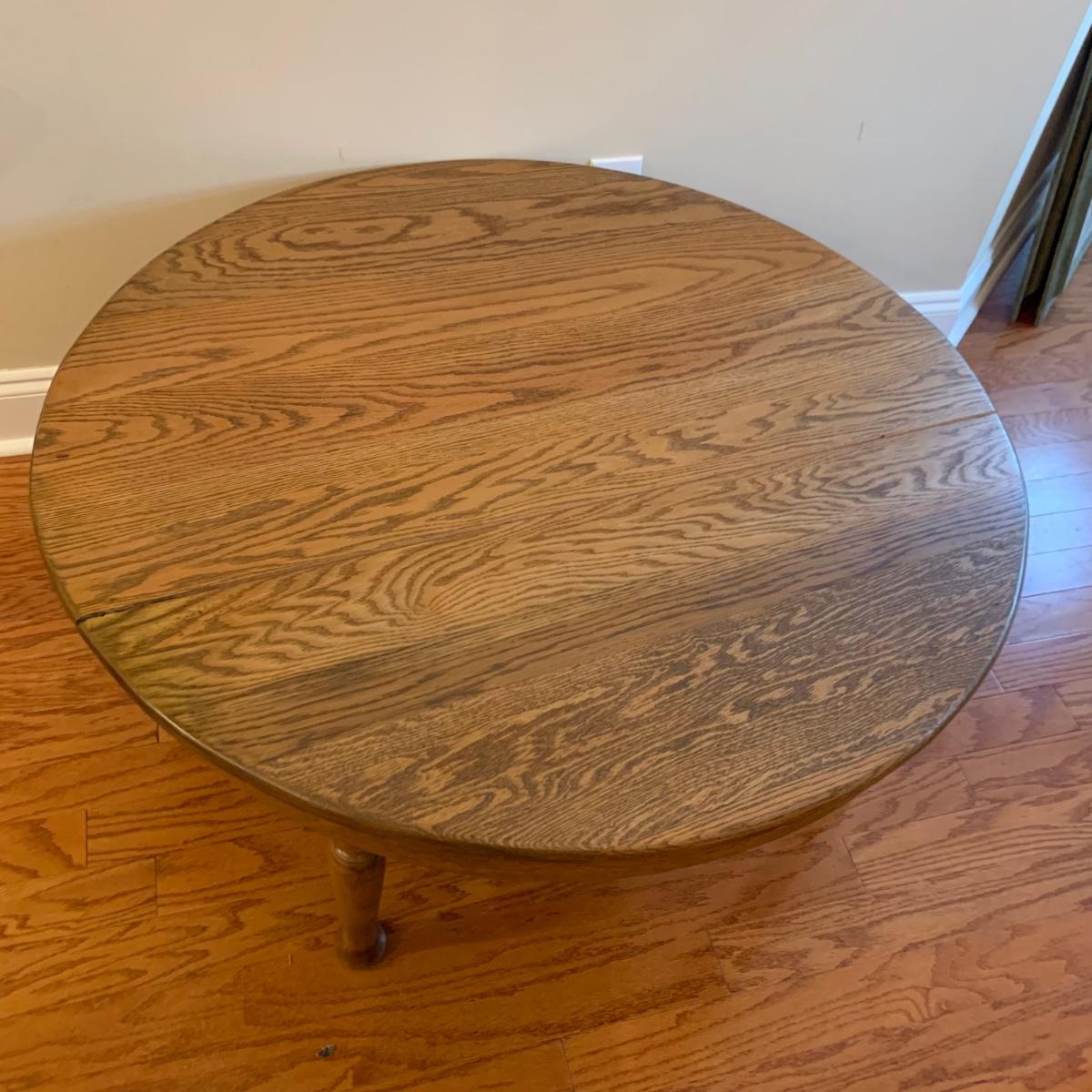 Round solid wood coffee table measures 41”D x 17”H. Note the crack on the surface. Could likely be repaired.