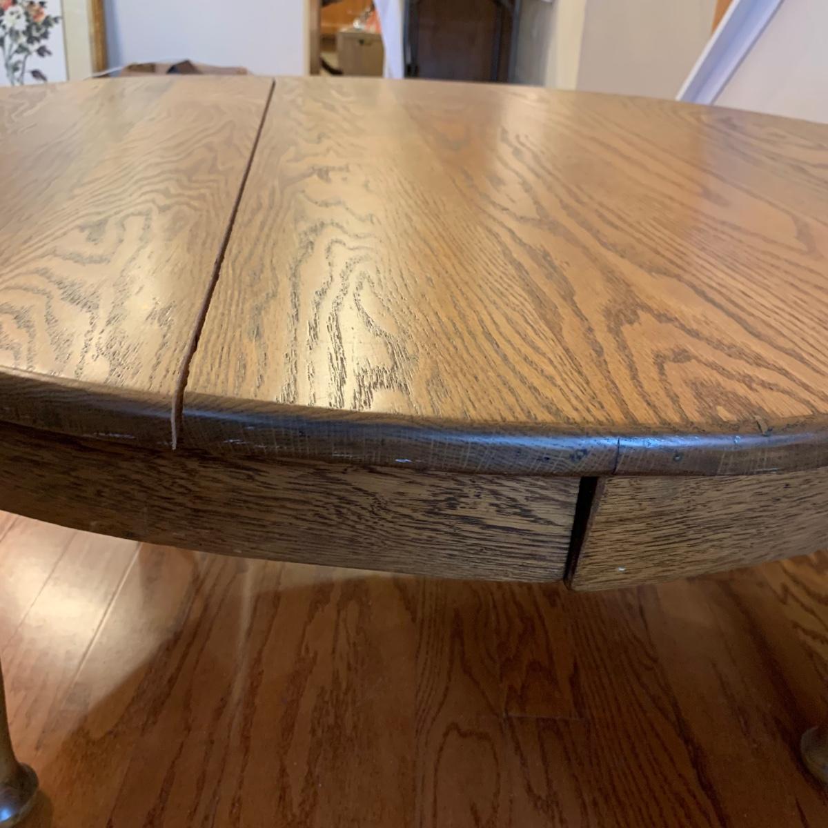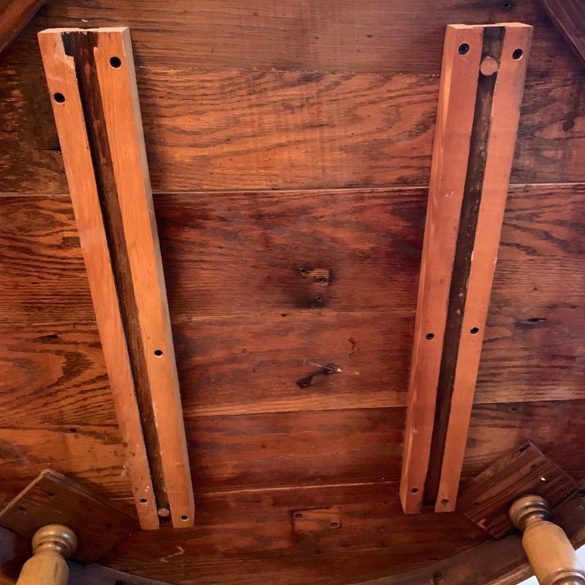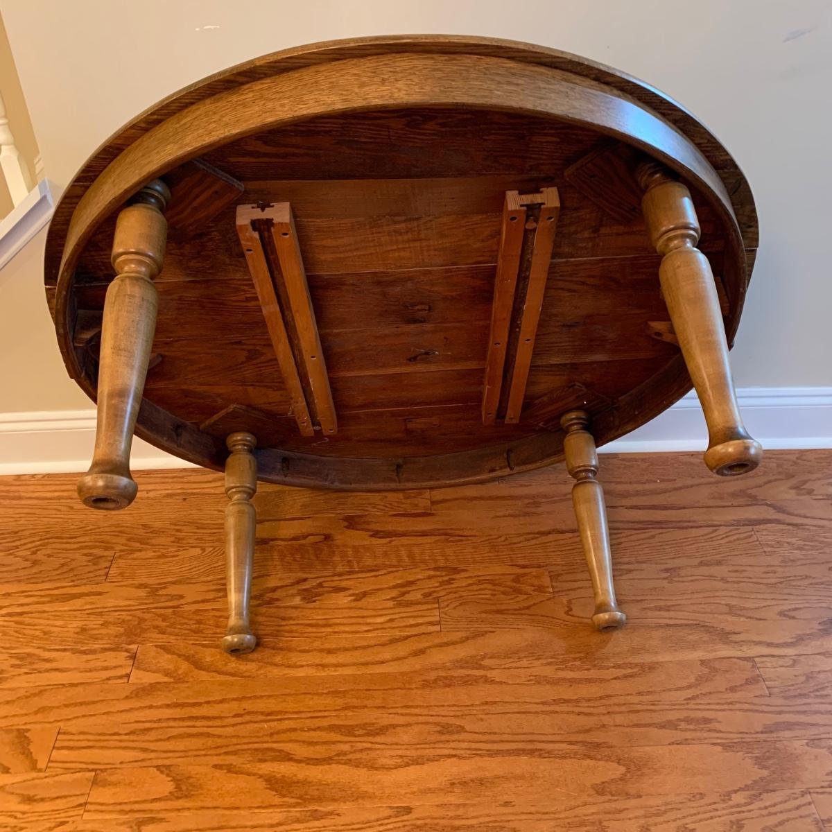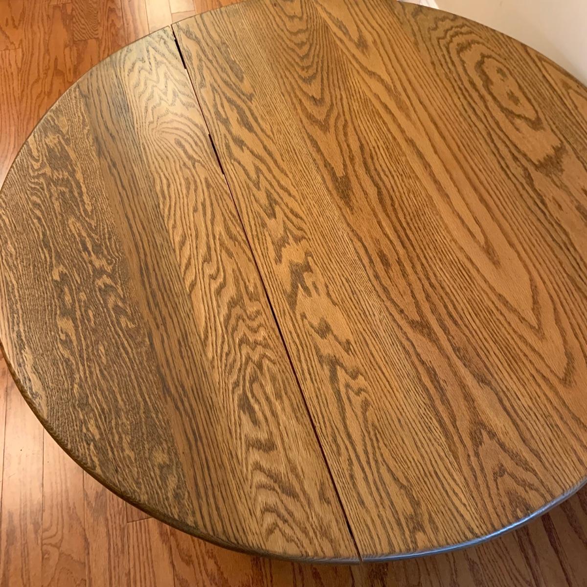 Round solid wood coffee table measures 41”D x 17”H. Note the crack on the surface. Could likely be repaired.