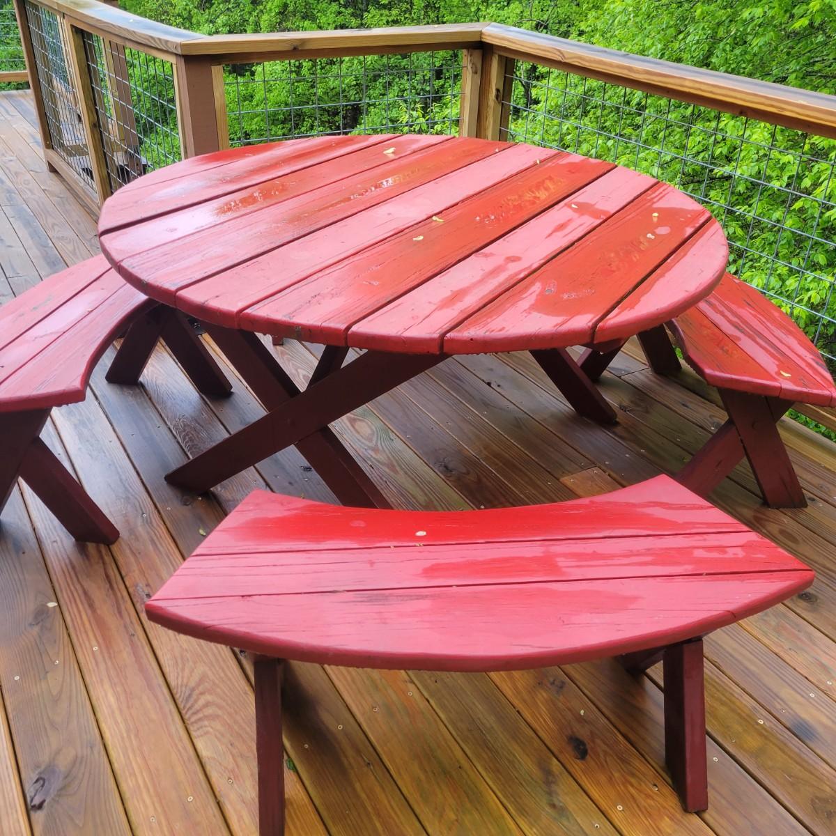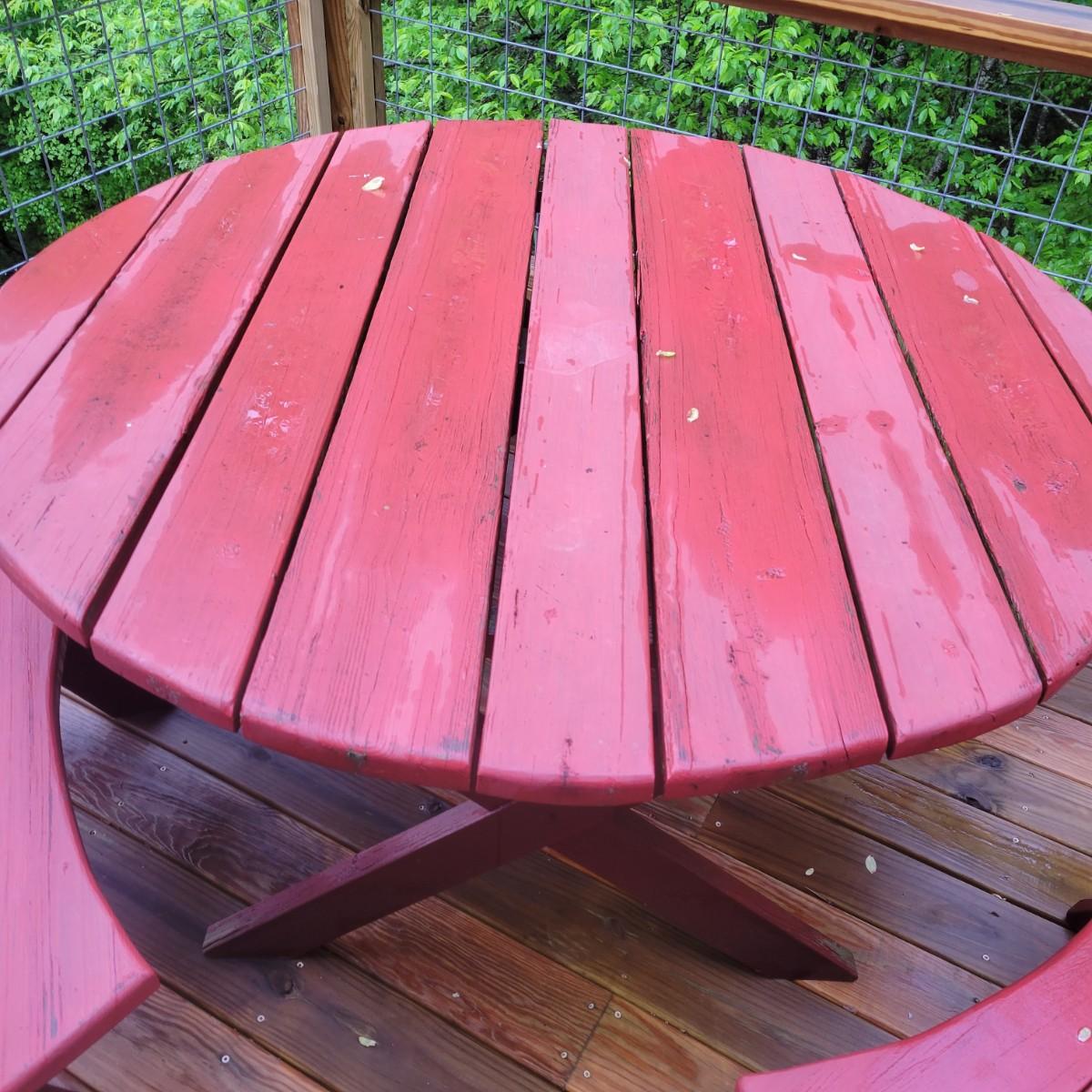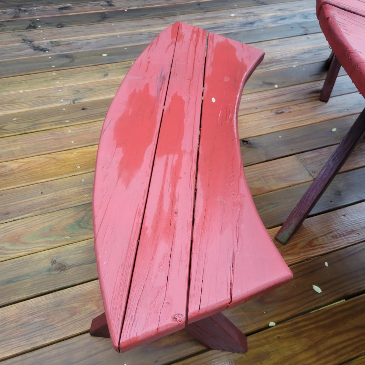 A round wooden picnic table with four curved benches that are all painted red. The table measures approximately 48"D x 28"H. The benches measure approximately 42" x 15" x 17"H. Local pickup only. Winning bidder must bring assistance to help move and load this item due to its weight and/or size.
