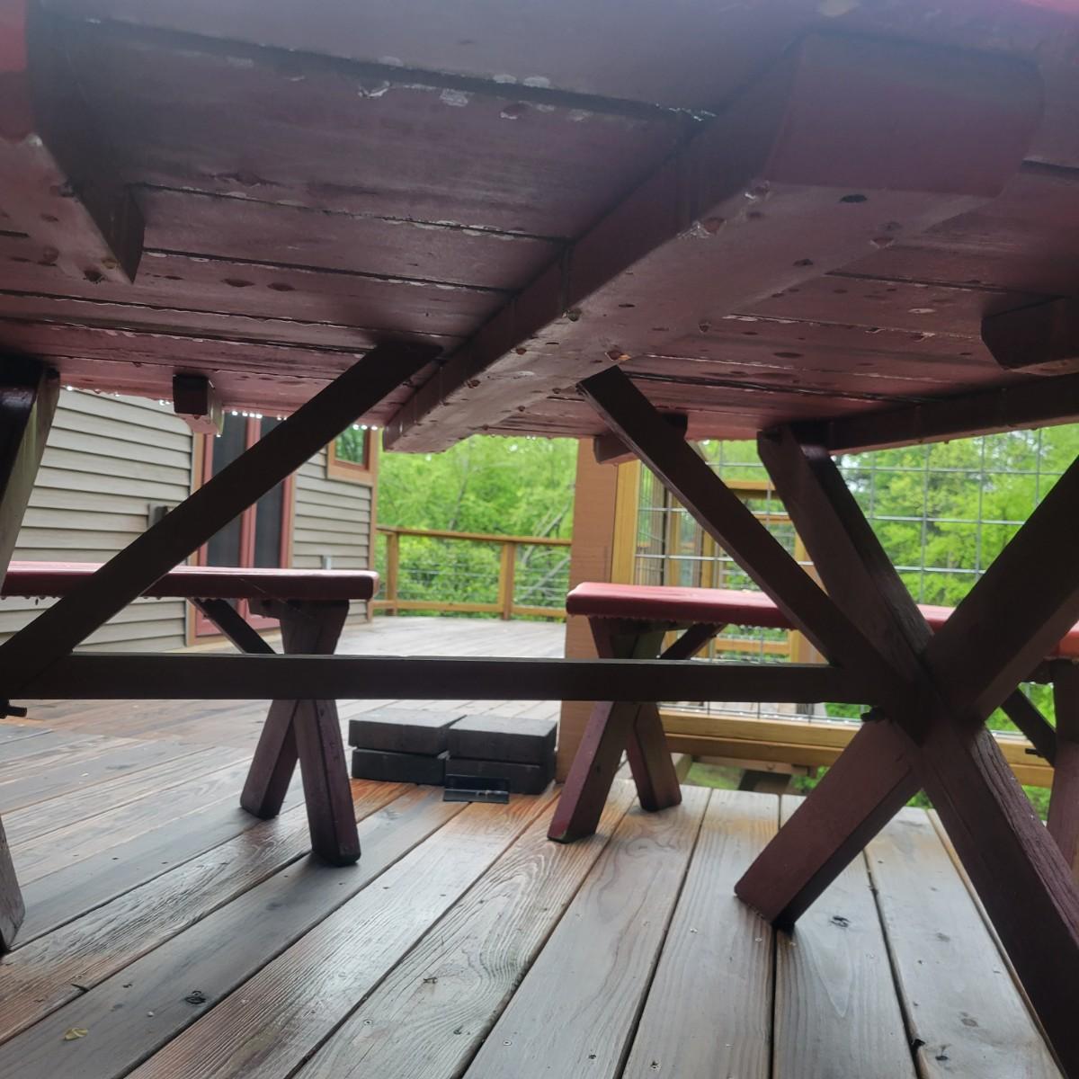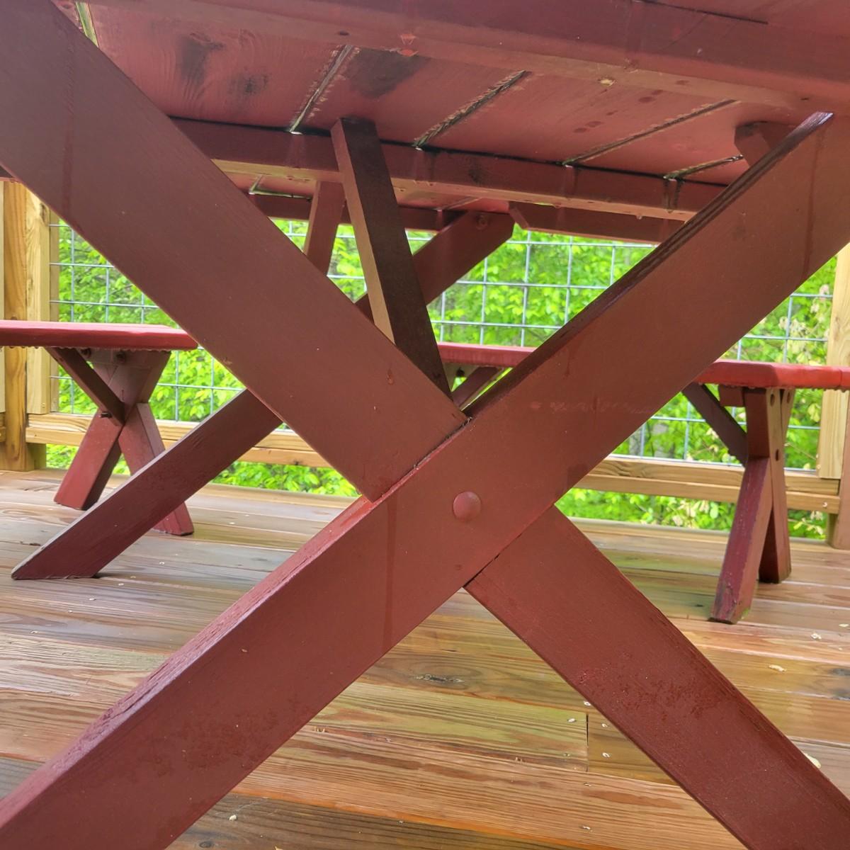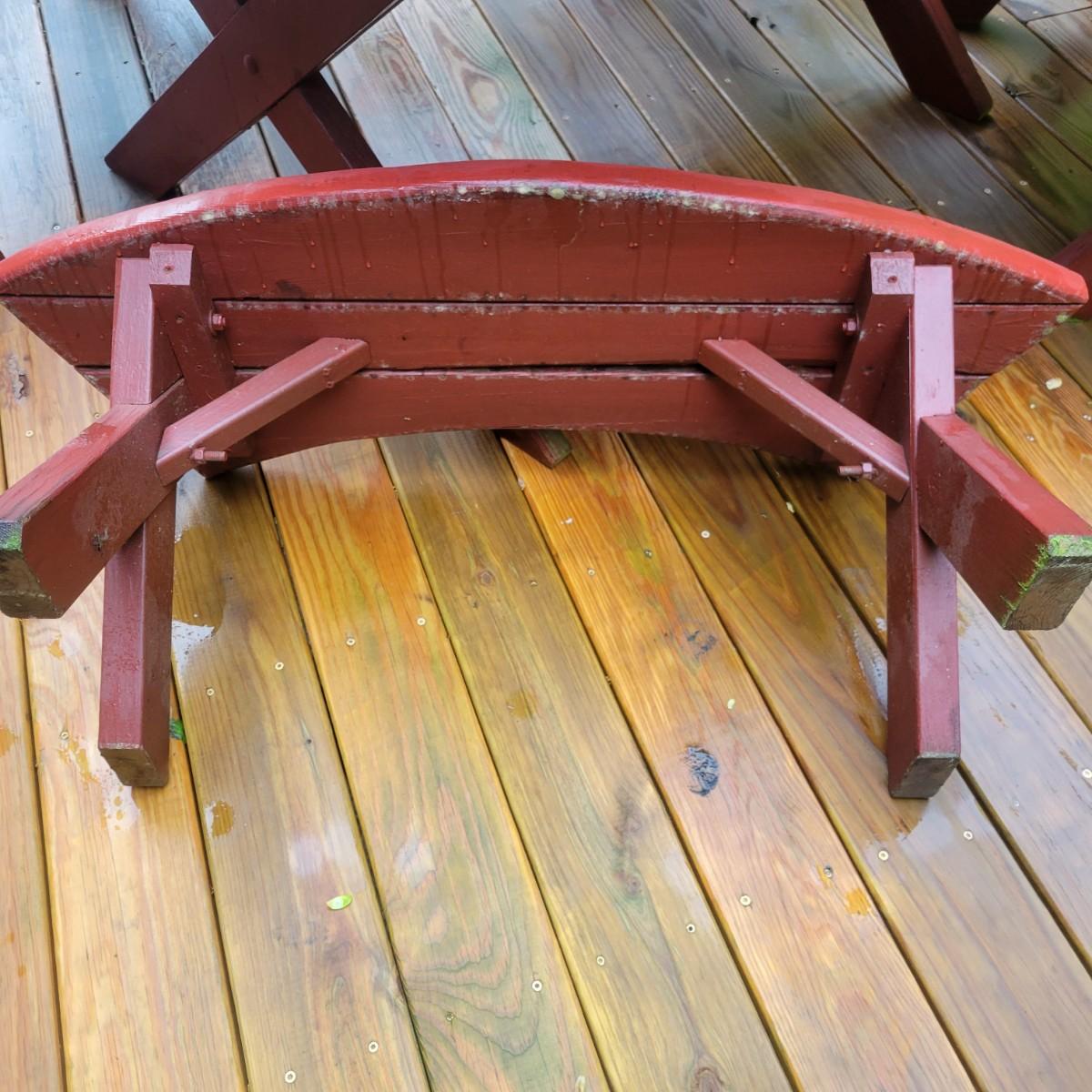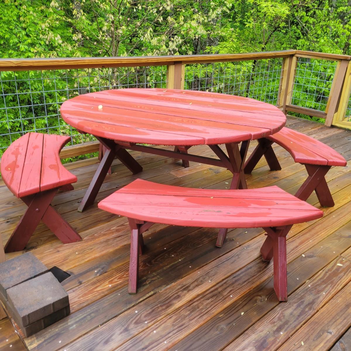 A round wooden picnic table with four curved benches that are all painted red. The table measures approximately 48"D x 28"H. The benches measure approximately 42" x 15" x 17"H. Local pickup only. Winning bidder must bring assistance to help move and load this item due to its weight and/or size.