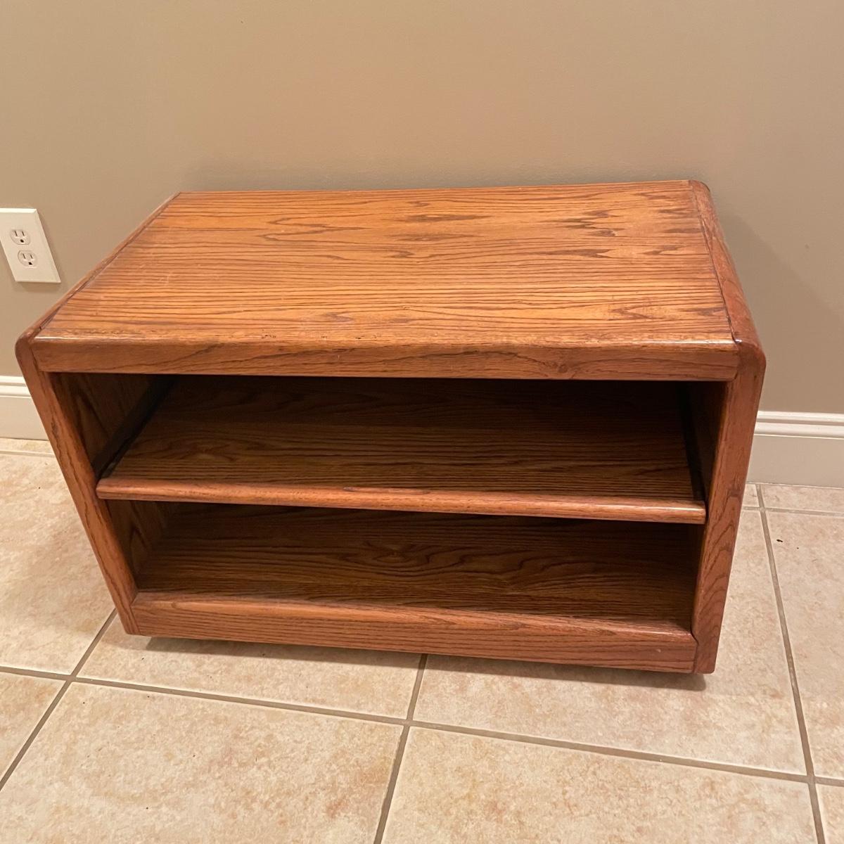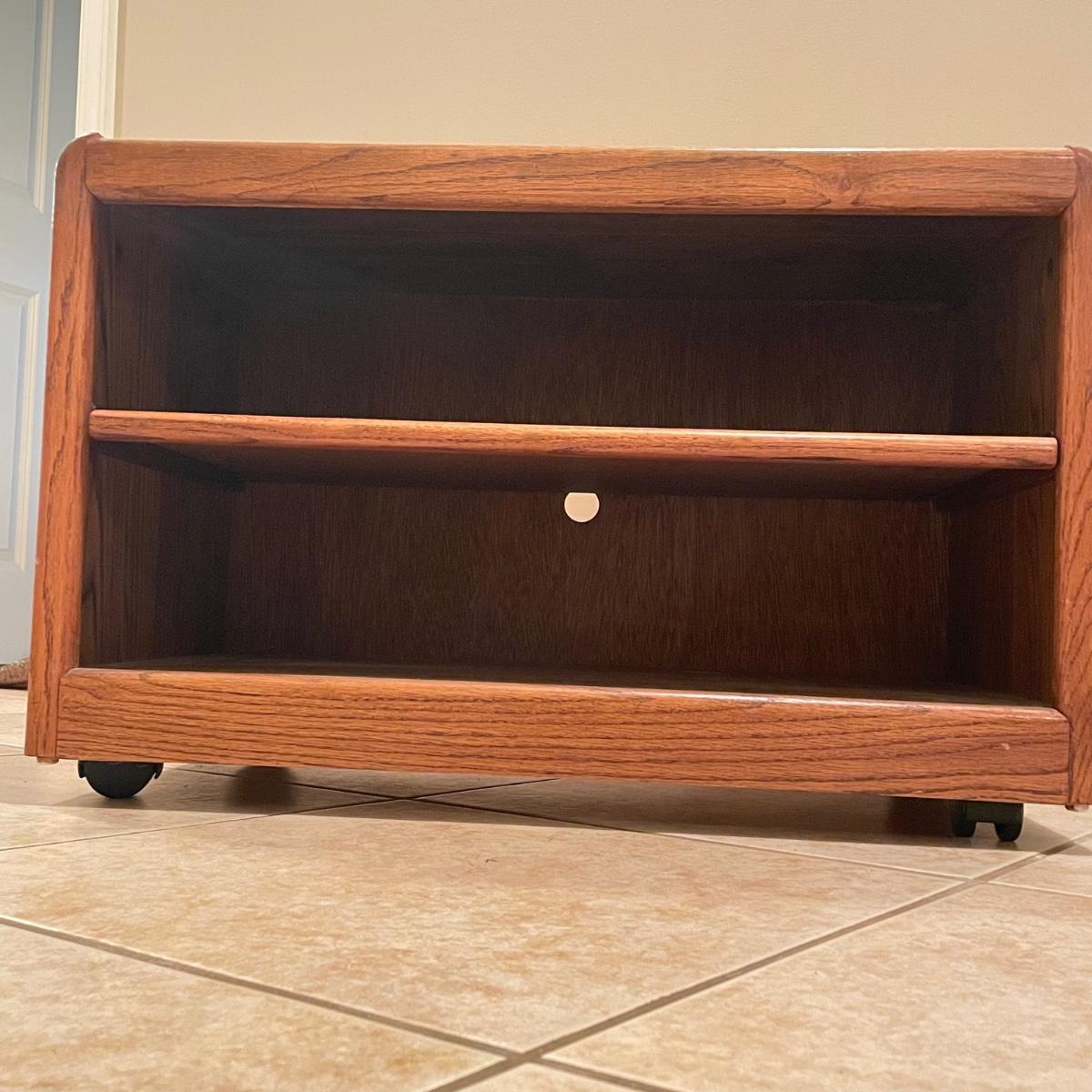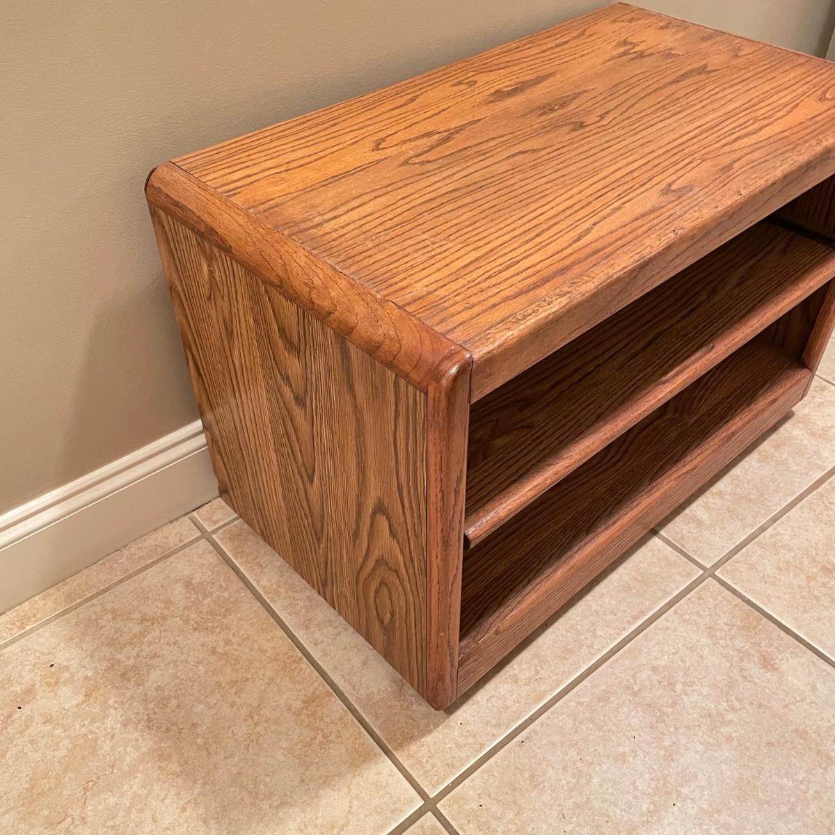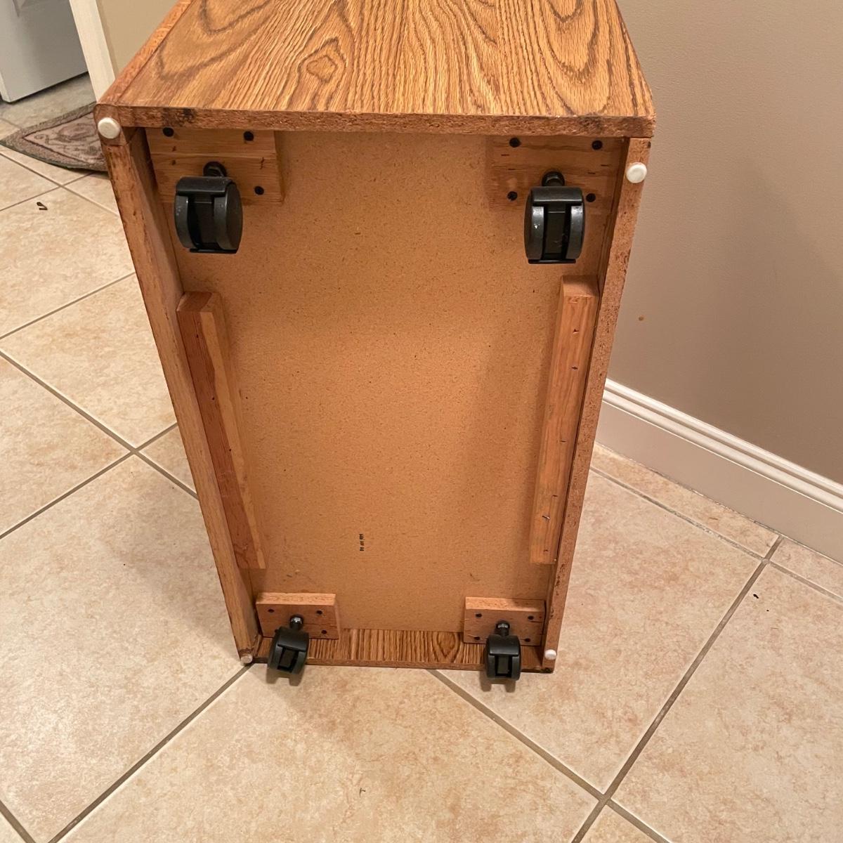A short, rounded, rolling shelf. Unit has one middle shelf on tracks letting it slide out. Piece has usual wear, and also a small area of bowed wood on the top- see photos. It measures 30” x 16.5” x 19”H. Local pick up only.