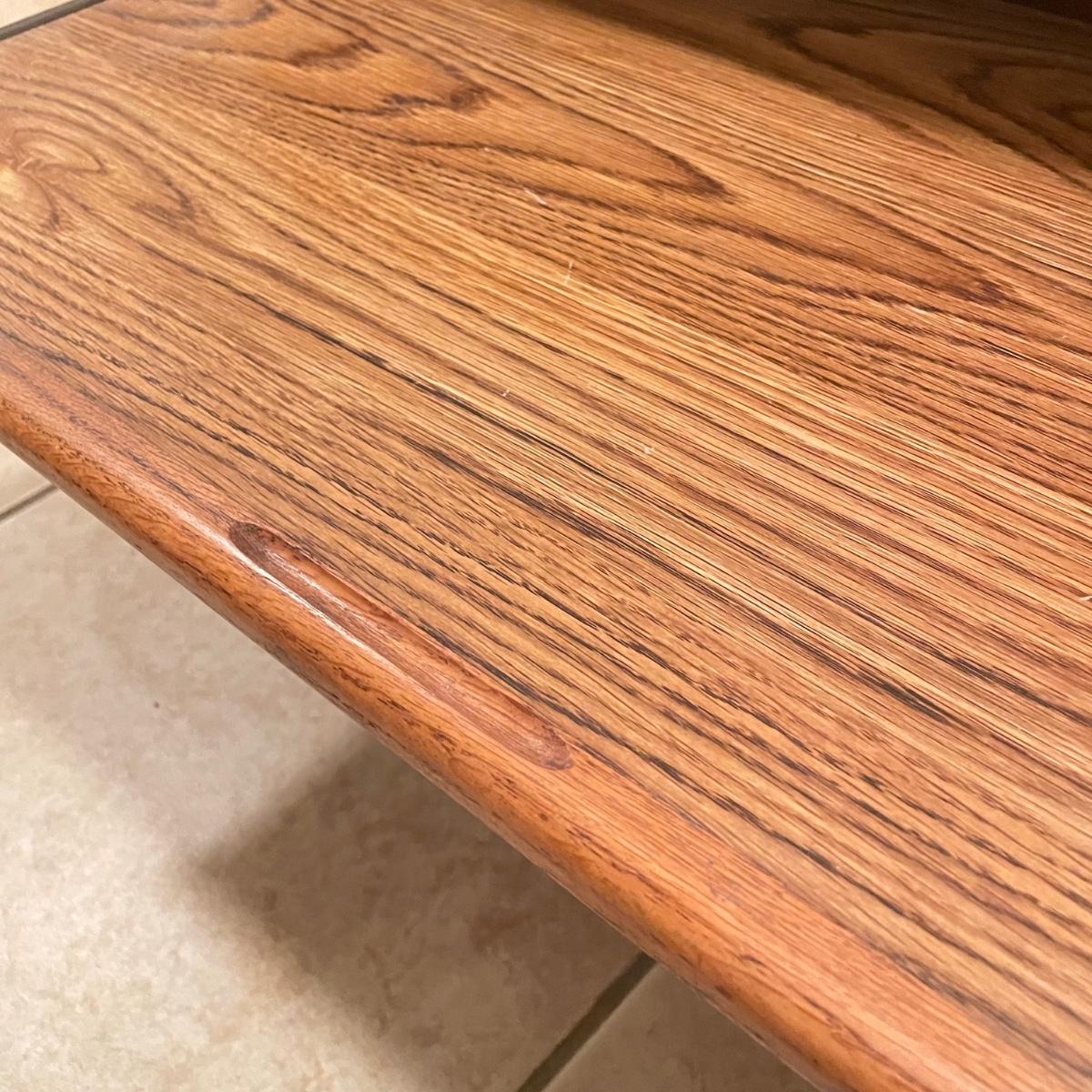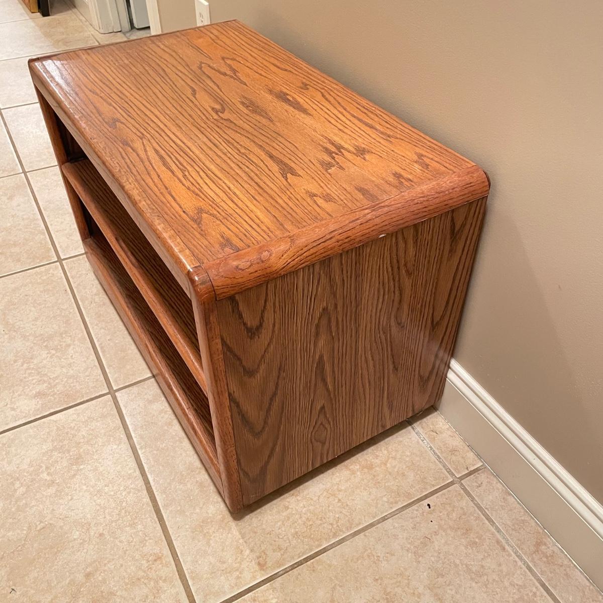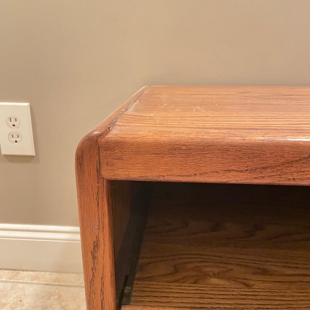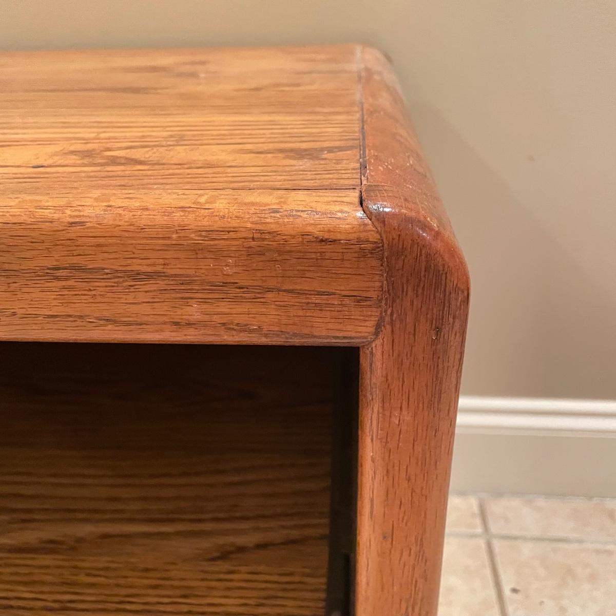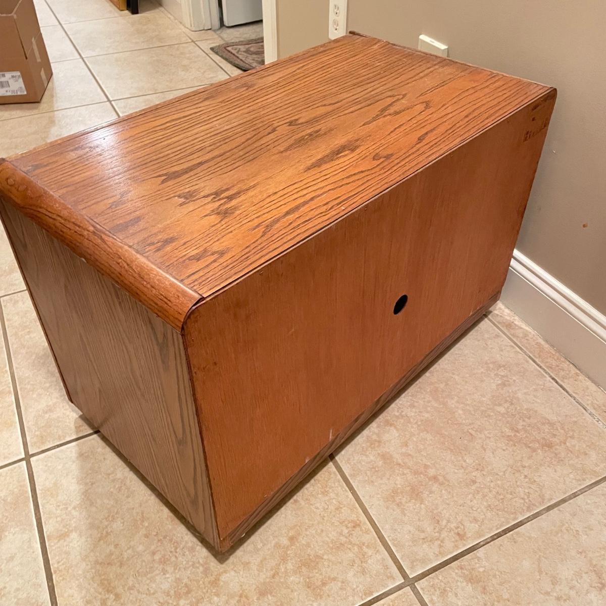 A short, rounded, rolling shelf. Unit has one middle shelf on tracks letting it slide out. Piece has usual wear, and also a small area of bowed wood on the top- see photos. It measures 30” x 16.5” x 19”H. Local pick up only.