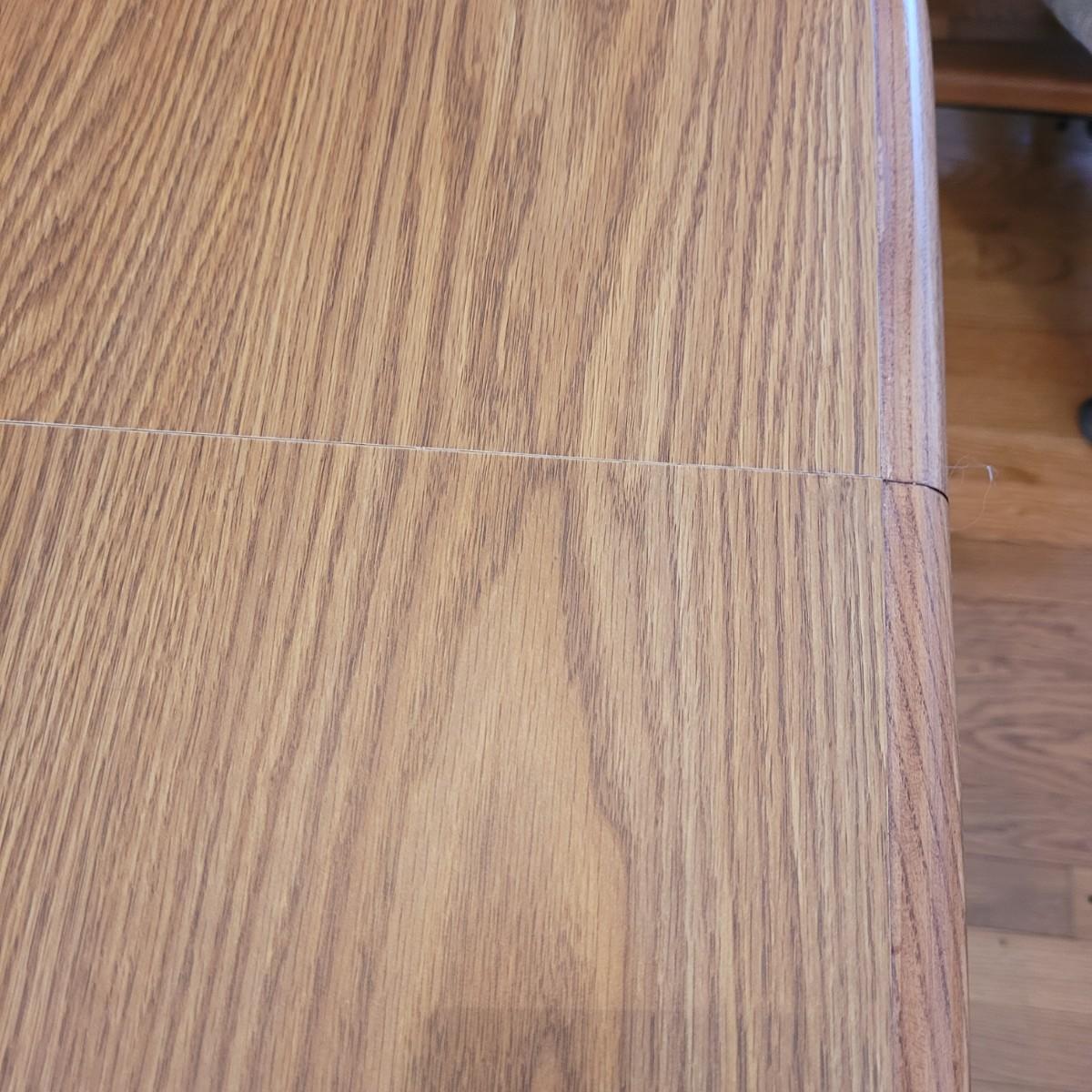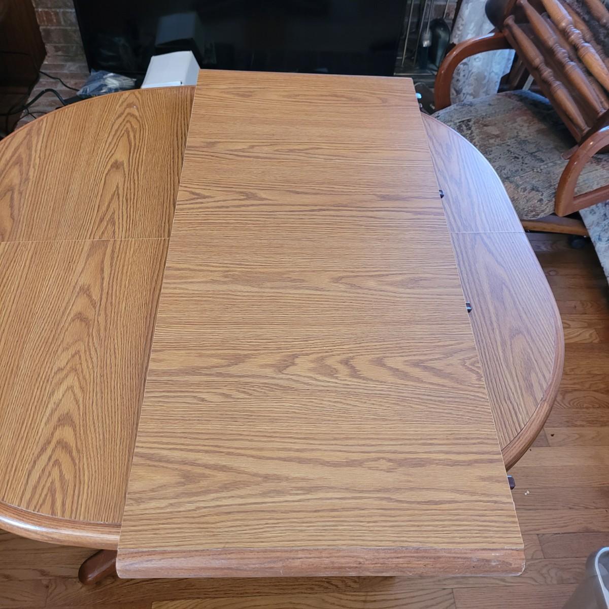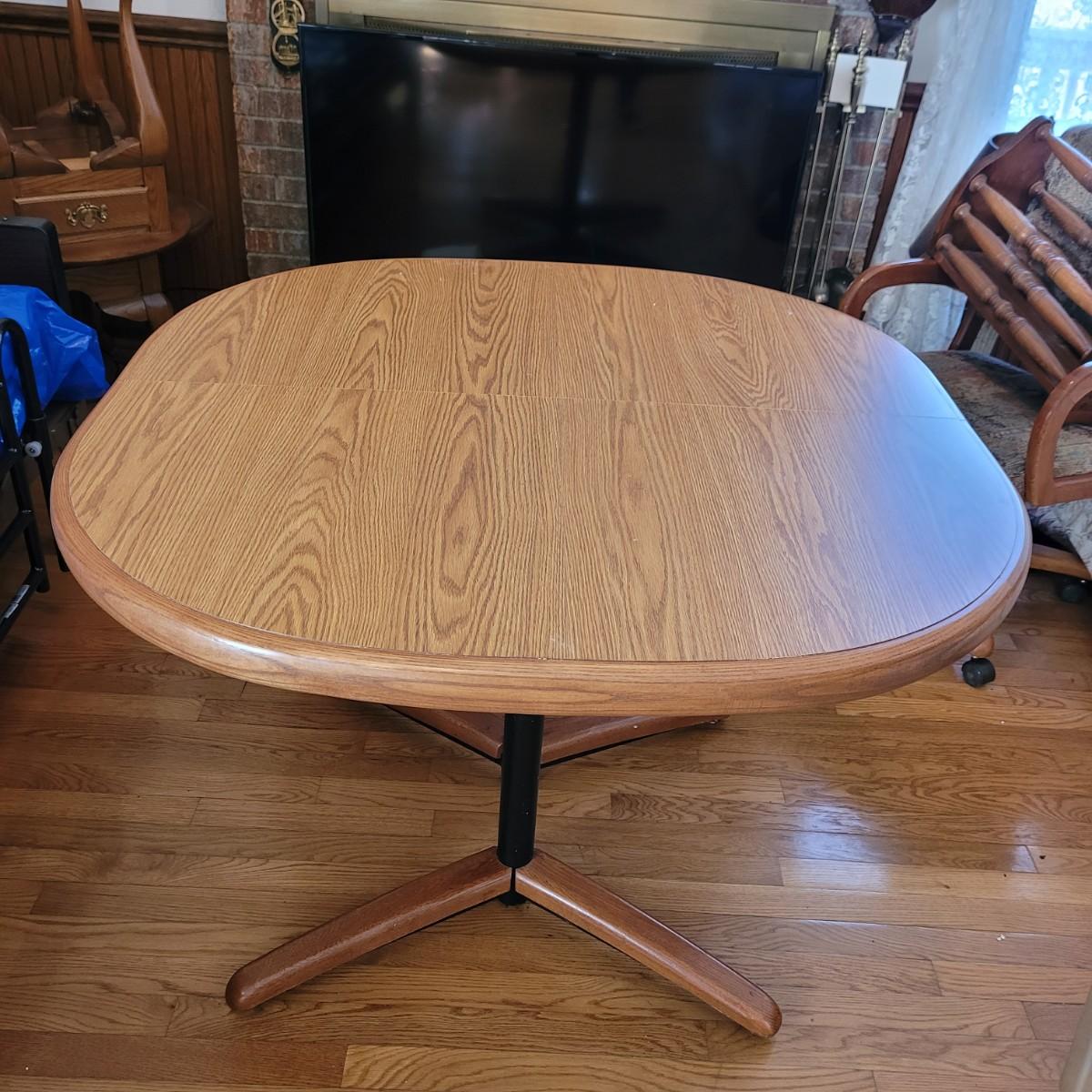 This wood veneer rounded edge table has an extra 18" wide leaf. Without leaf, table measures approximately 40" square x 29.5"H. Local pickup only. Winning bidder must bring assistance to help move and load this item due to its weight and/or size.
