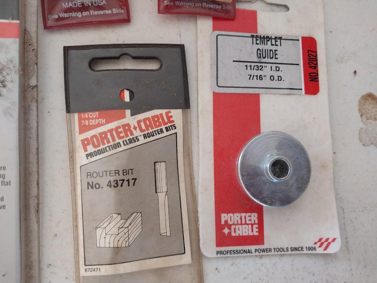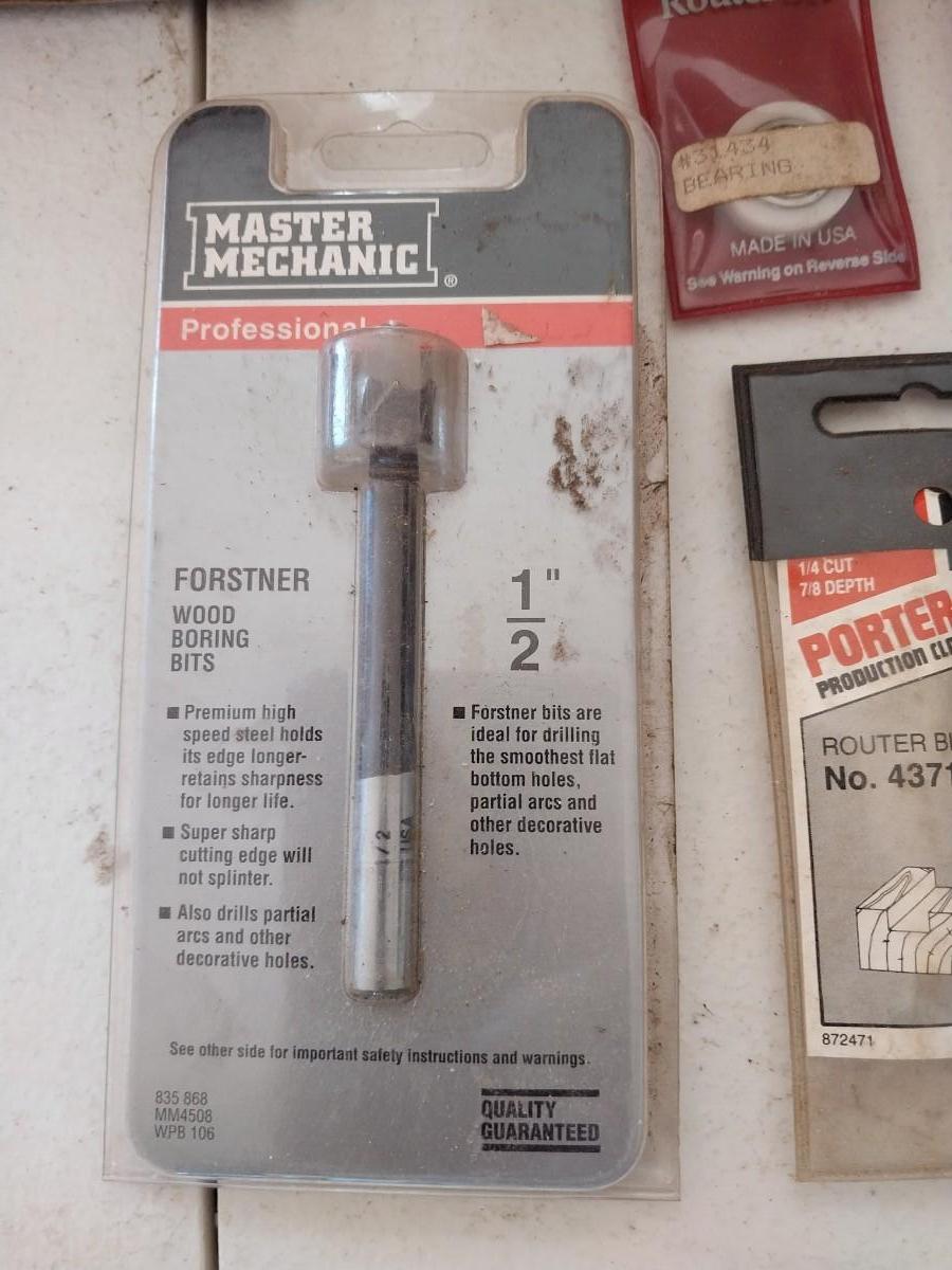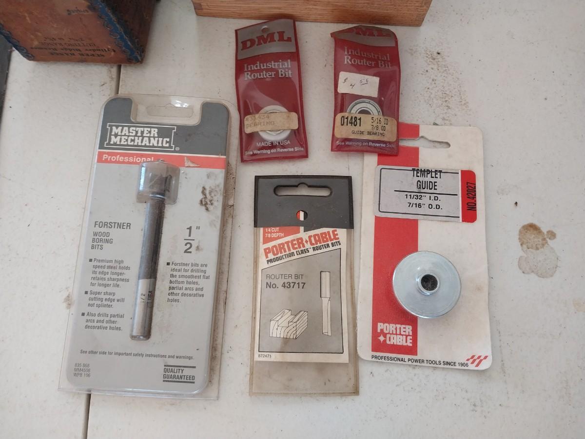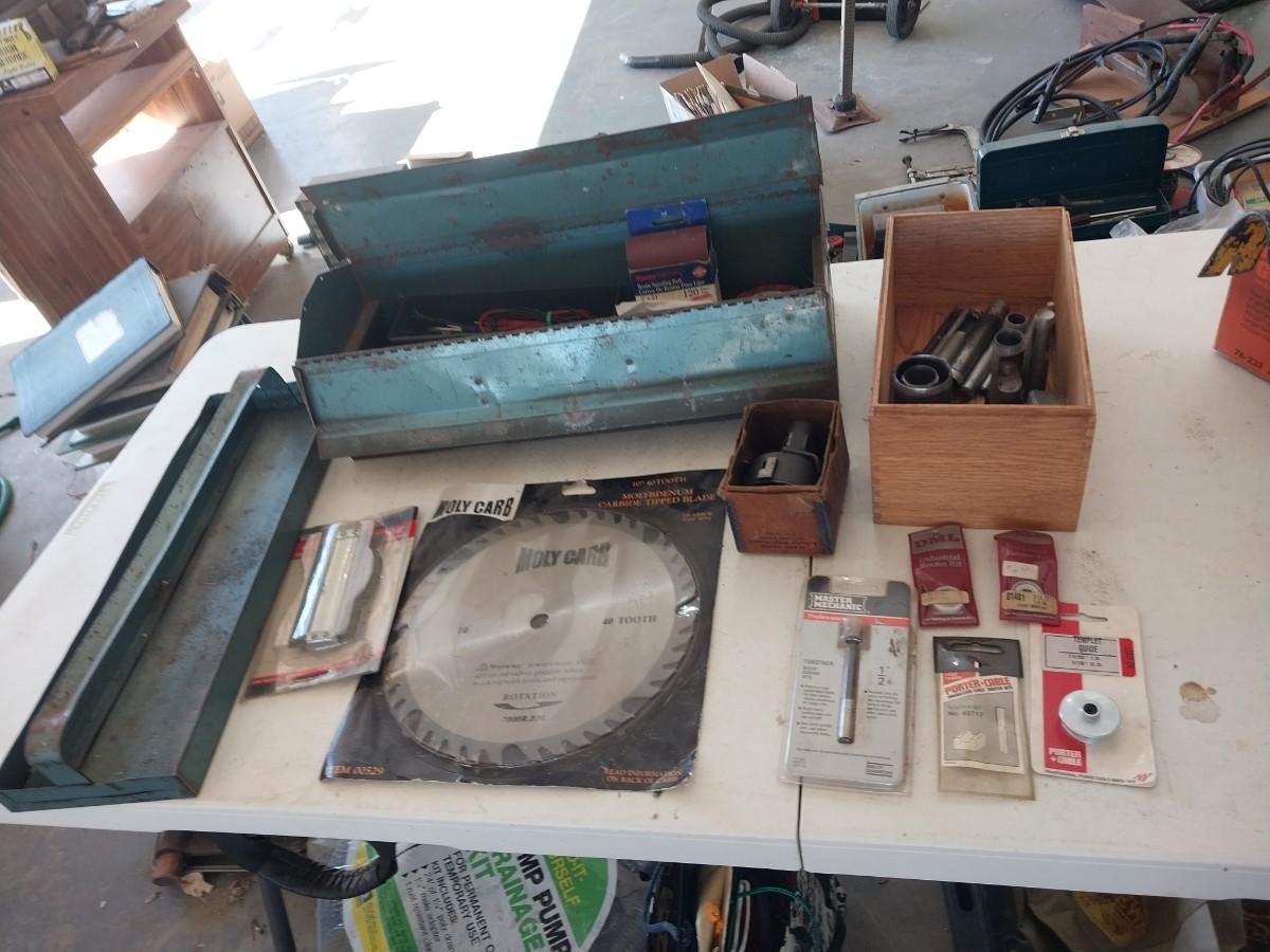 ROUTER BITS, 10" SAW BLADE, METAL TOOL BOX AND MORE