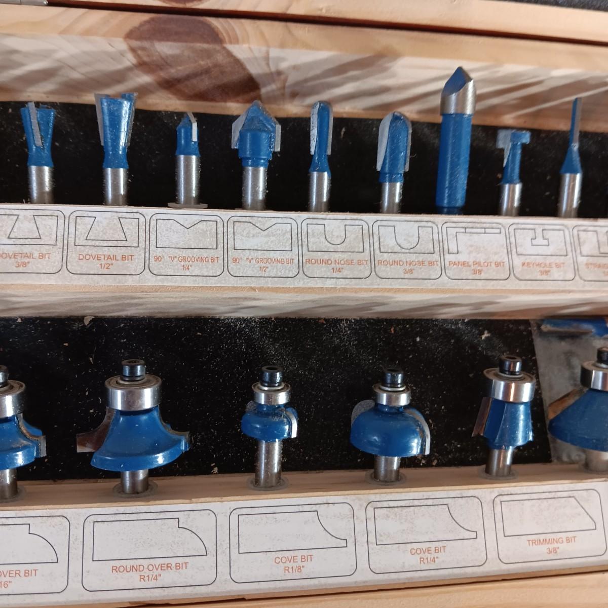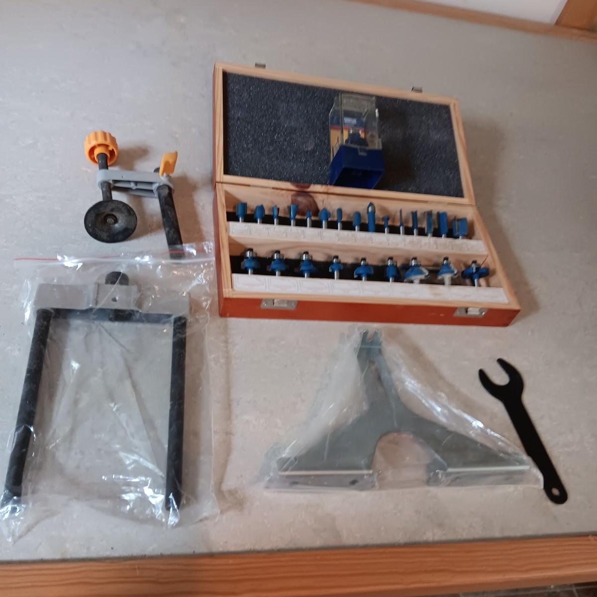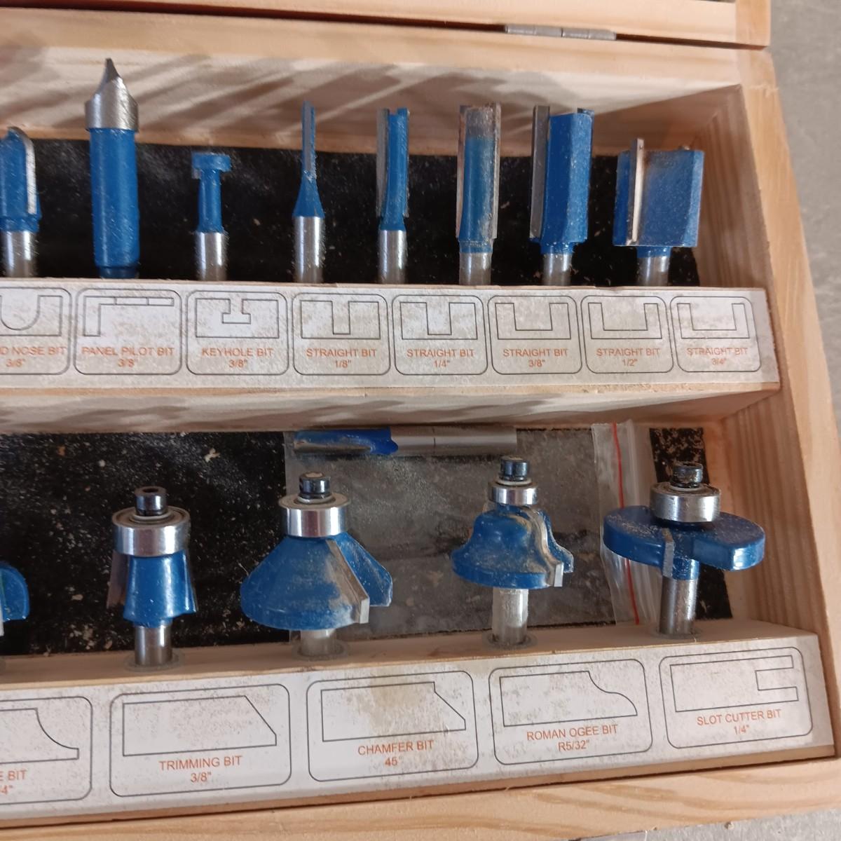 ROUTER BITS IN WOODEN BOX AND PARTS