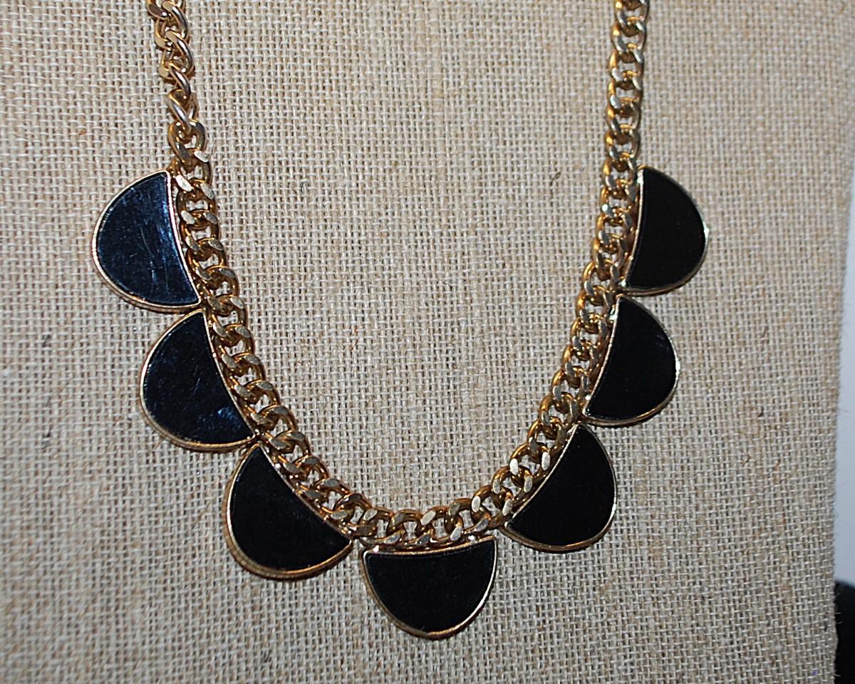 Row of 7 Black & Gold Colored HALF CIRCLES NECKLACE with Solid Link Gold Tone Chain and Lobster Clasp