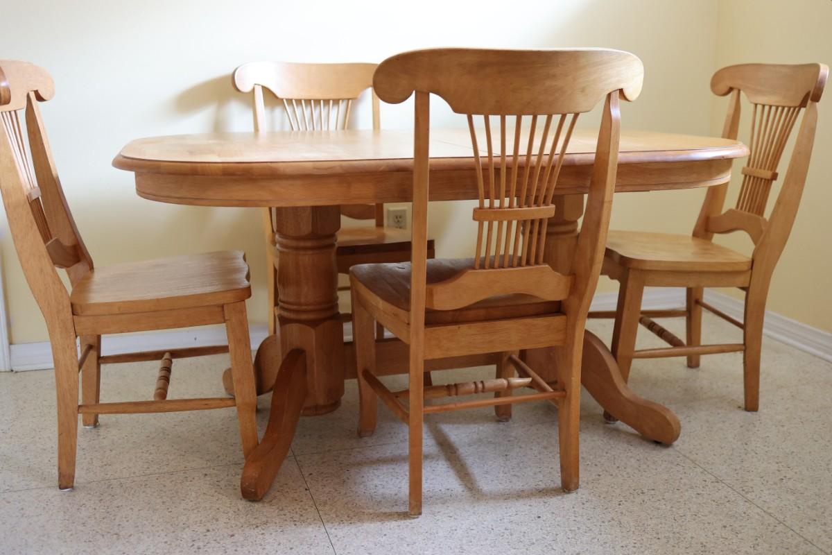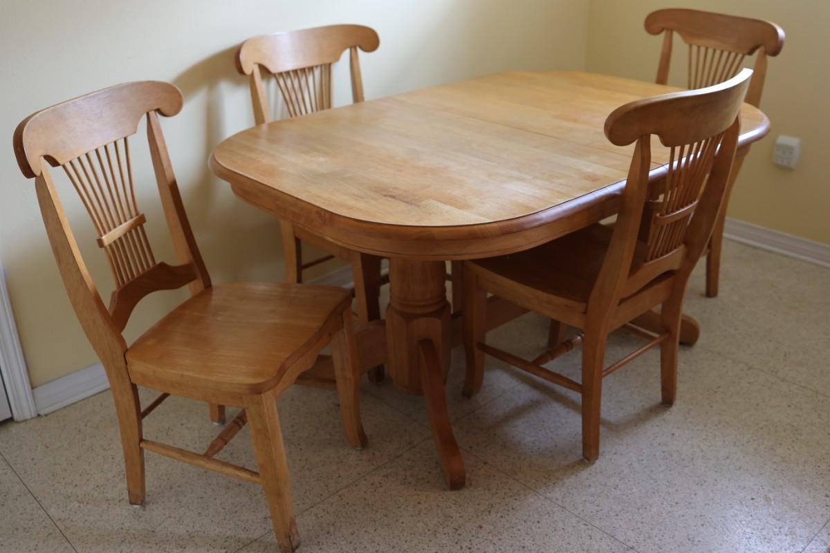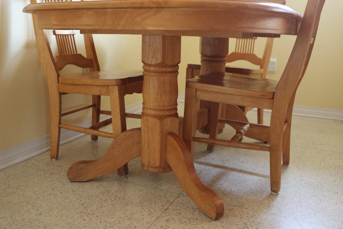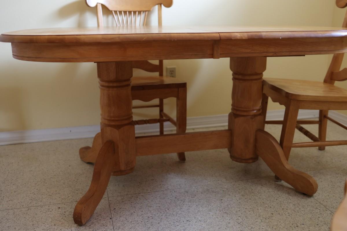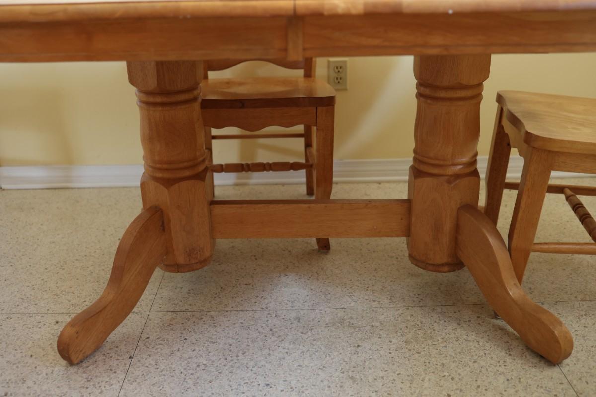 Solid Table has six chairs and extra leaf. The extra leaf has a damage on one end and it is pictured. Please see any wear on the top of table. Chairs do have some scuffs on bottom of the legs. Solid table!