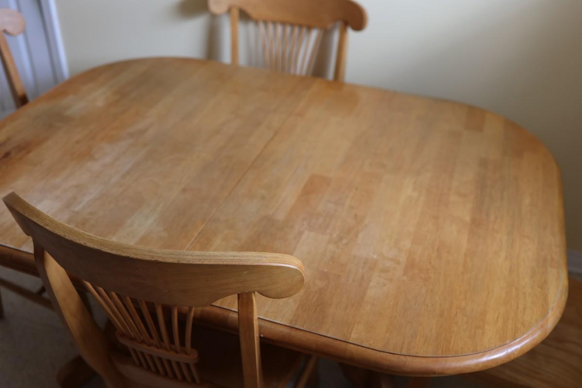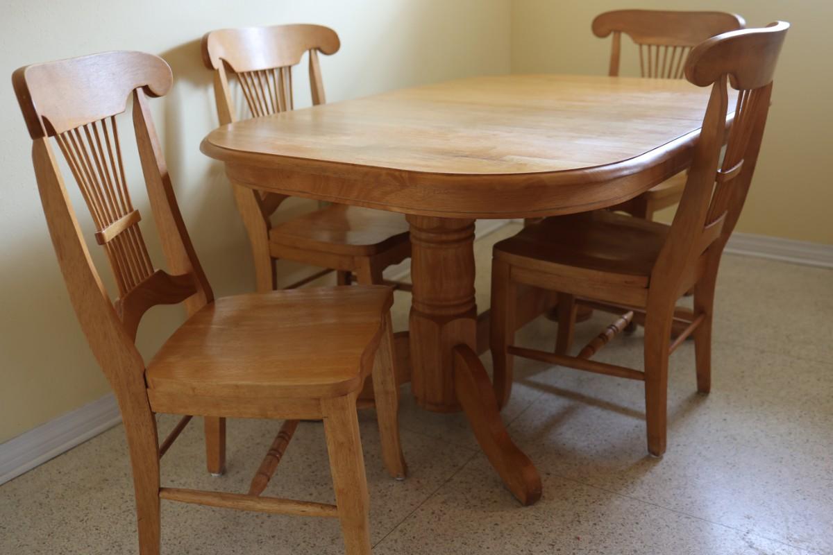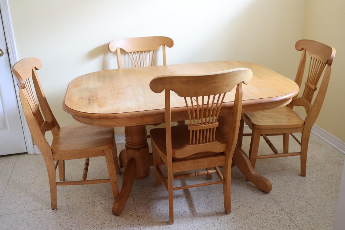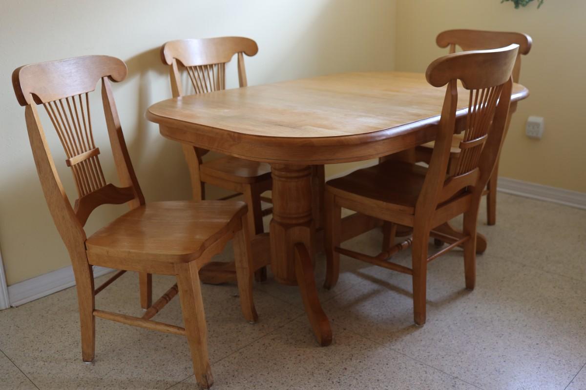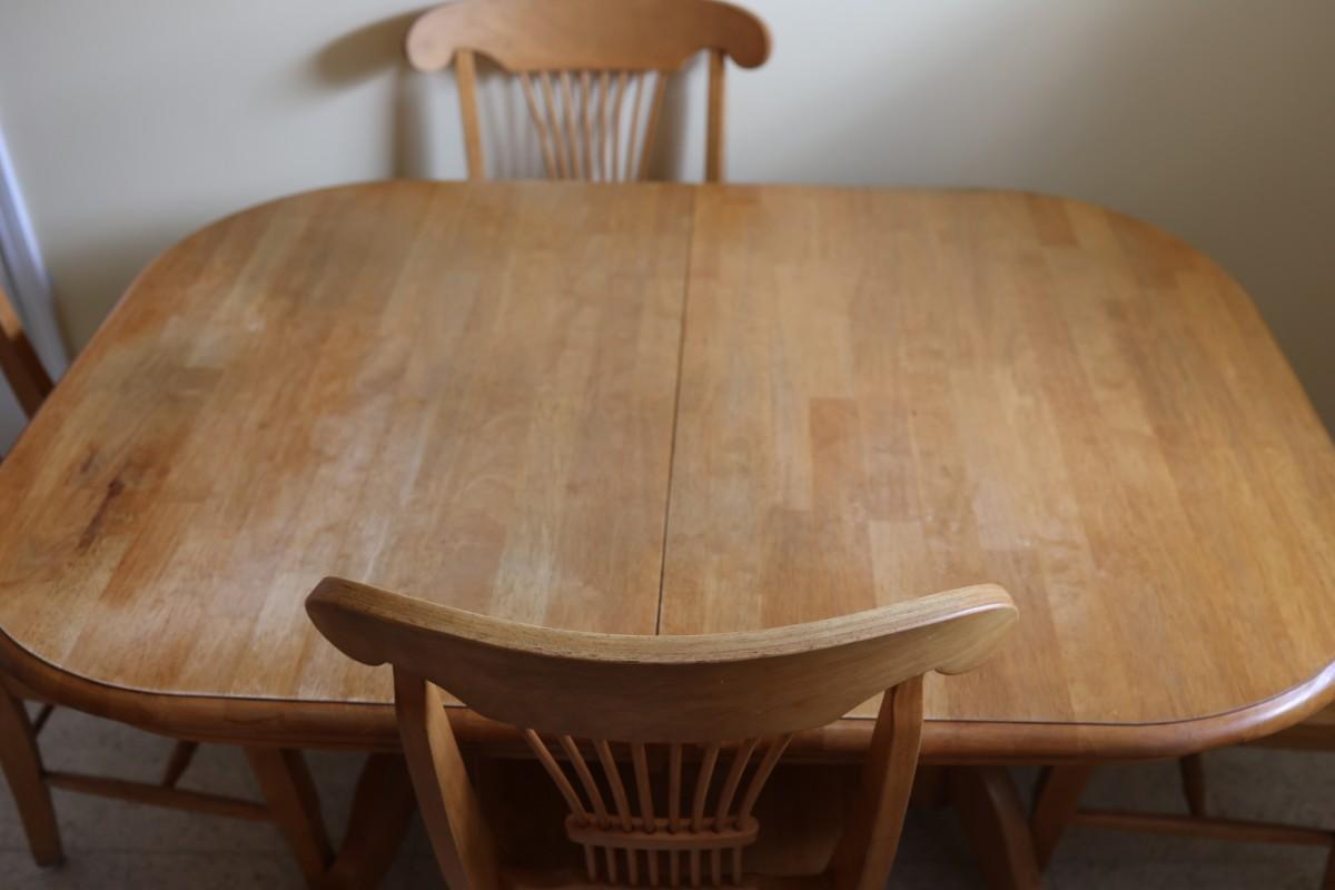 Solid Table has six chairs and extra leaf. The extra leaf has a damage on one end and it is pictured. Please see any wear on the top of table. Chairs do have some scuffs on bottom of the legs. Solid table!