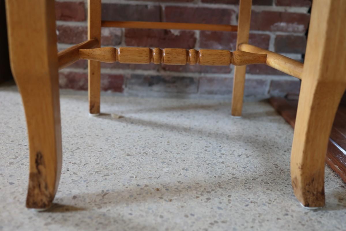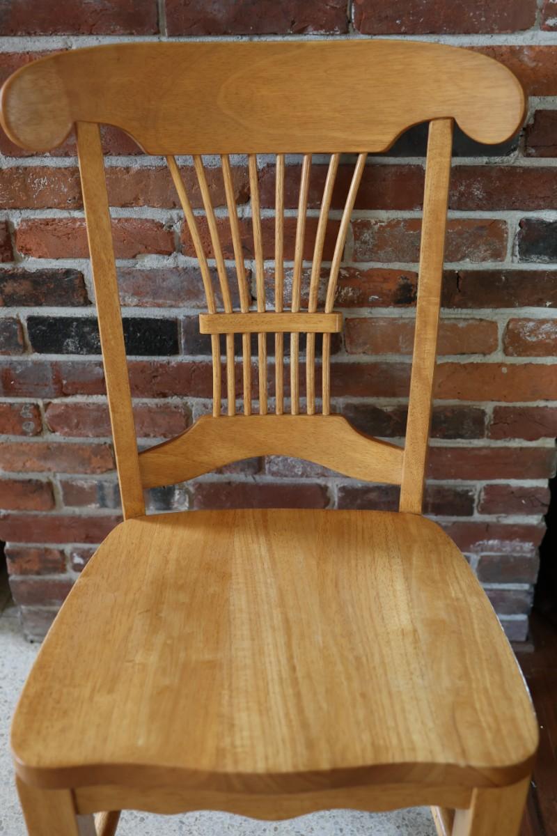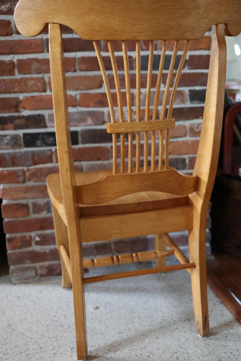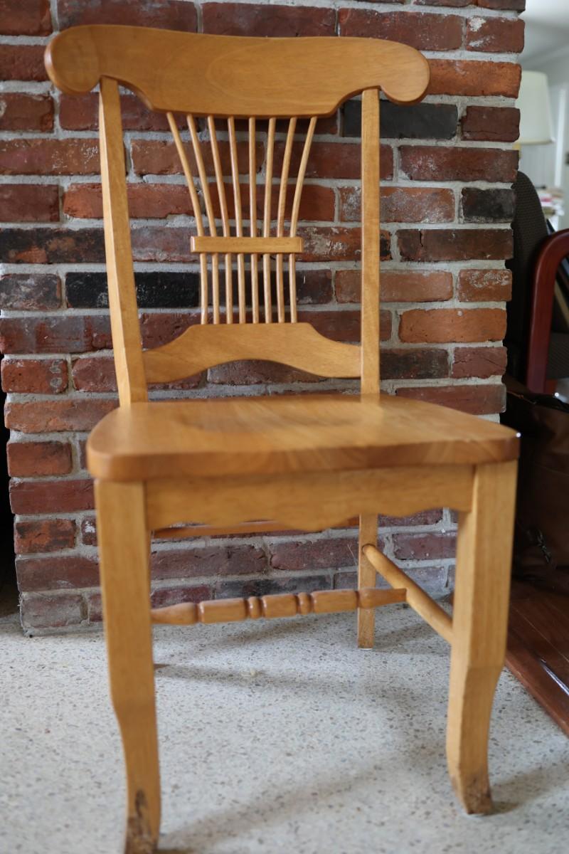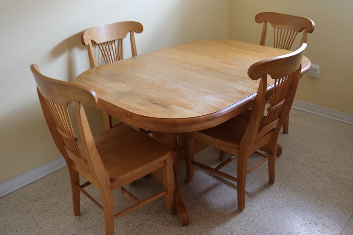 Solid Table has six chairs and extra leaf. The extra leaf has a damage on one end and it is pictured. Please see any wear on the top of table. Chairs do have some scuffs on bottom of the legs. Solid table!