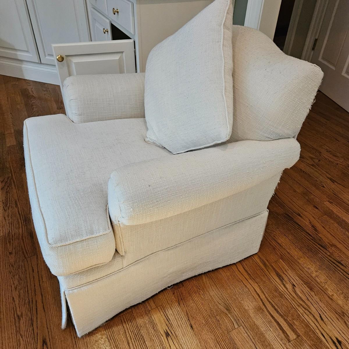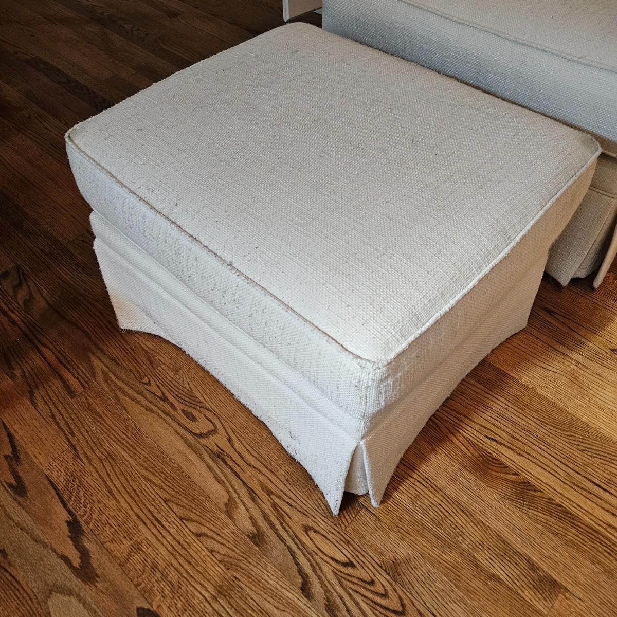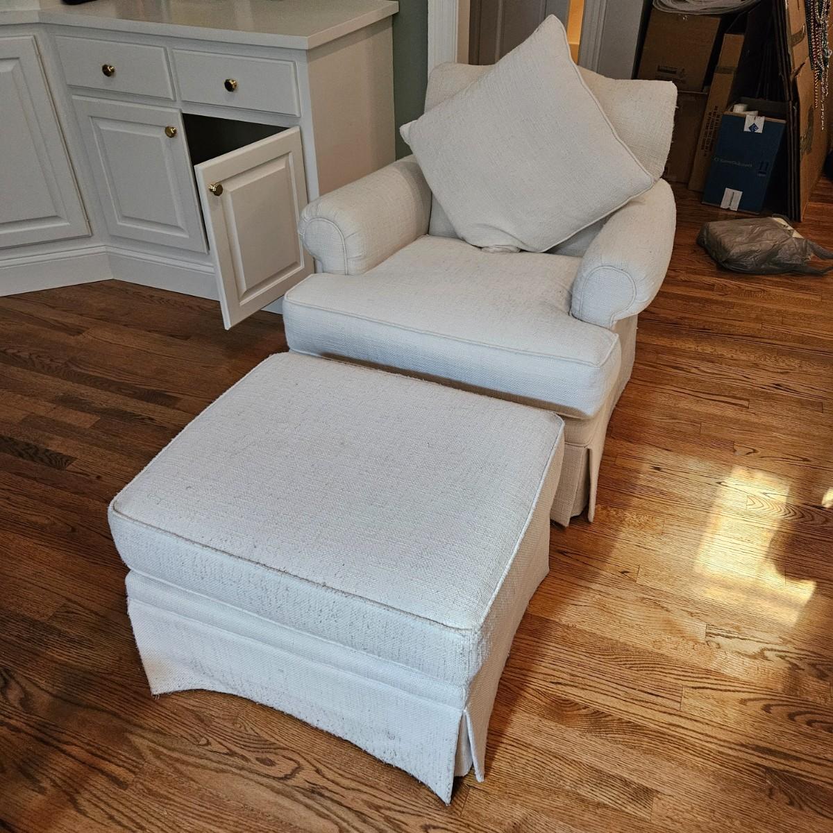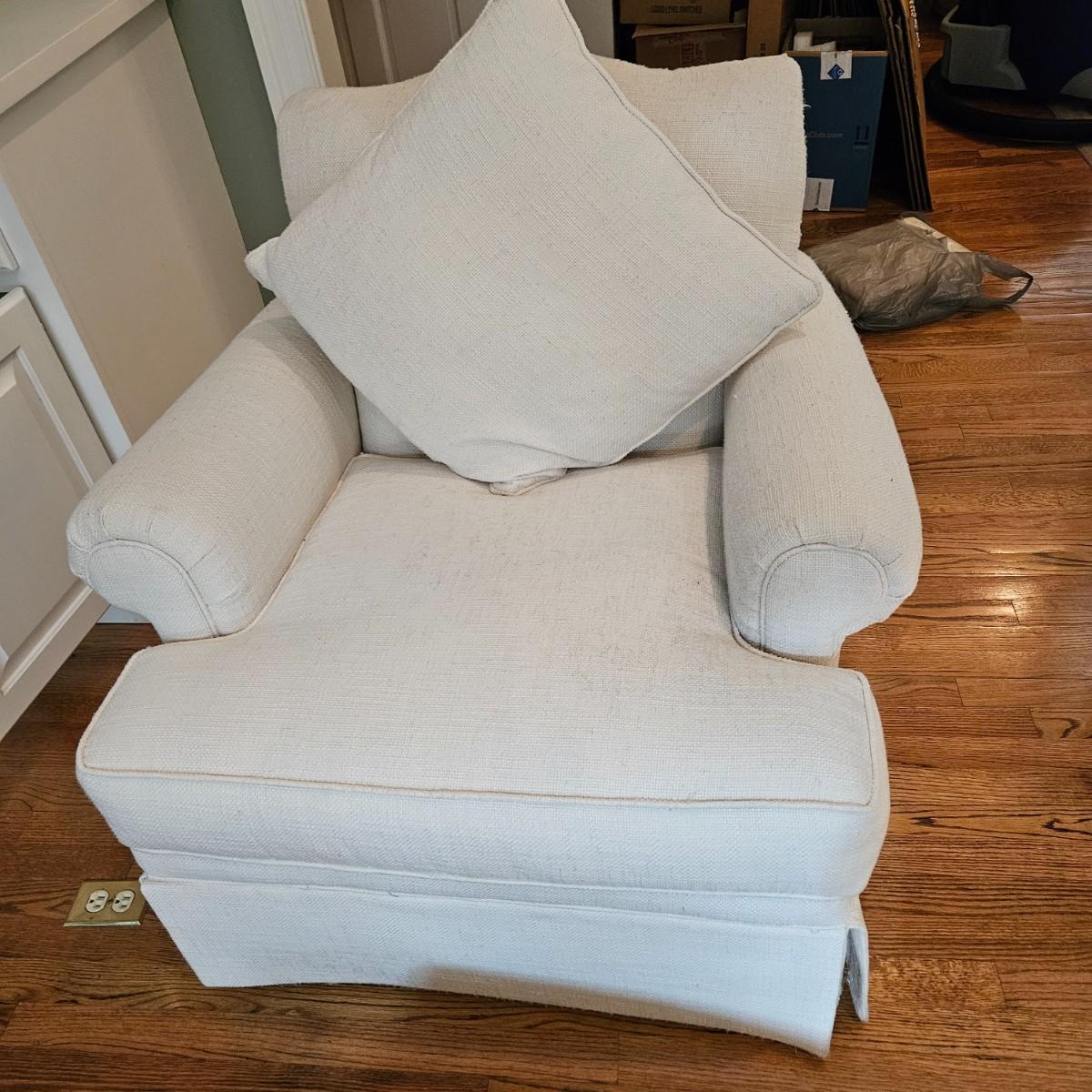 A Rowe Furniture upholstered chair and footstool with a soft, white fabric. It measures approximately 36" x 36" x 34"H with a seat height 19". There are some fabric pulls on the back corner and some minor stains, see attached pictures for more detail. Local pickup only. Winning bidder must bring assistance to help move and load this item due to its weight and/or size.