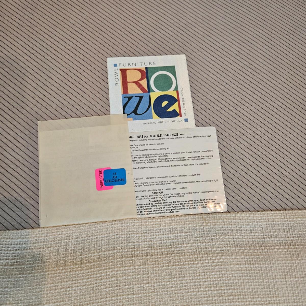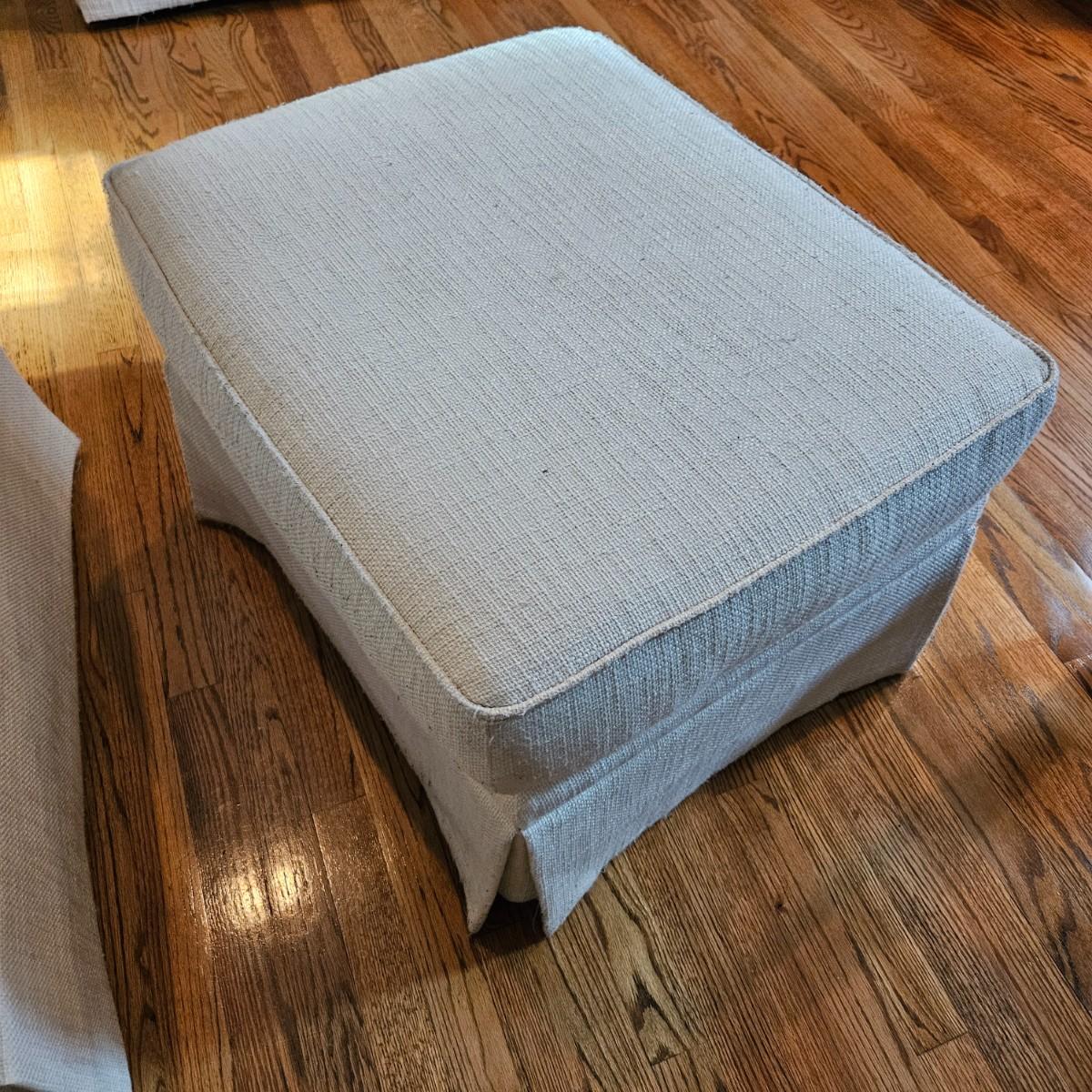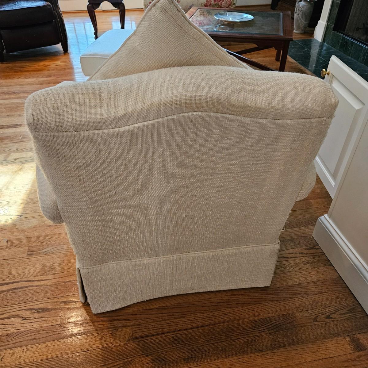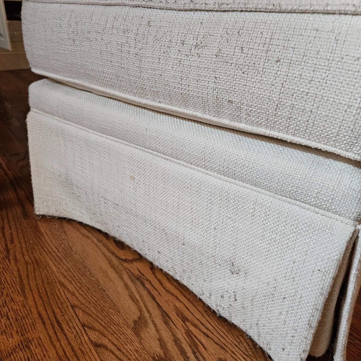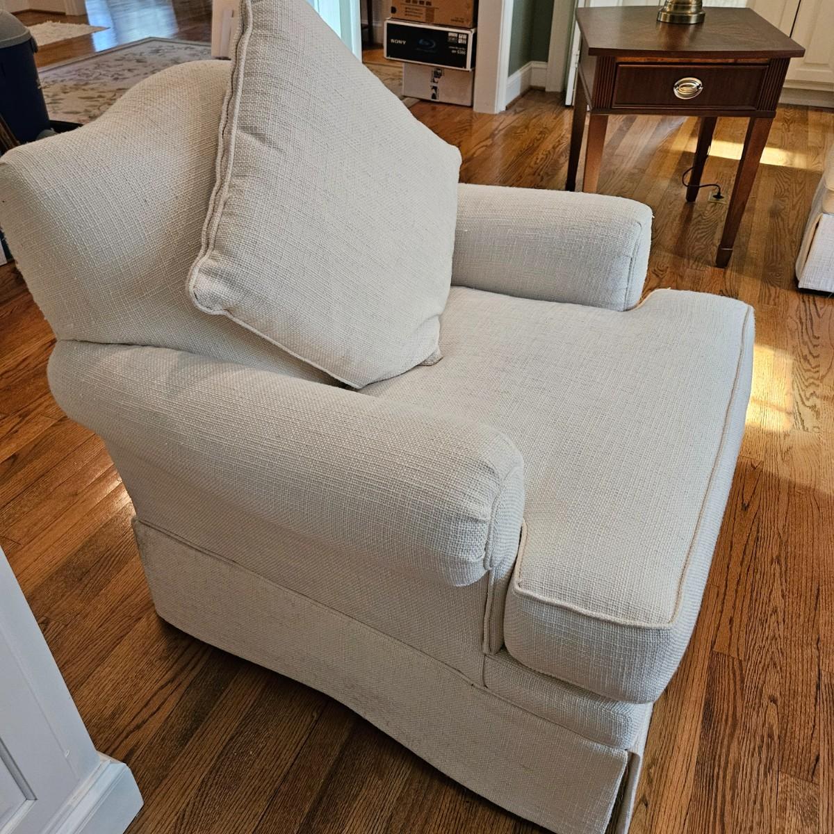 A Rowe Furniture upholstered chair and footstool with a soft, white fabric. It measures approximately 36" x 36" x 34"H with a seat height 19". There are some fabric pulls on the back corner and some minor stains, see attached pictures for more detail. Local pickup only. Winning bidder must bring assistance to help move and load this item due to its weight and/or size.