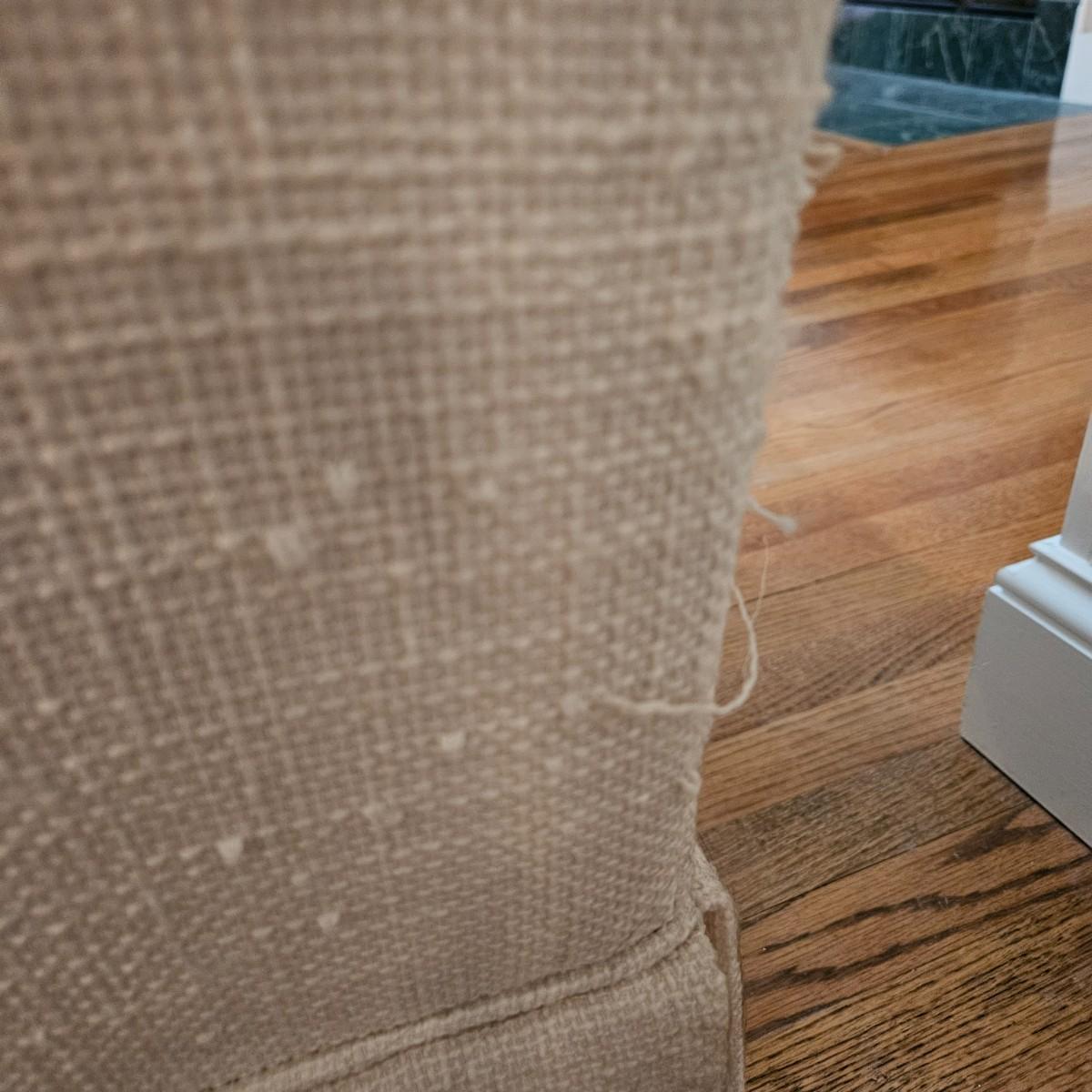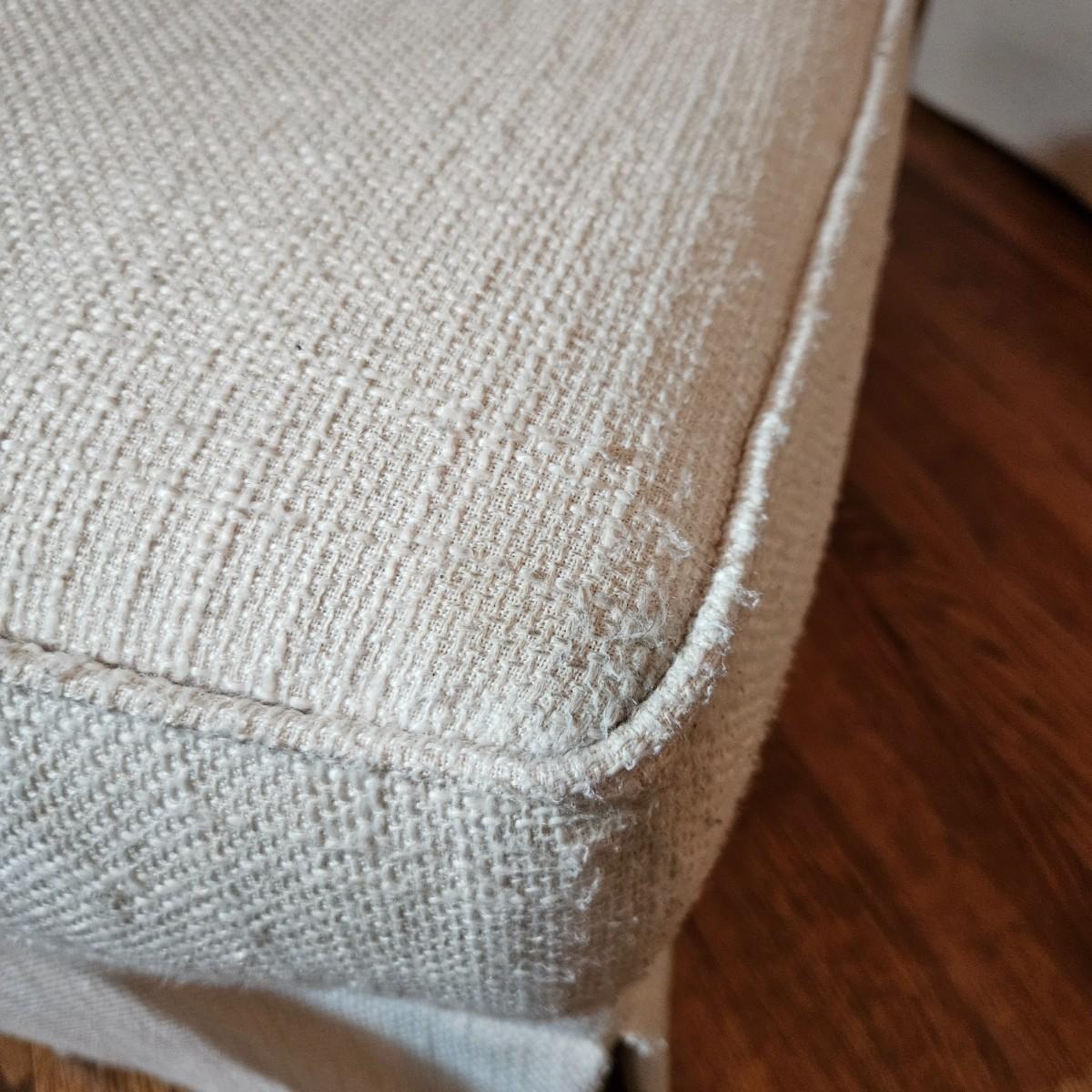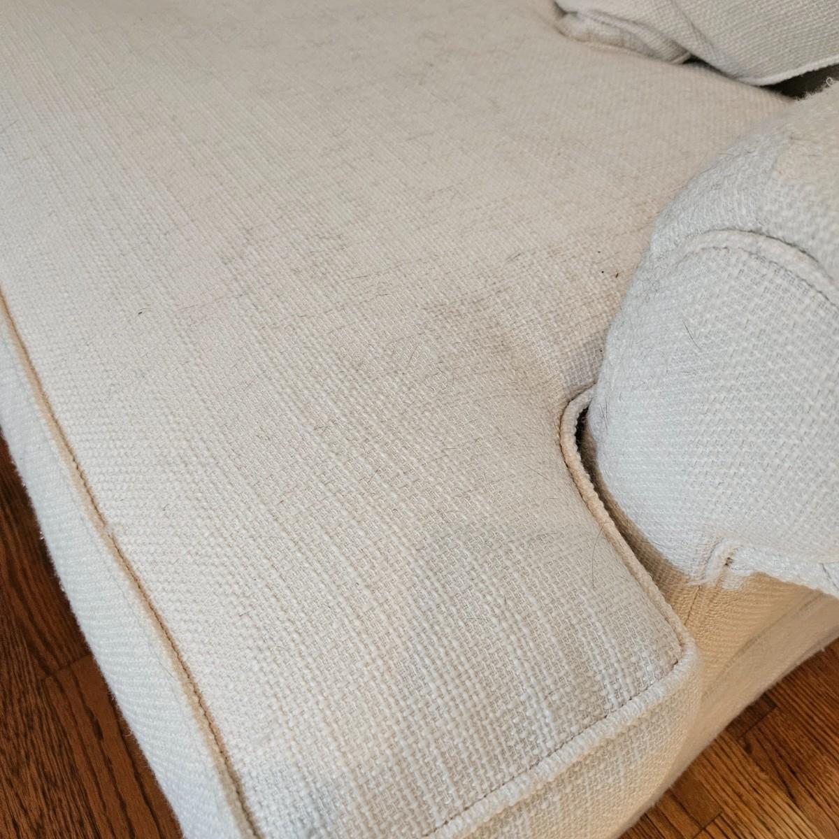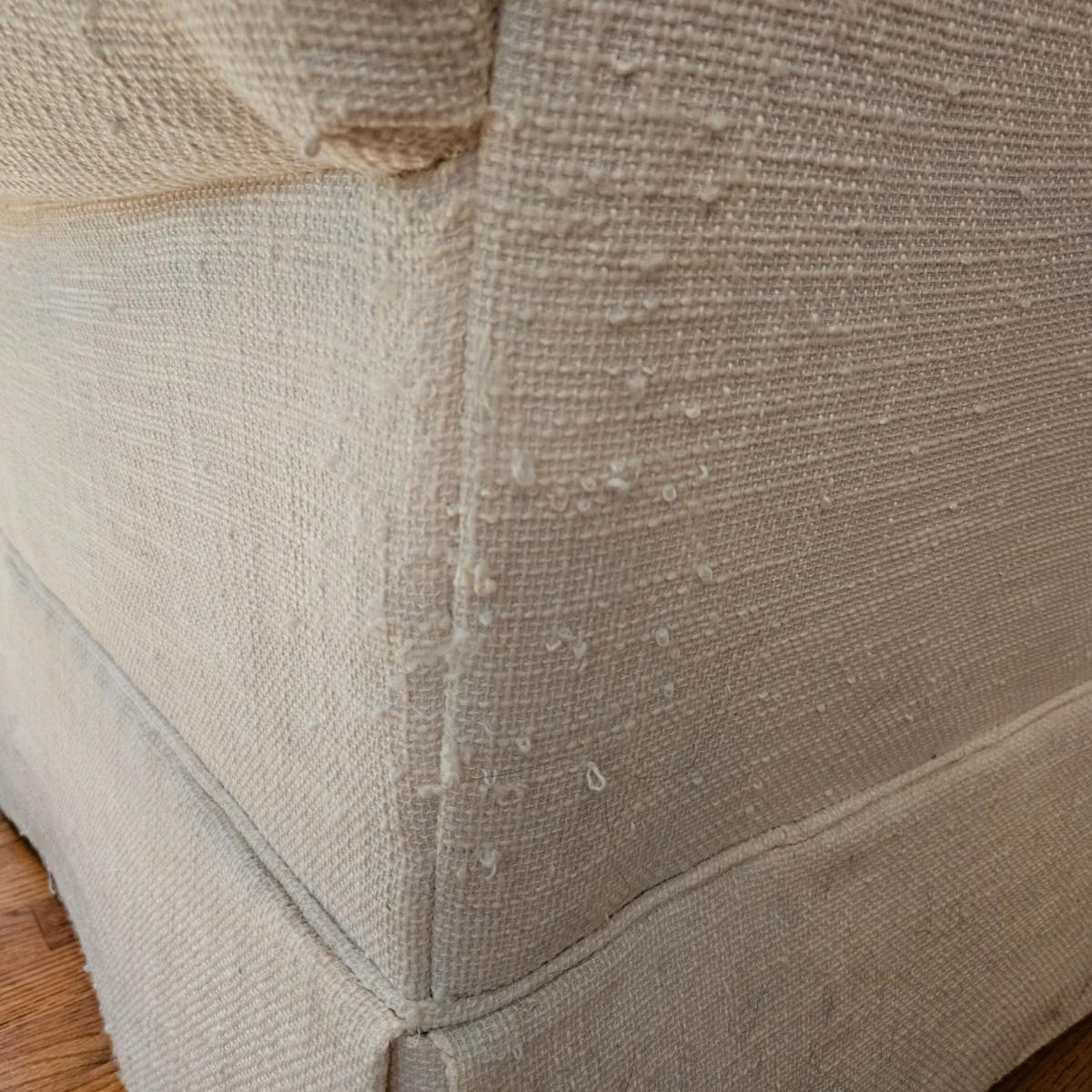 A Rowe Furniture upholstered chair and footstool with a soft, white fabric. It measures approximately 36" x 36" x 34"H with a seat height 19". There are some fabric pulls on the back corner and some minor stains, see attached pictures for more detail. Local pickup only. Winning bidder must bring assistance to help move and load this item due to its weight and/or size.