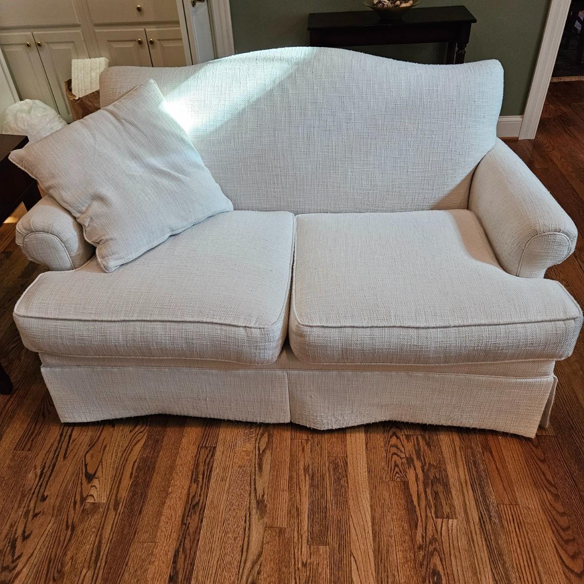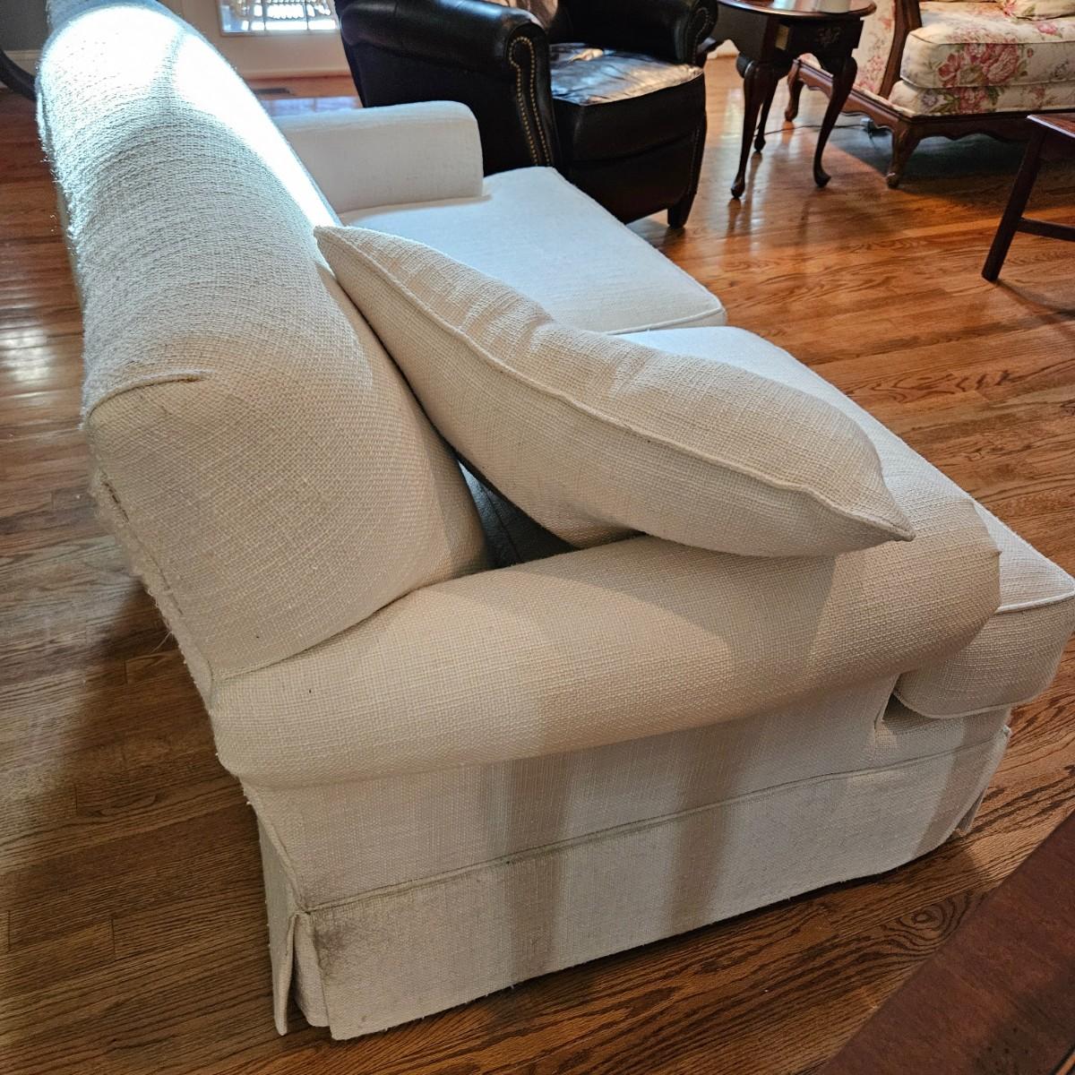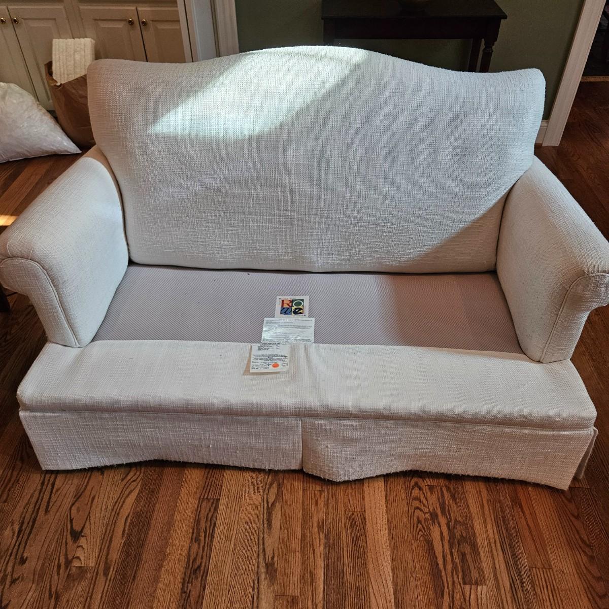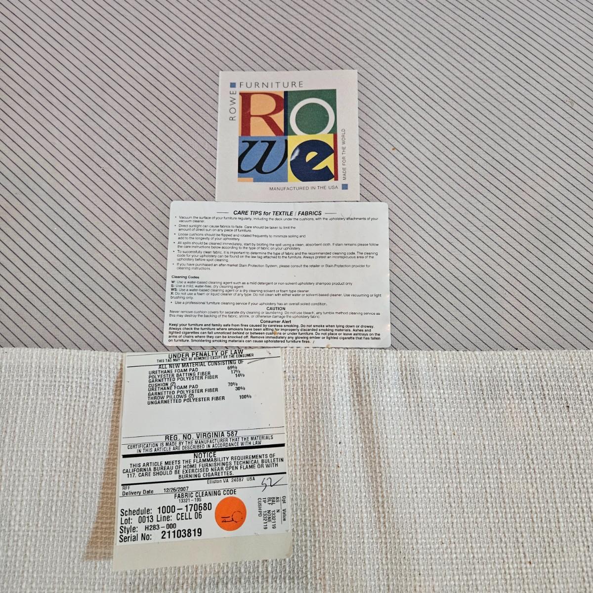 A Rowe Furniture sofa that features a soft, white upholstery and a matching pillow. It measures approximately 62" x 36" x 34.5"H with a seat height of 19"H. There are some fabric pulls on the back corners and some pet hair. Local pickup only. Winning bidder must bring assistance to help move and load this item due to its weight and/or size.