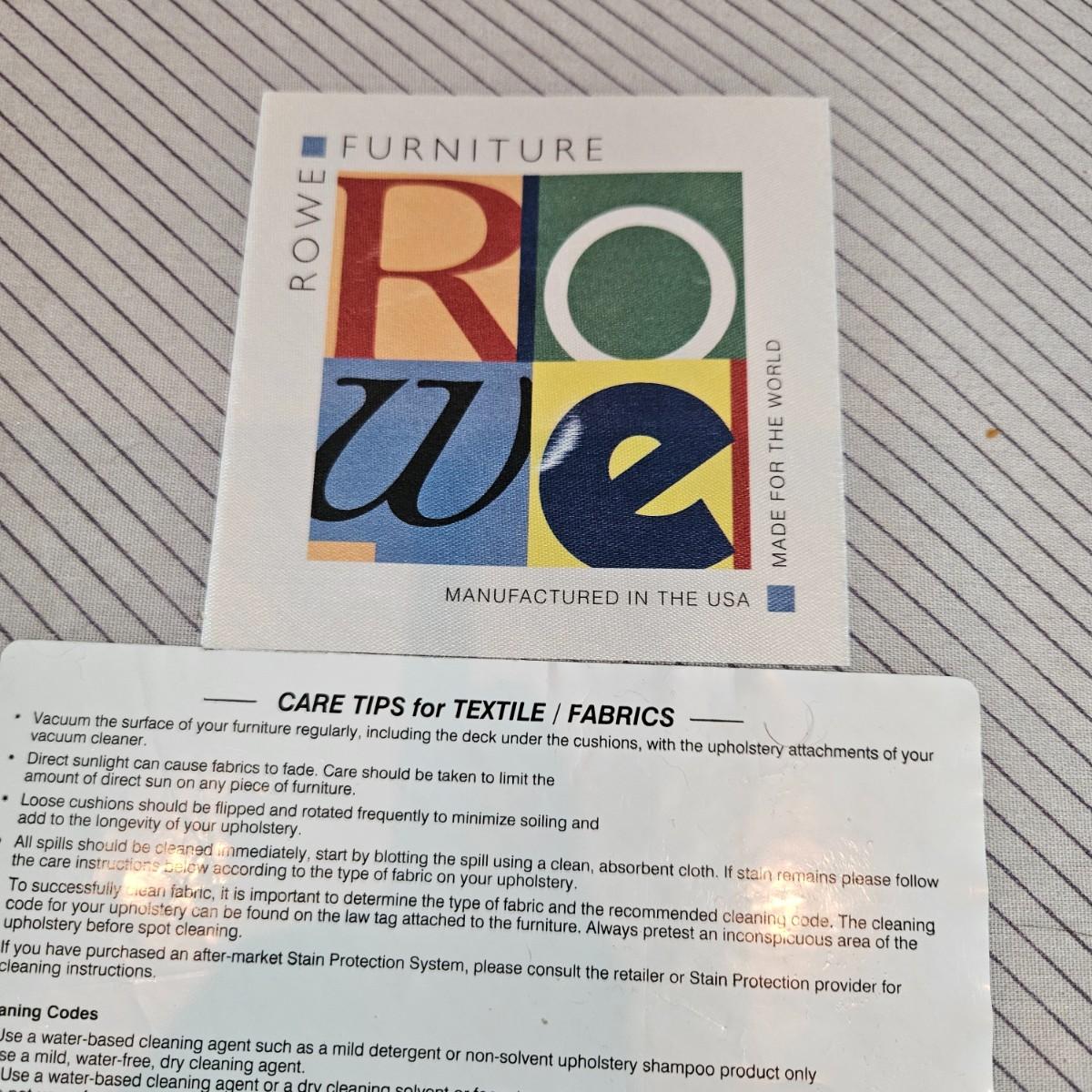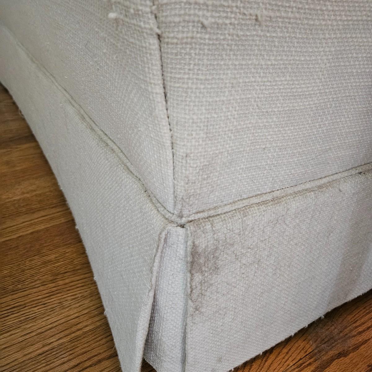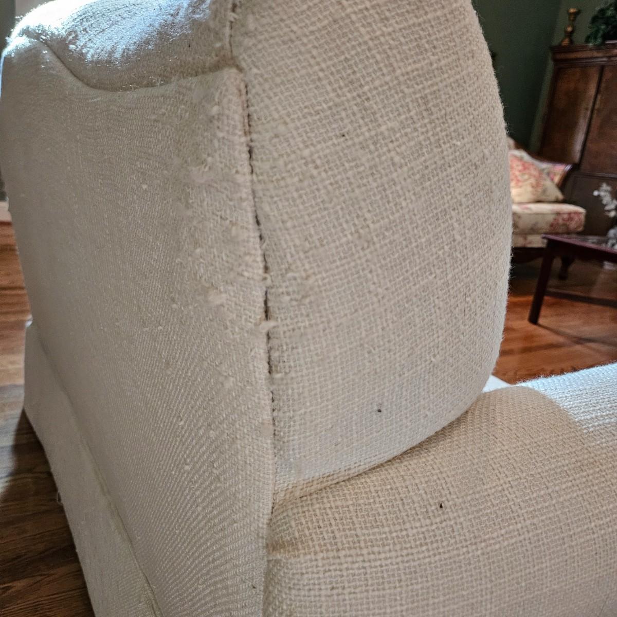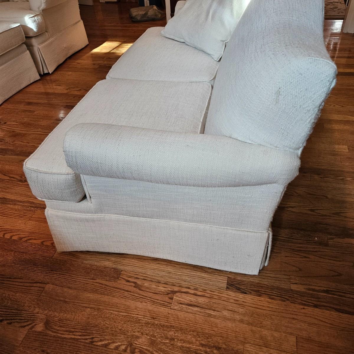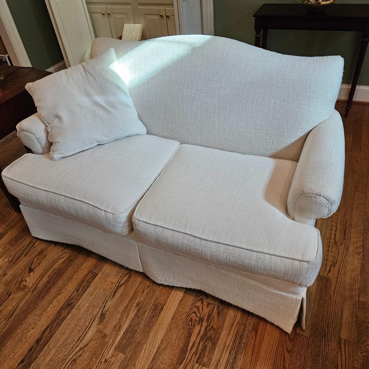 A Rowe Furniture sofa that features a soft, white upholstery and a matching pillow. It measures approximately 62" x 36" x 34.5"H with a seat height of 19"H. There are some fabric pulls on the back corners and some pet hair. Local pickup only. Winning bidder must bring assistance to help move and load this item due to its weight and/or size.