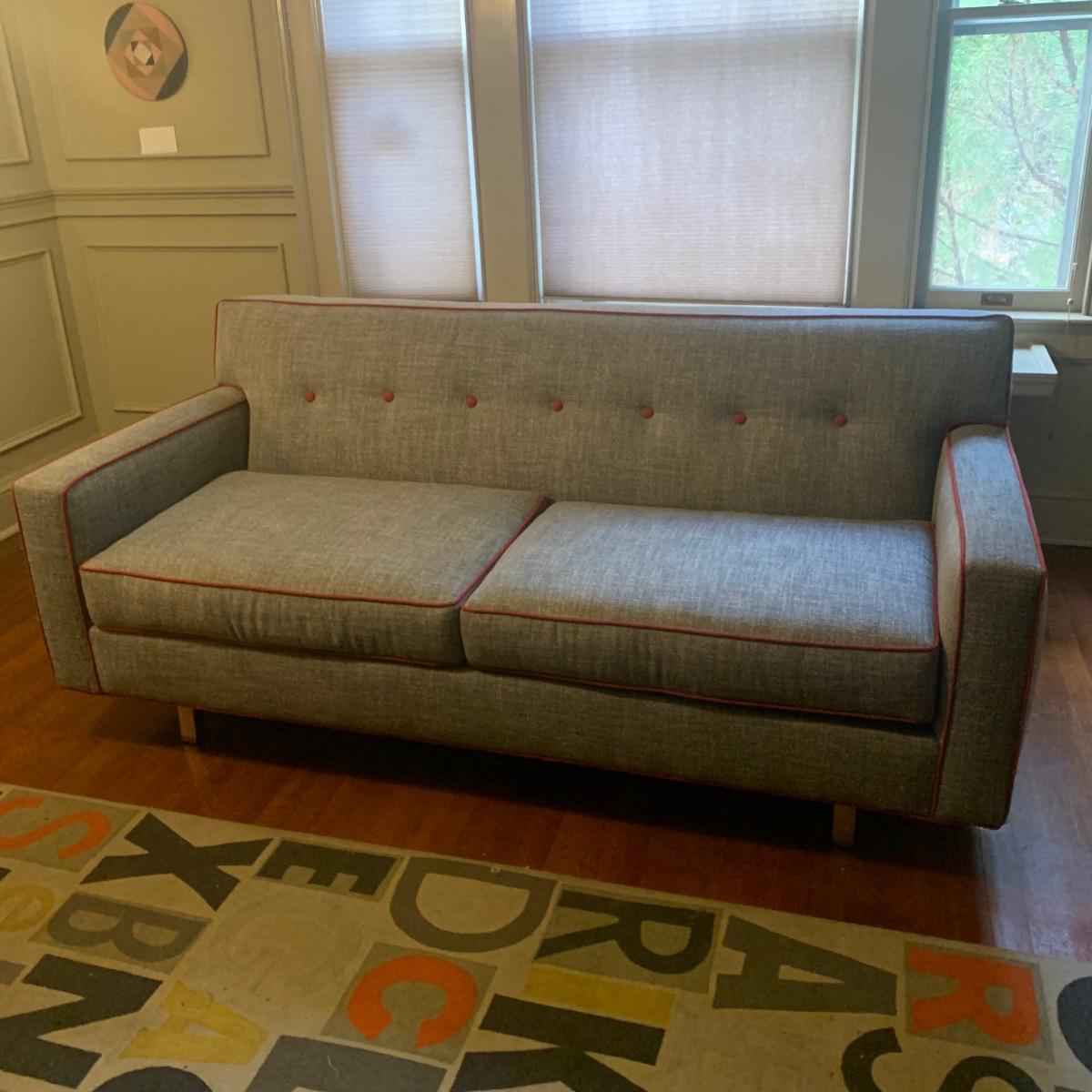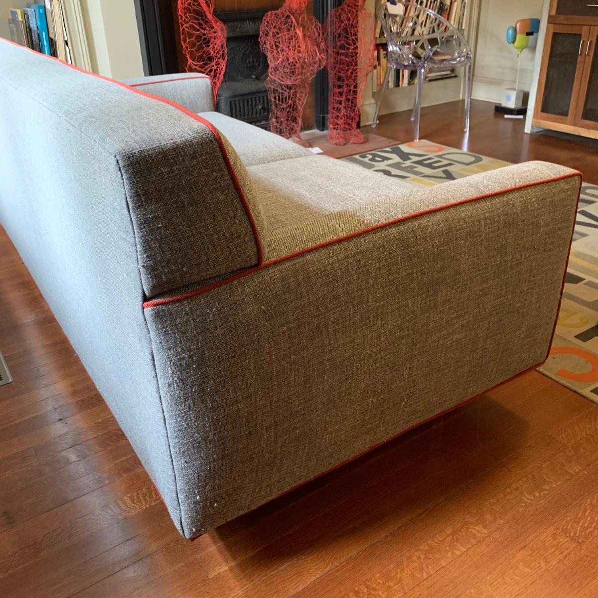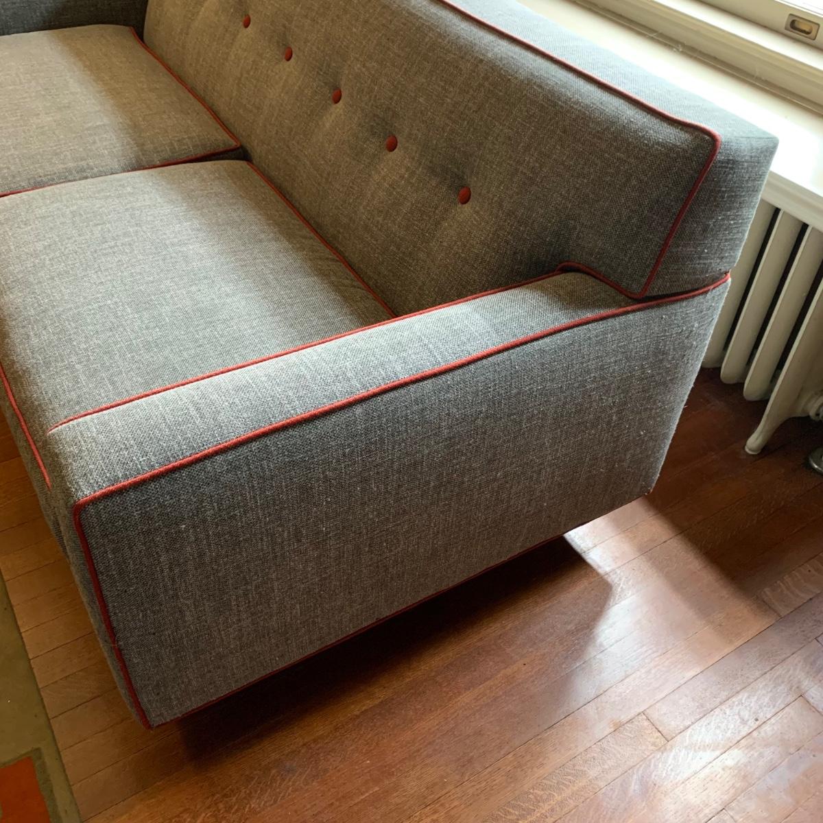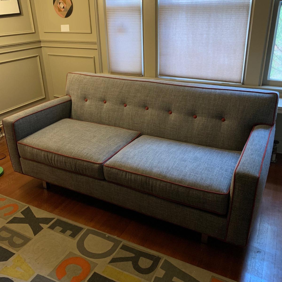 This stylish two-cushion sofa is from Rowe Furniture’s Dorset collection. It is a dark gray tweed material with a red button tufted back and eye-catching red welt cords. It features flat track arms, plush removable cushions, and exposed chrome legs. The sofa measures 73” x 36” x 32”H with a 19” seat height. Some loose threads and fraying apparent, see photos.